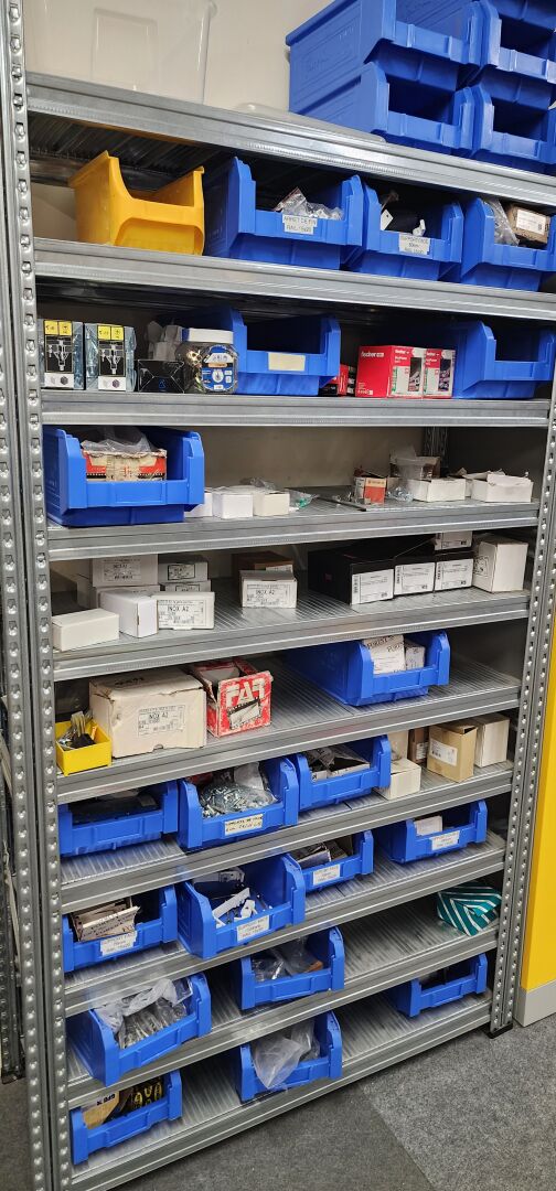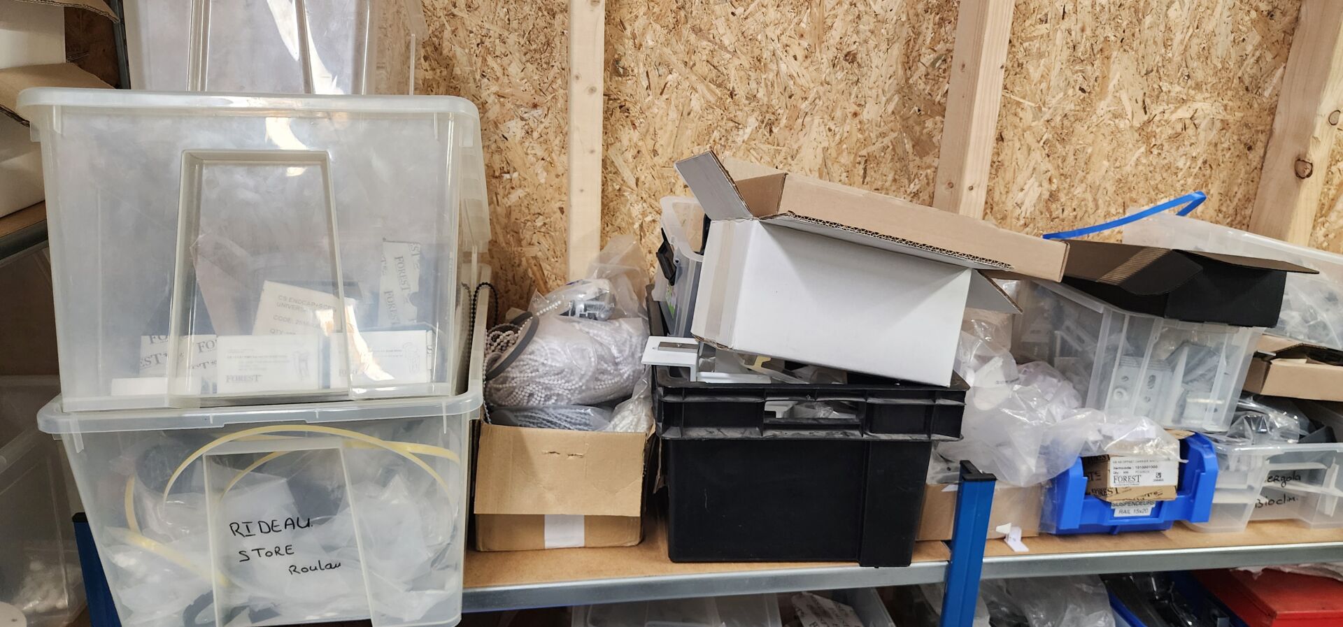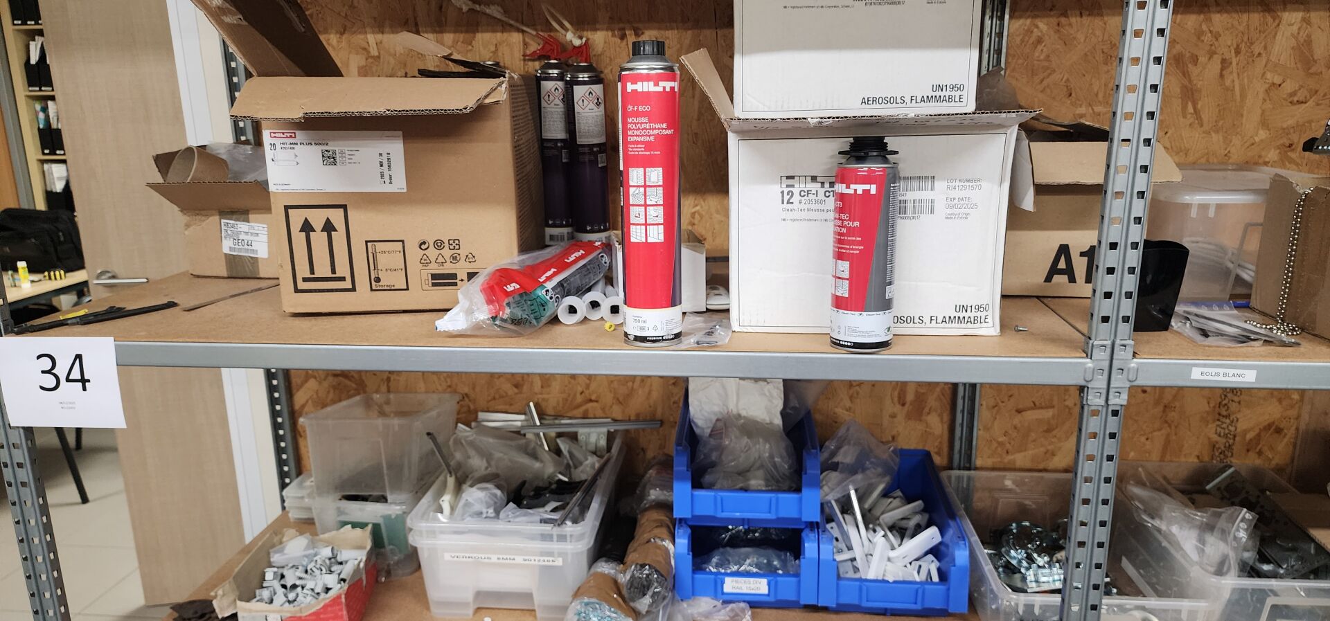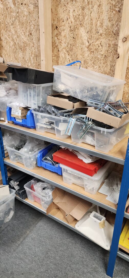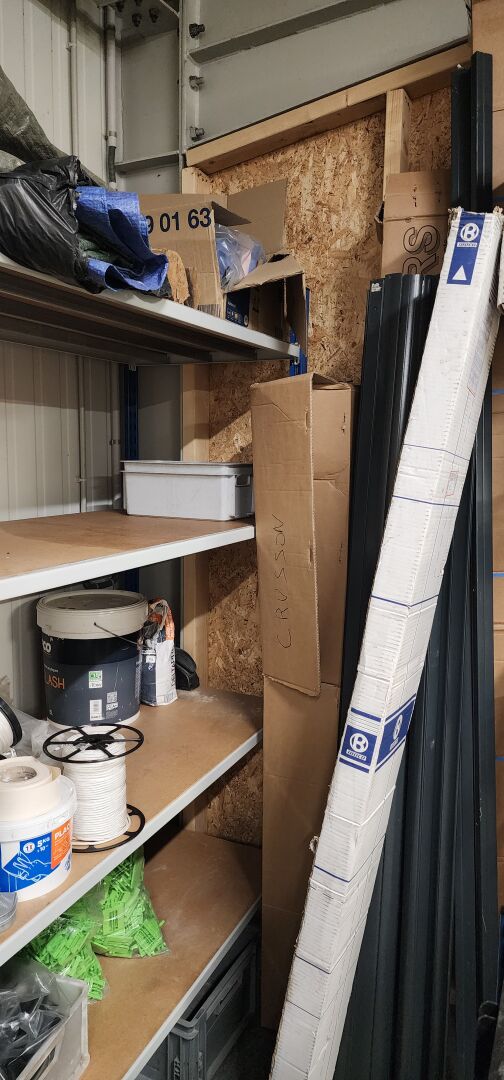 réparti dans un local : 1 stock de consommables dont vis, chevilles DuoPower, cartouches mousse isolation, volets roulants, équerres, etc