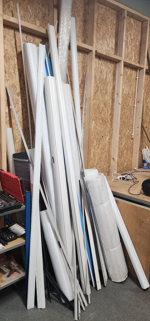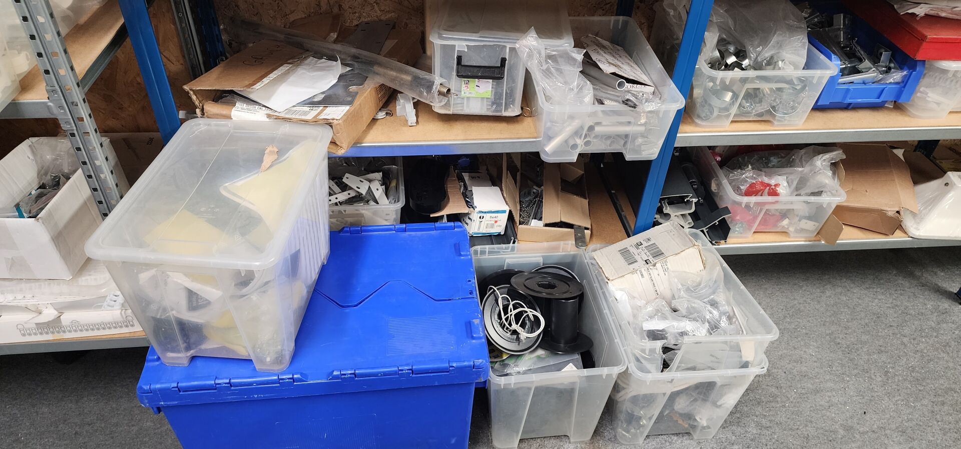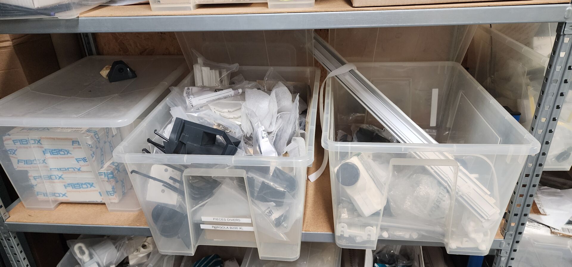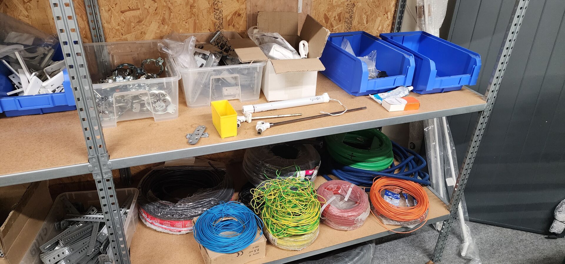 réparti dans un local : 1 stock de consommables dont vis, chevilles DuoPower, cartouches mousse isolation, volets roulants, équerres, etc