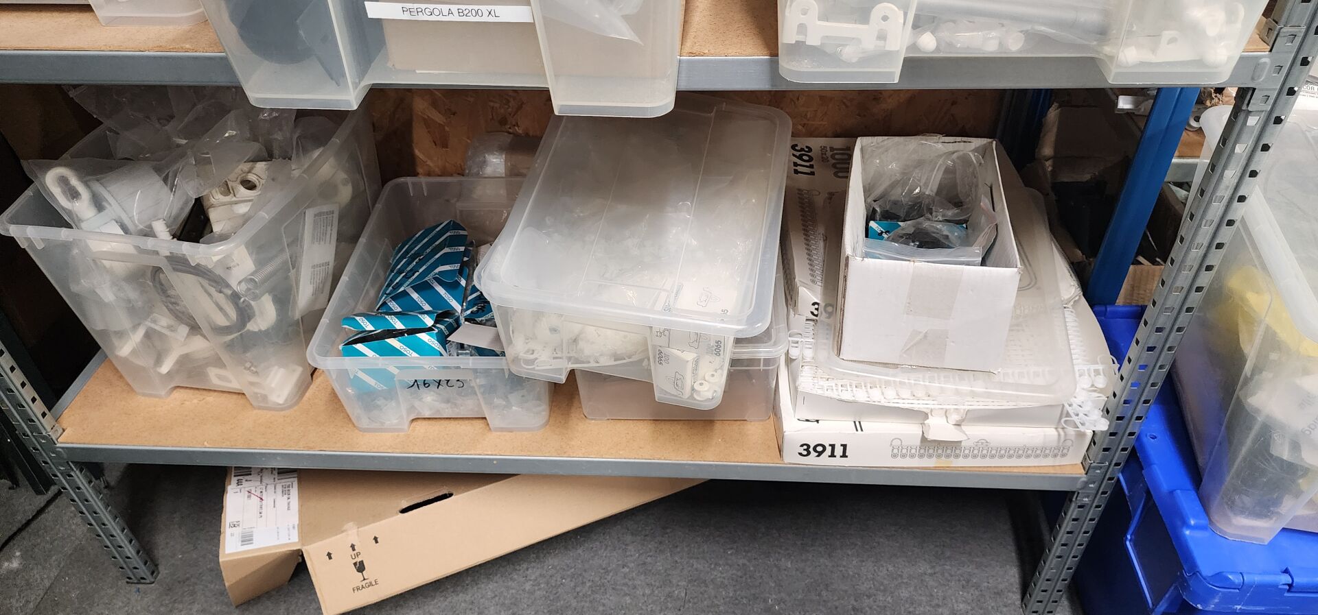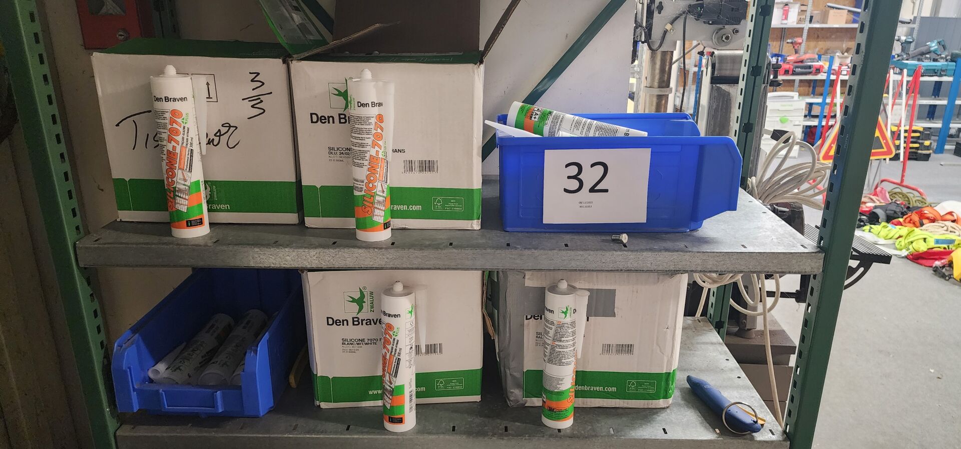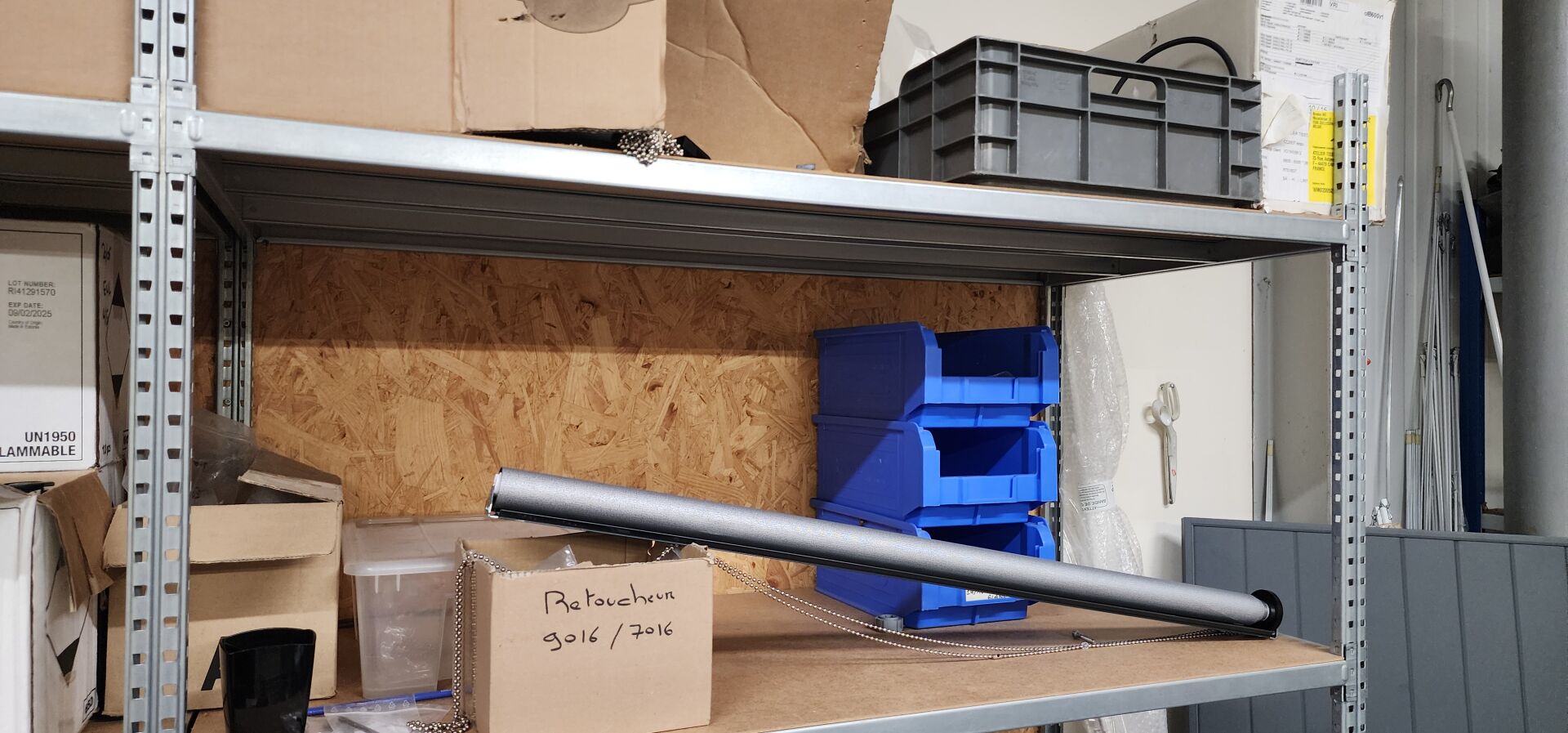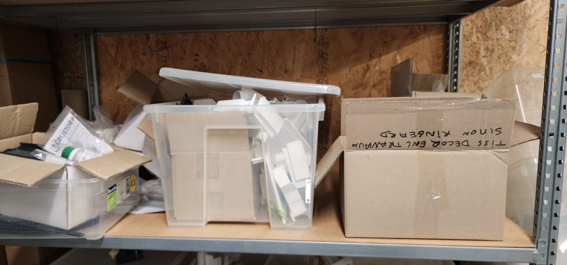 réparti dans un local : 1 stock de consommables dont vis, chevilles DuoPower, cartouches mousse isolation, volets roulants, équerres, etc
