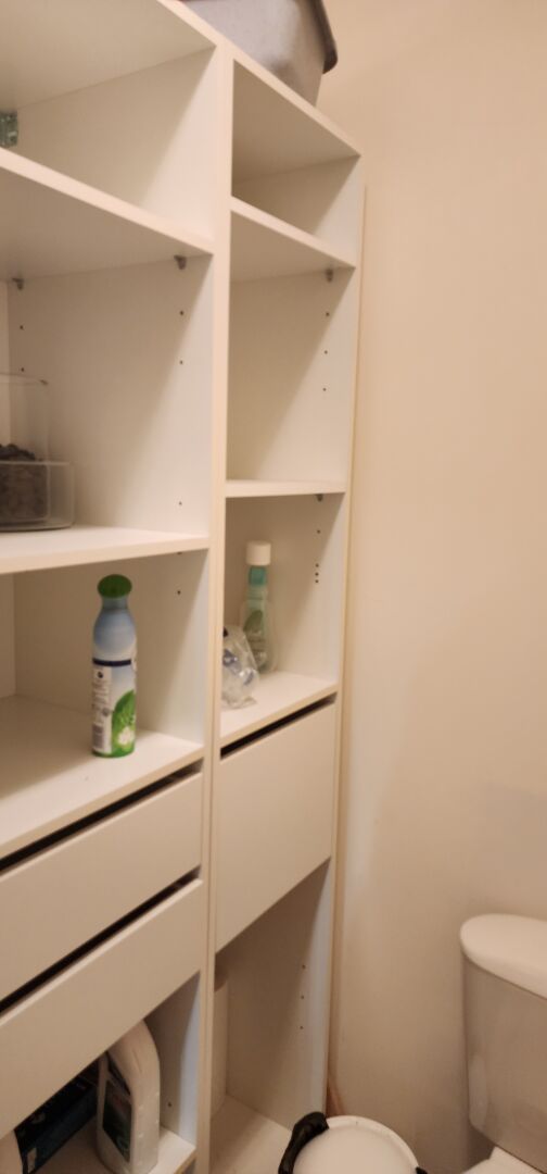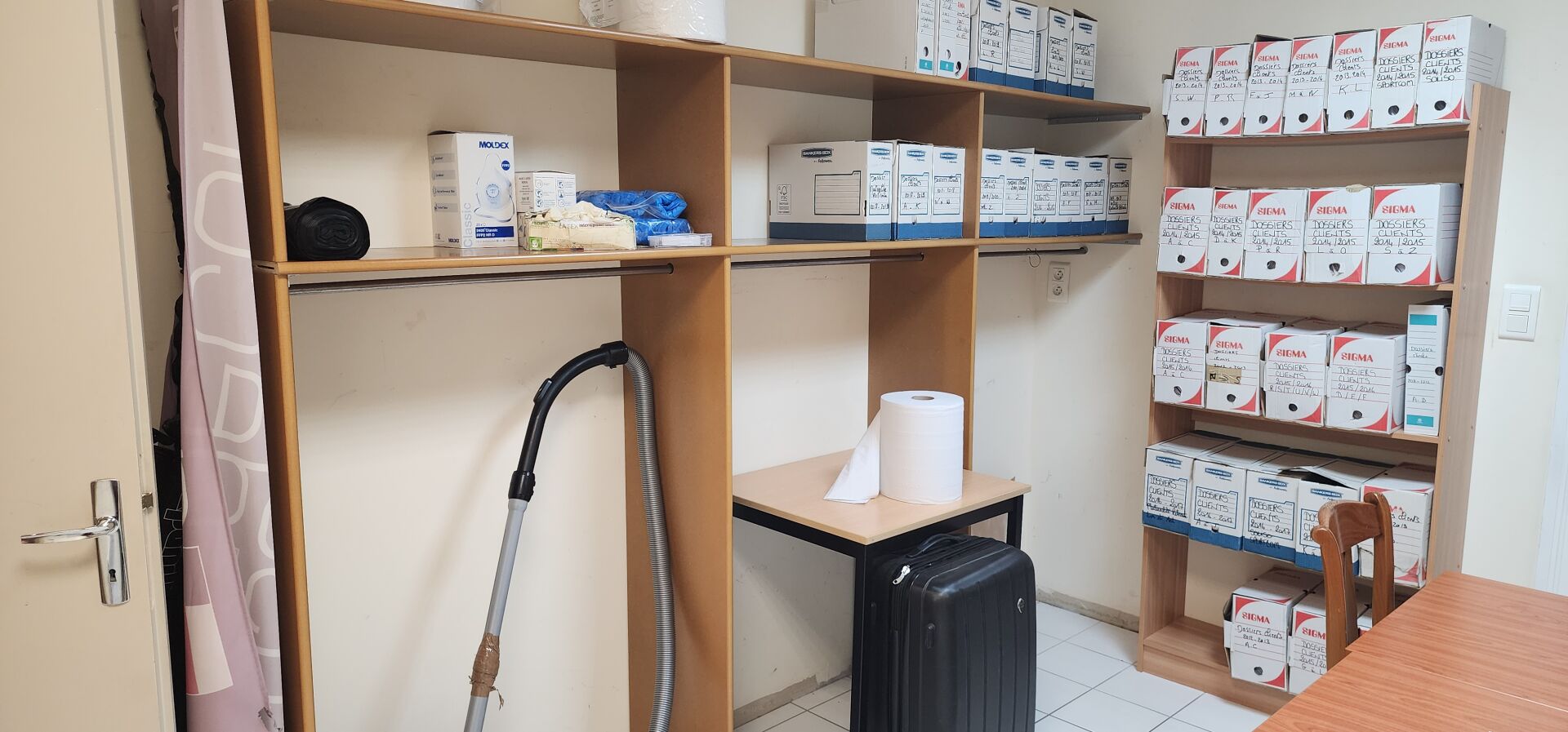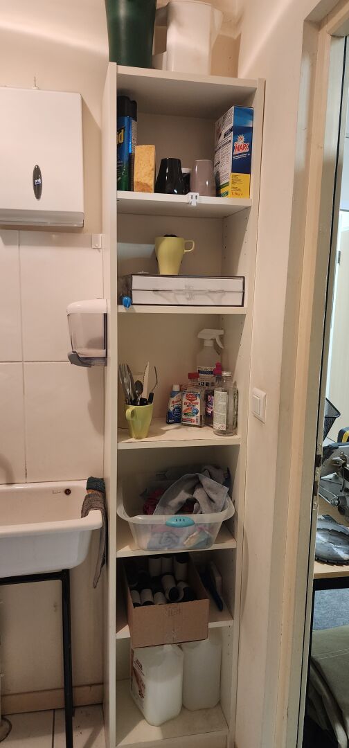 1 meuble mélaminé blanc 2 portes 120 x 41 x 130 cm (vendu sans le contenu) 3 tables mélaminé façon bois piètement métal 160 x 60 cm 2 chaises dépareillées étagères bois 1 bibliothèque mélaminé façon bois 80 x 30 x 180 cm 1 lot d'ustensiles de ménage 2 meubles colonne mélaminé blanc 1 aspirateur traineau PHILIPS