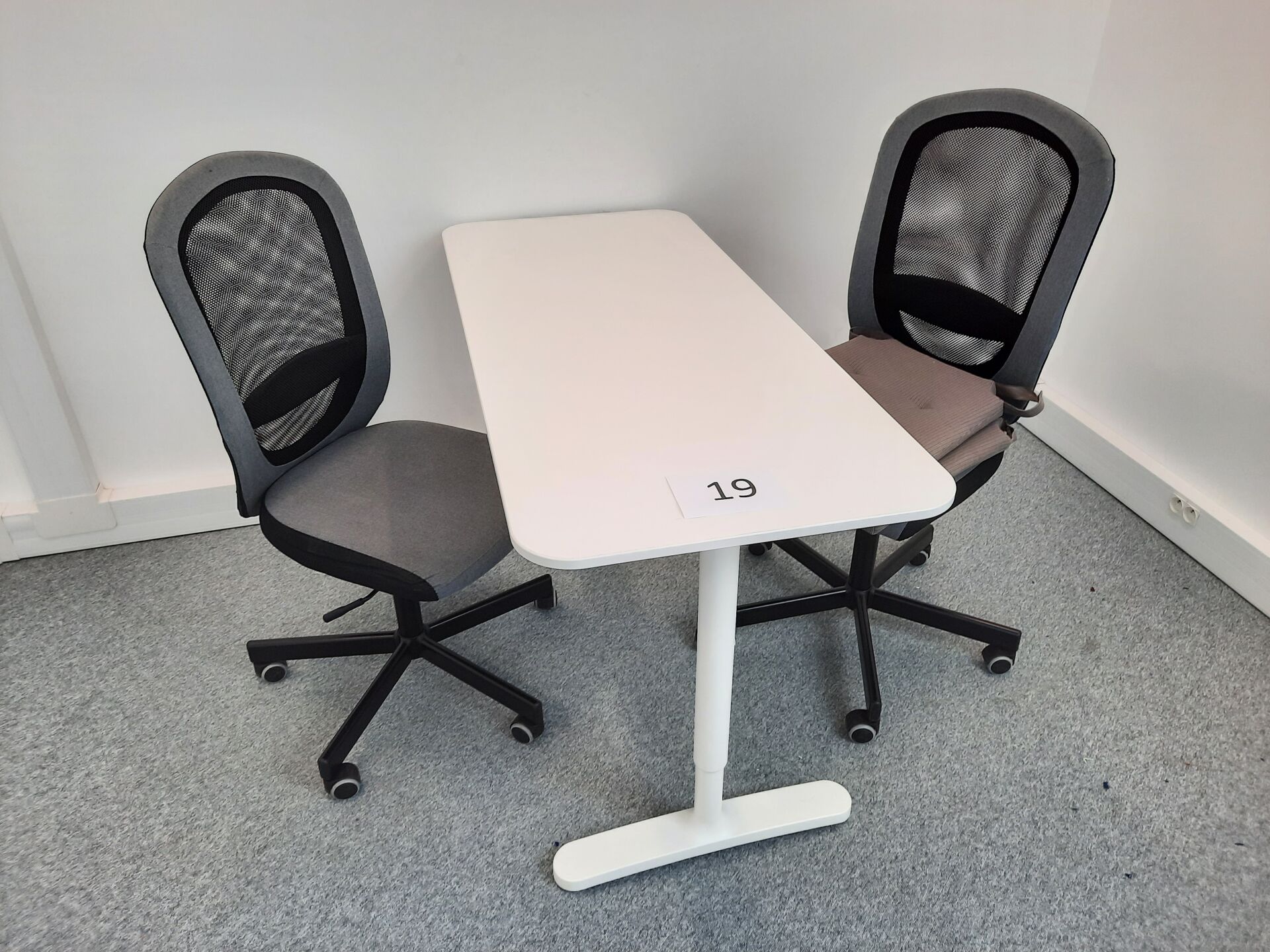 Bureau en mélaminé blanc et métal laqué blanc, IKEA modèle BEKANT, 140*60 2 chaises dactylo assise tissu gris IKEA, modèle FLANTIN