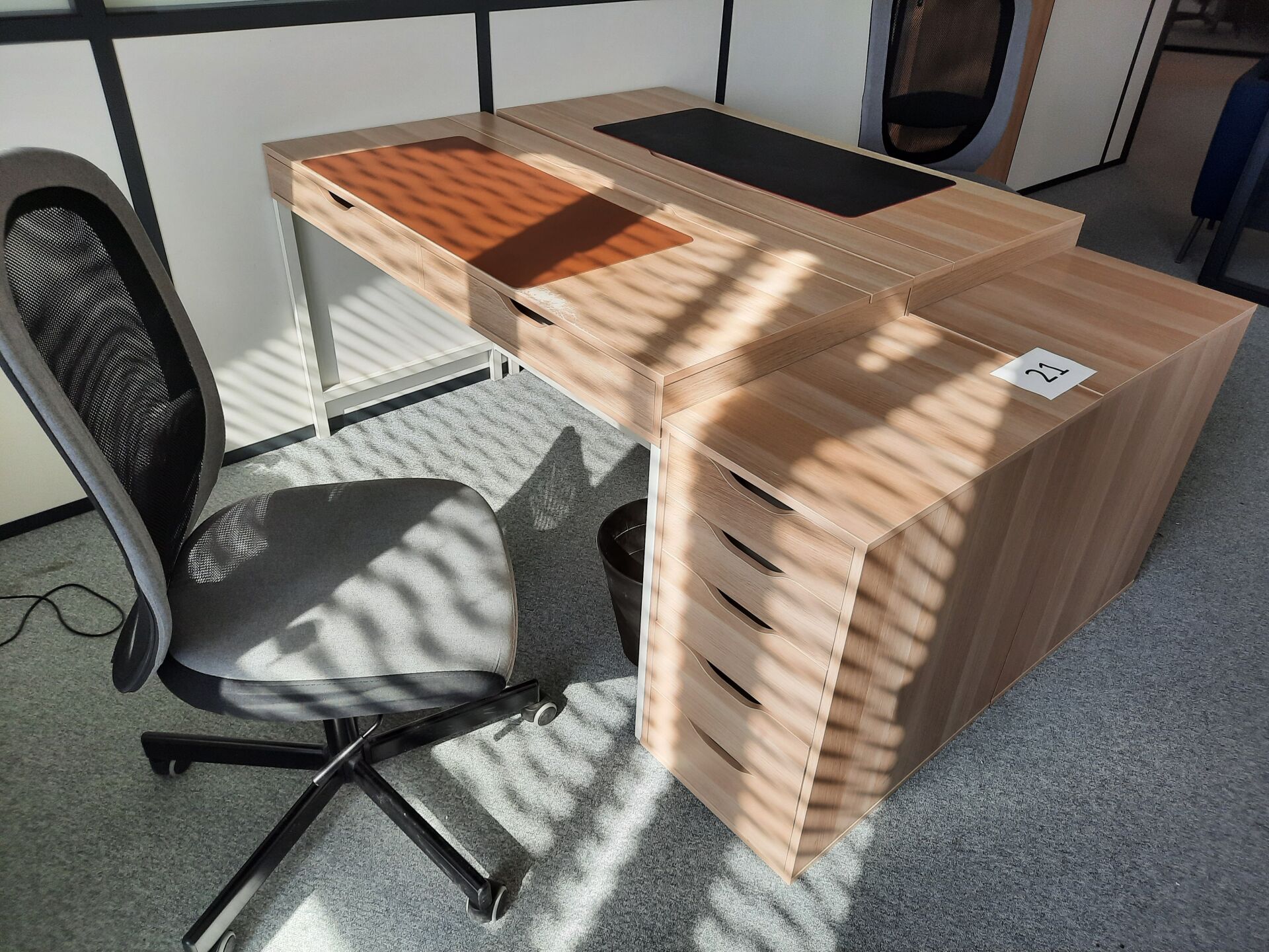 2 Bureaux en métal et mélaminé façon bois à 2 tiroirs en ceinture, IKEA modèle ALEX, 132x58 (usures au plateau) 2 caissons 5 tiroirs au modèle 2 chaises dactylo assise tissu gris IKEA, modèle FLANTIN Lampadaire en métal laqué gris et verre opalescent