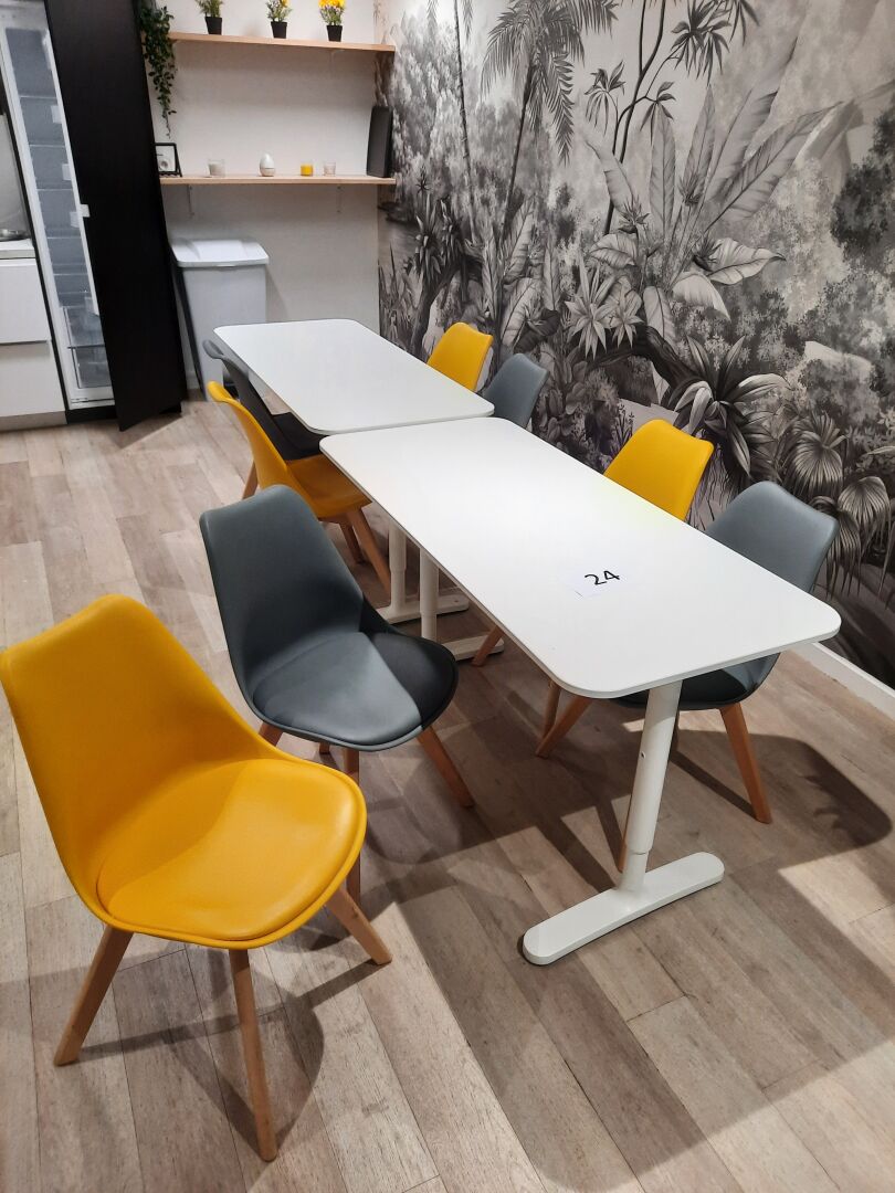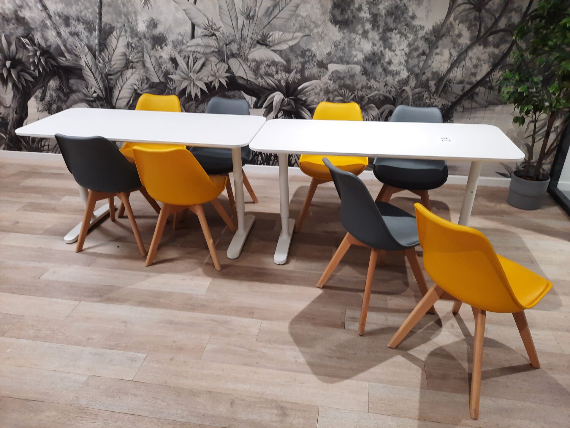 2 Bureaux en mélaminé blanc et métal laqué blanc, IKEA modèle BEKANT, 140*60 8 chaises assise coque pvc jaune et gris