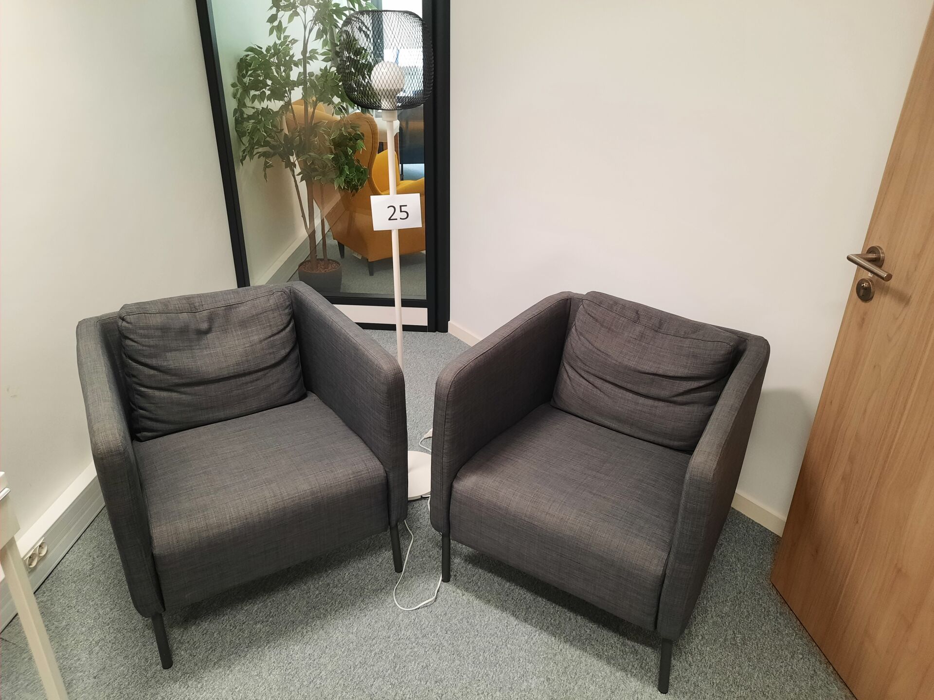 2 fauteuils assise tissu gris et piètement métal, supposé IKEA modèle EKERO Lampadaire IKEA SKAFTET
