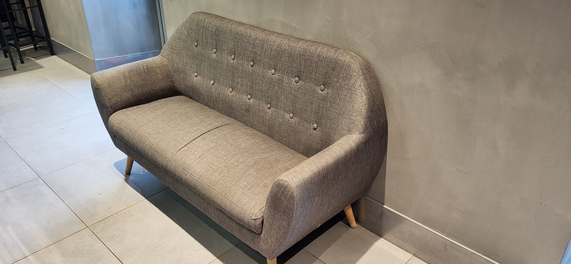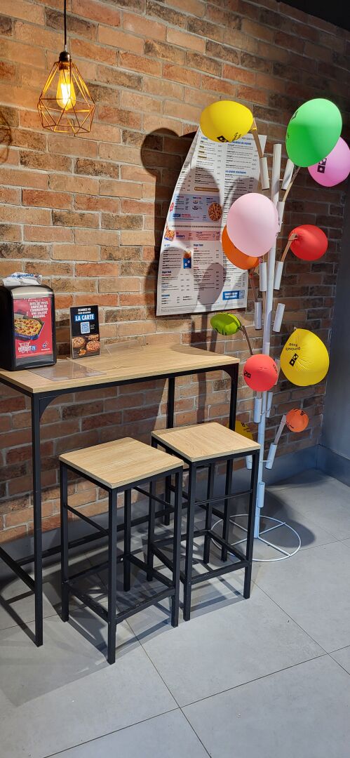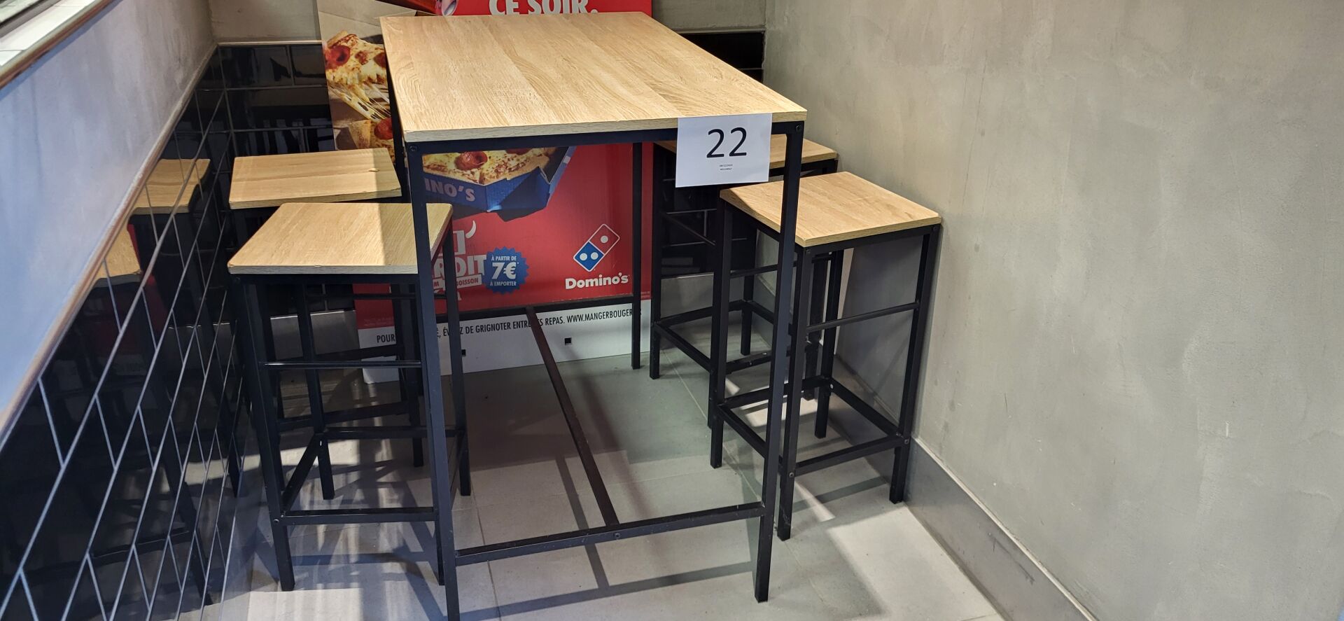 1 canapé 3 places tissu gris 140 cm 1 support pour ballons métal blanc 1 console mélaminé façon bois et métal noir 95 x 45 cm 1 table haute assortie 100 x 60 cm 6 tabourets hauts assortis