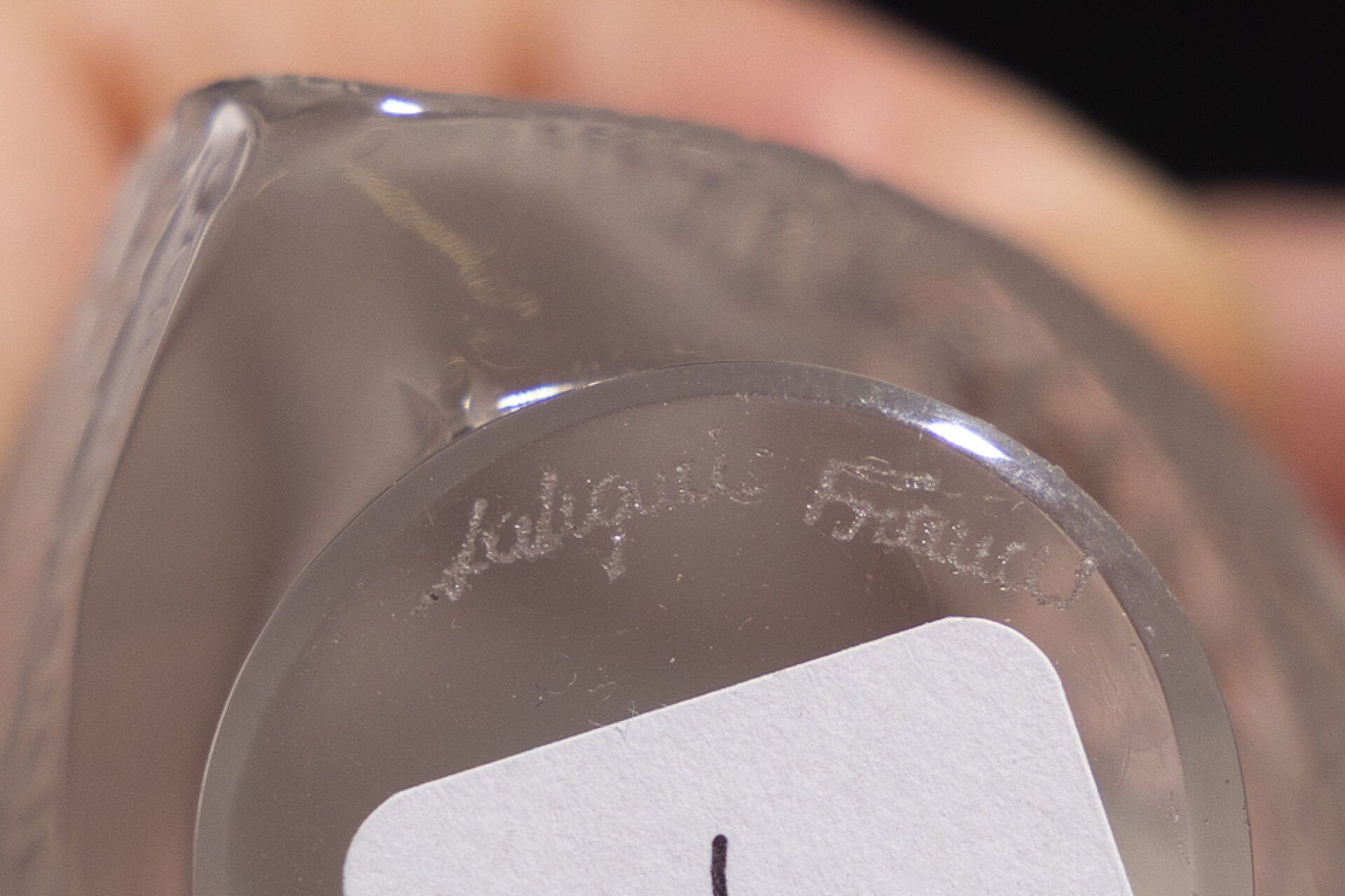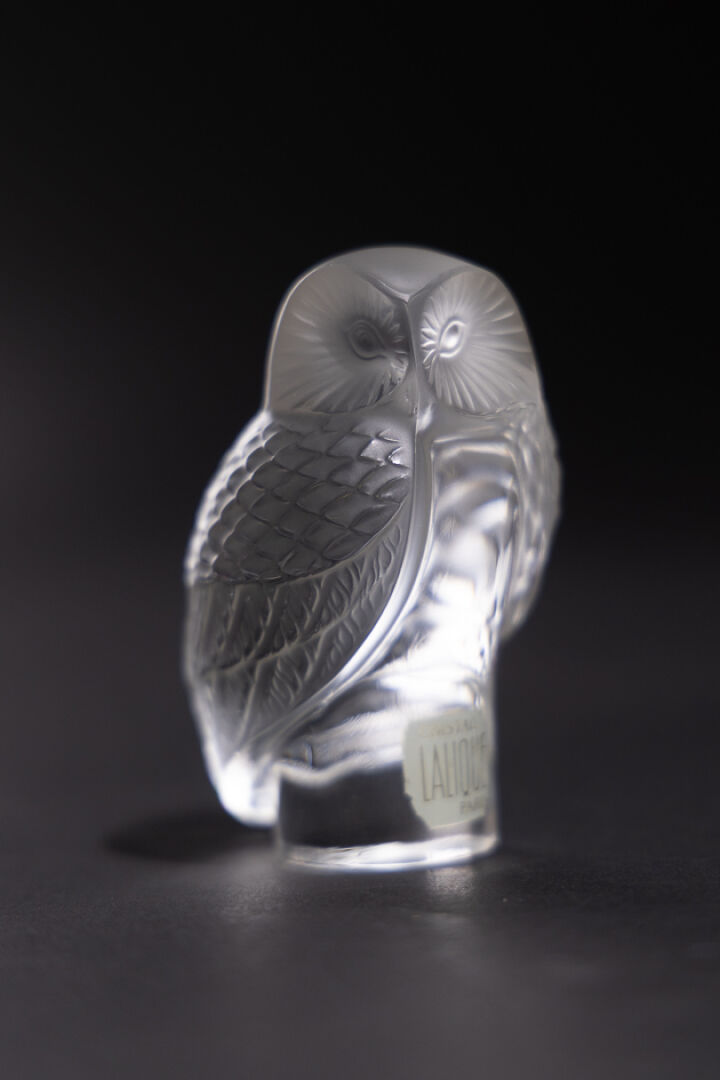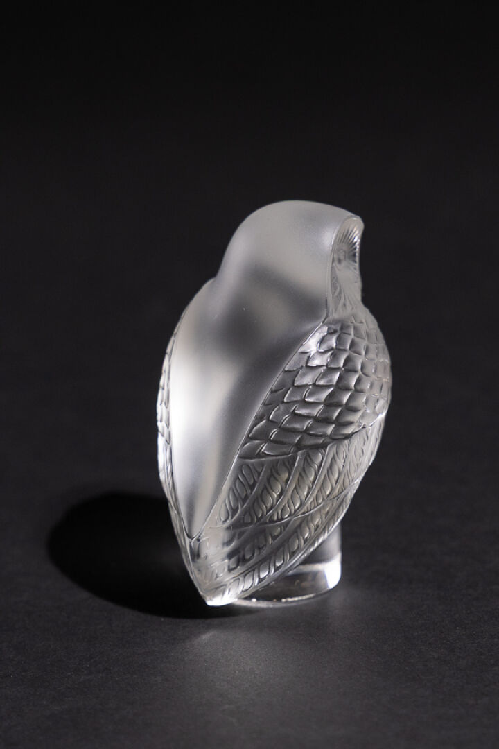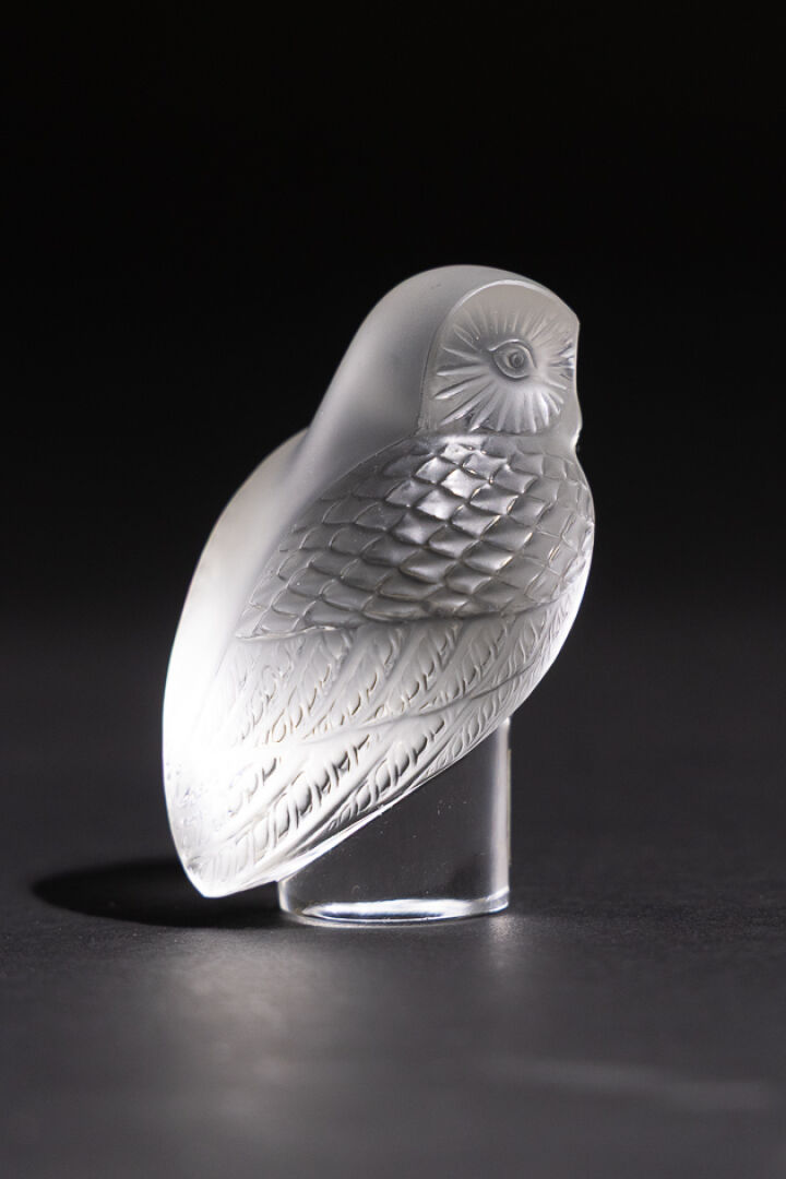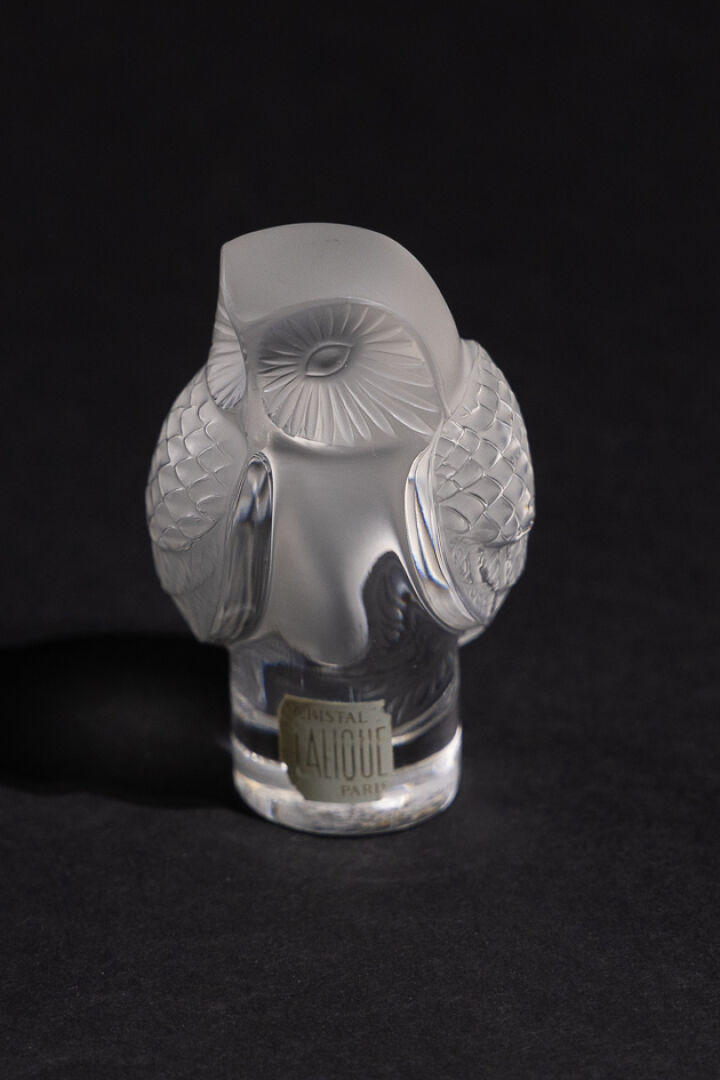 Maison LALIQUE France. Chouette. Statuette en verre et verre givré, signée à la pointe sous la base, étiquette. Haut. : 9 cm