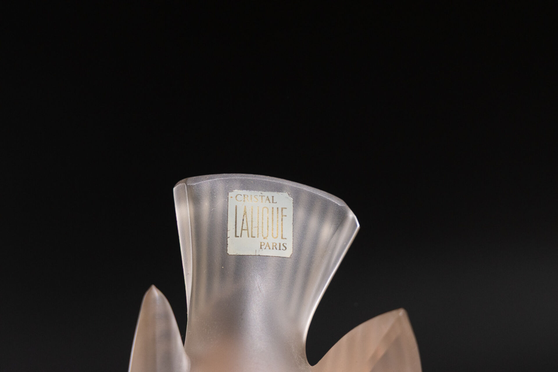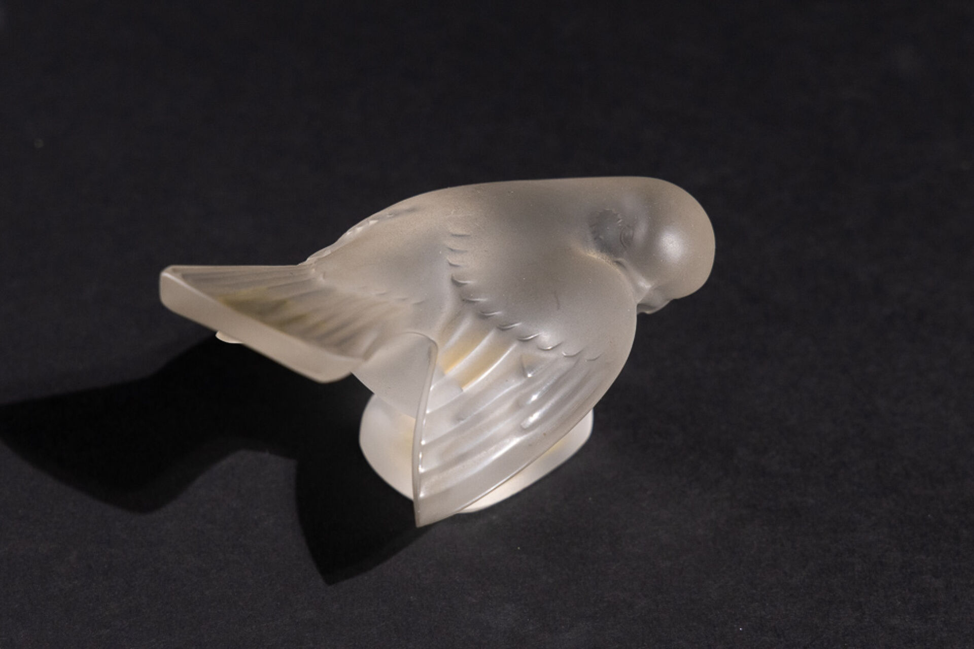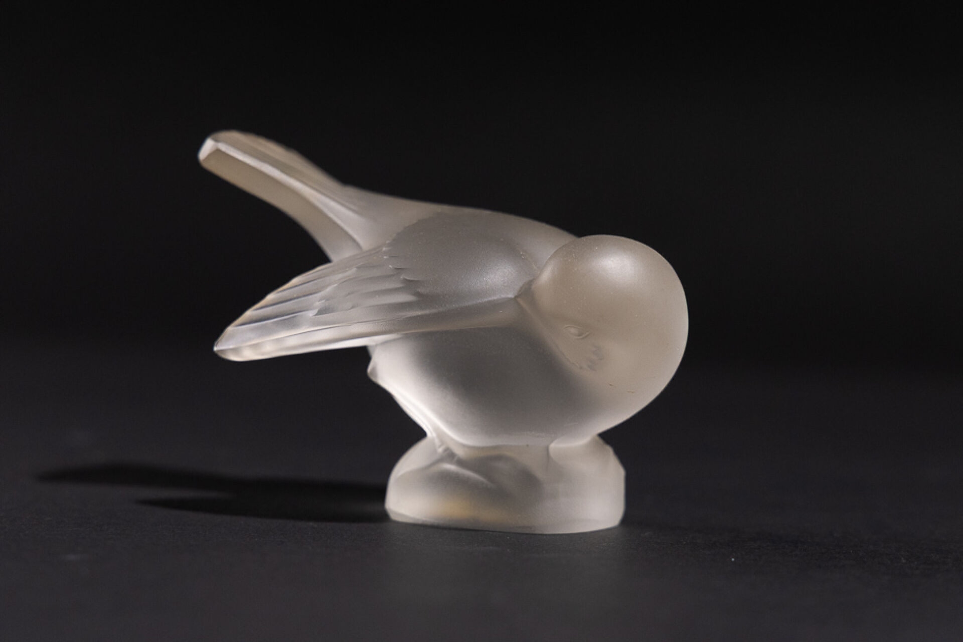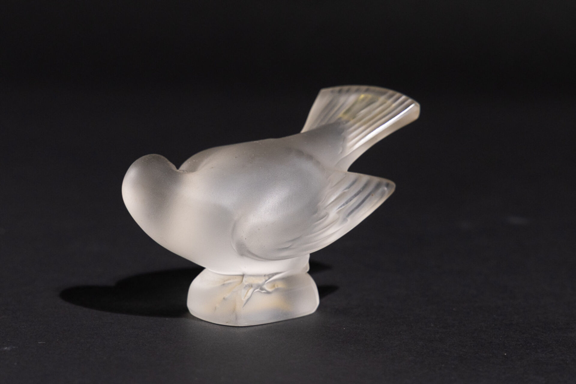 Maison LALIQUE France. Presse-papier, modèle "Moineau coquet" en verre givré moulé-pressé, signé à la pointe sous la base, étiquette. Haut. : 8 cm Modèle crée en 1930. Modèle approchant reproduit au catalogue raisonné R.LALIQUE 1994, p.388 - N° 1165.