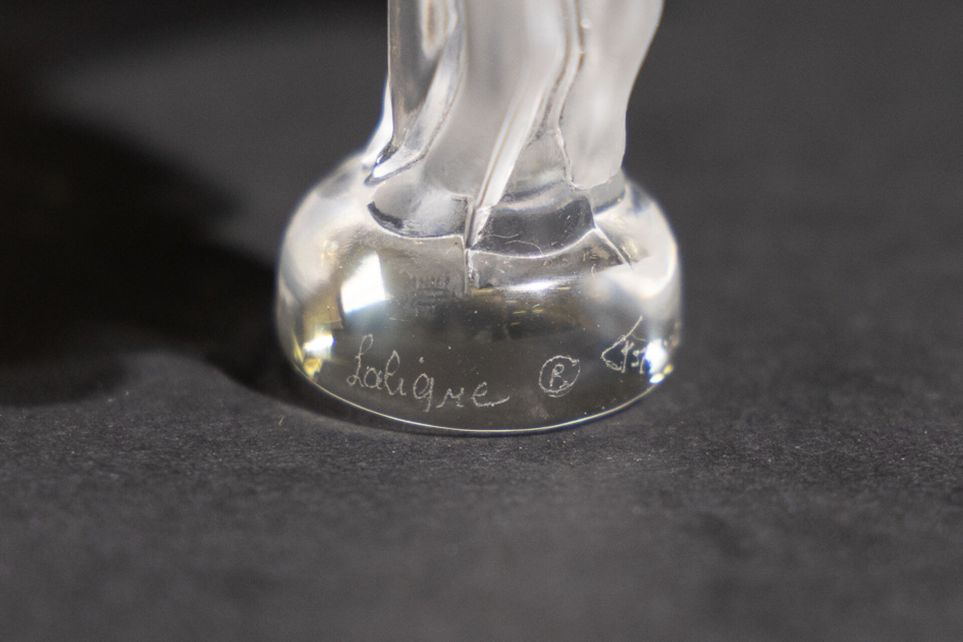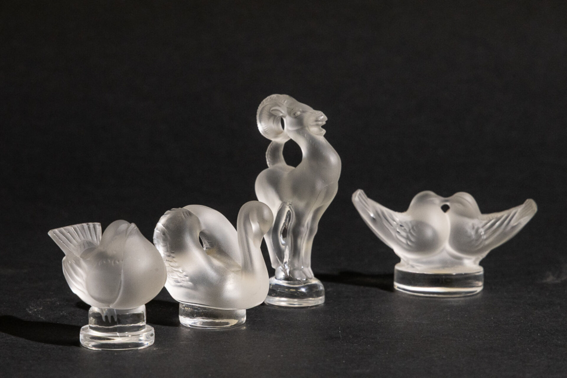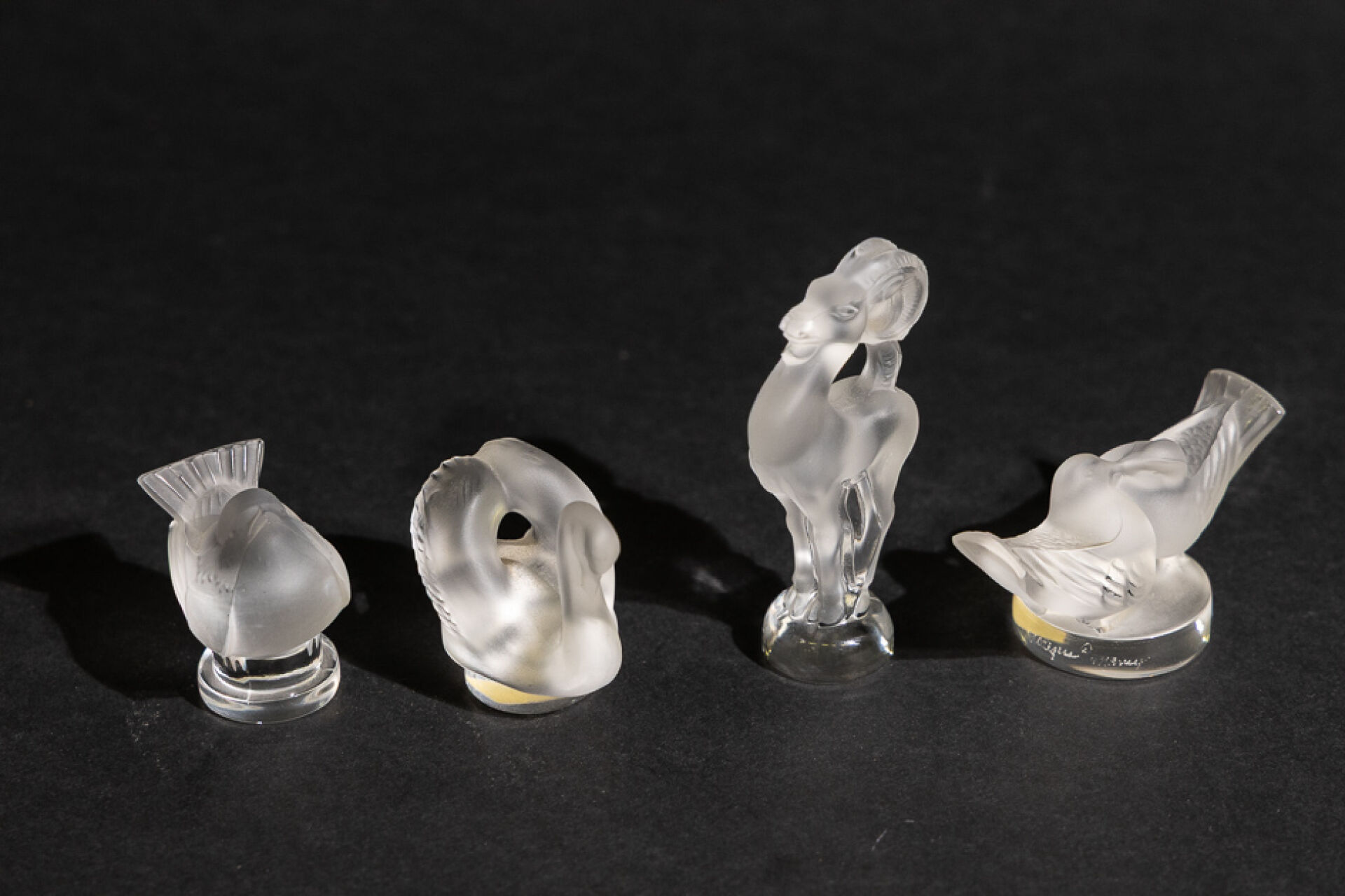 Maison LALIQUE France. Ensemble de quatre cachets signés à la pointe, comprenant : - Mouflon en verre blanc moulé-pressé satiné, Haut. : 8 cm; - Deux colombes en verre blanc moulé-pressé satiné, signées à la pointe sur la base, Haut. : 3,5 cm - Larg. : 7 cm; - Pinson en verre blanc moulé-pressé satiné, Haut. : 4 cm; - Cygne en verre blanc moulé-pressé satiné, Haut. : 4,5 cm.