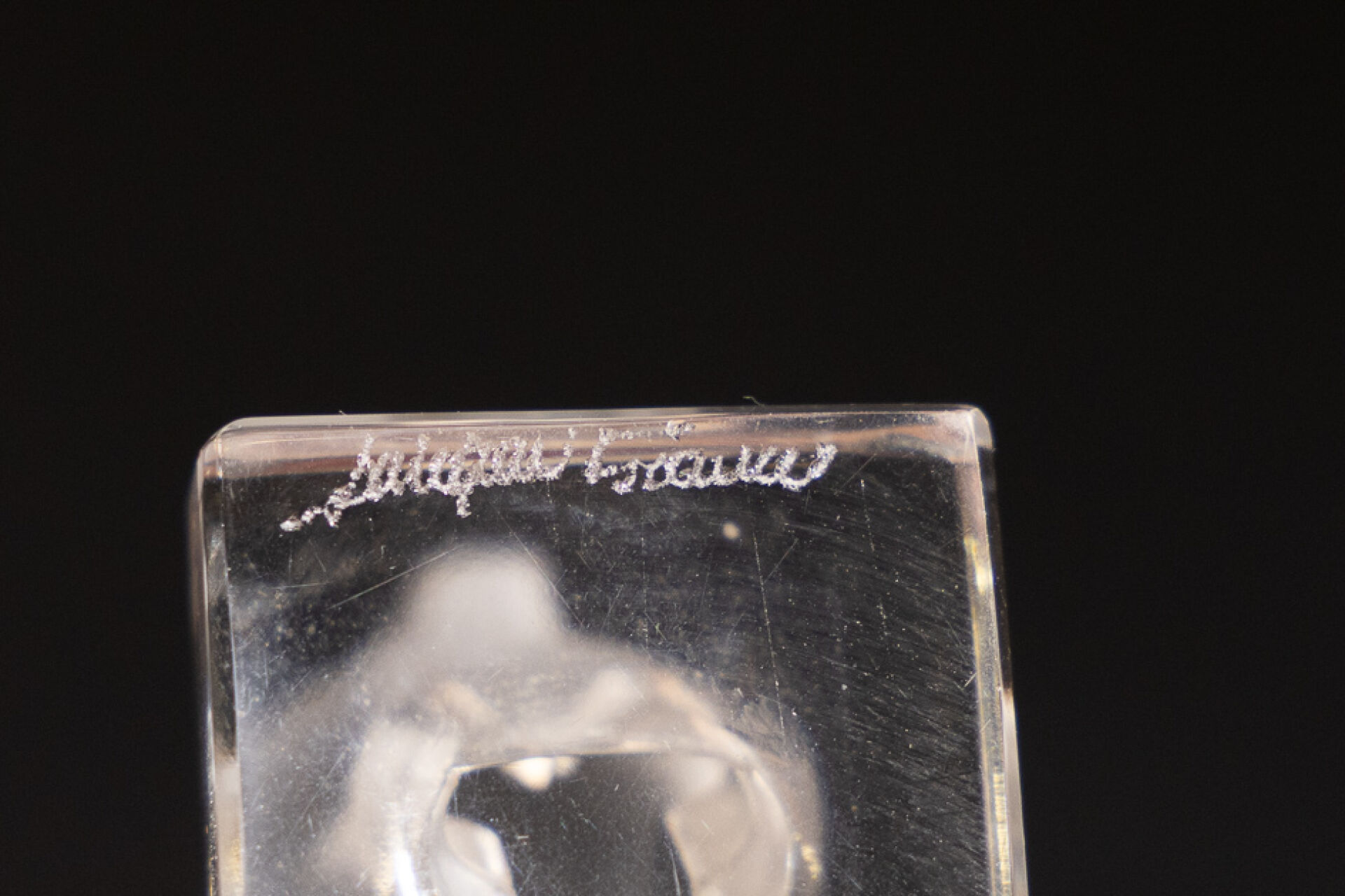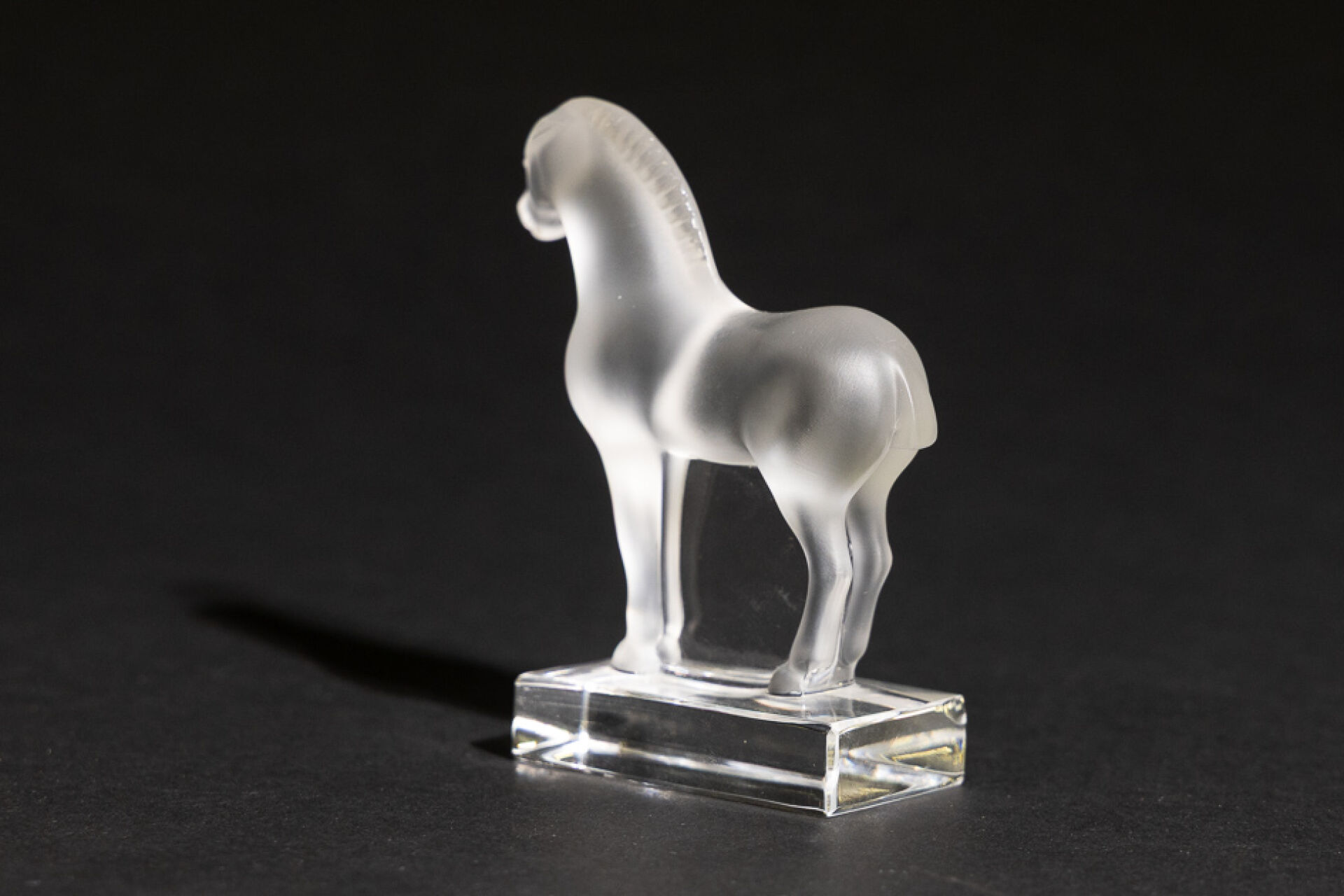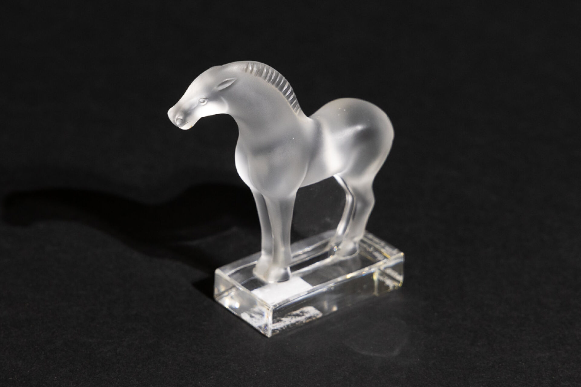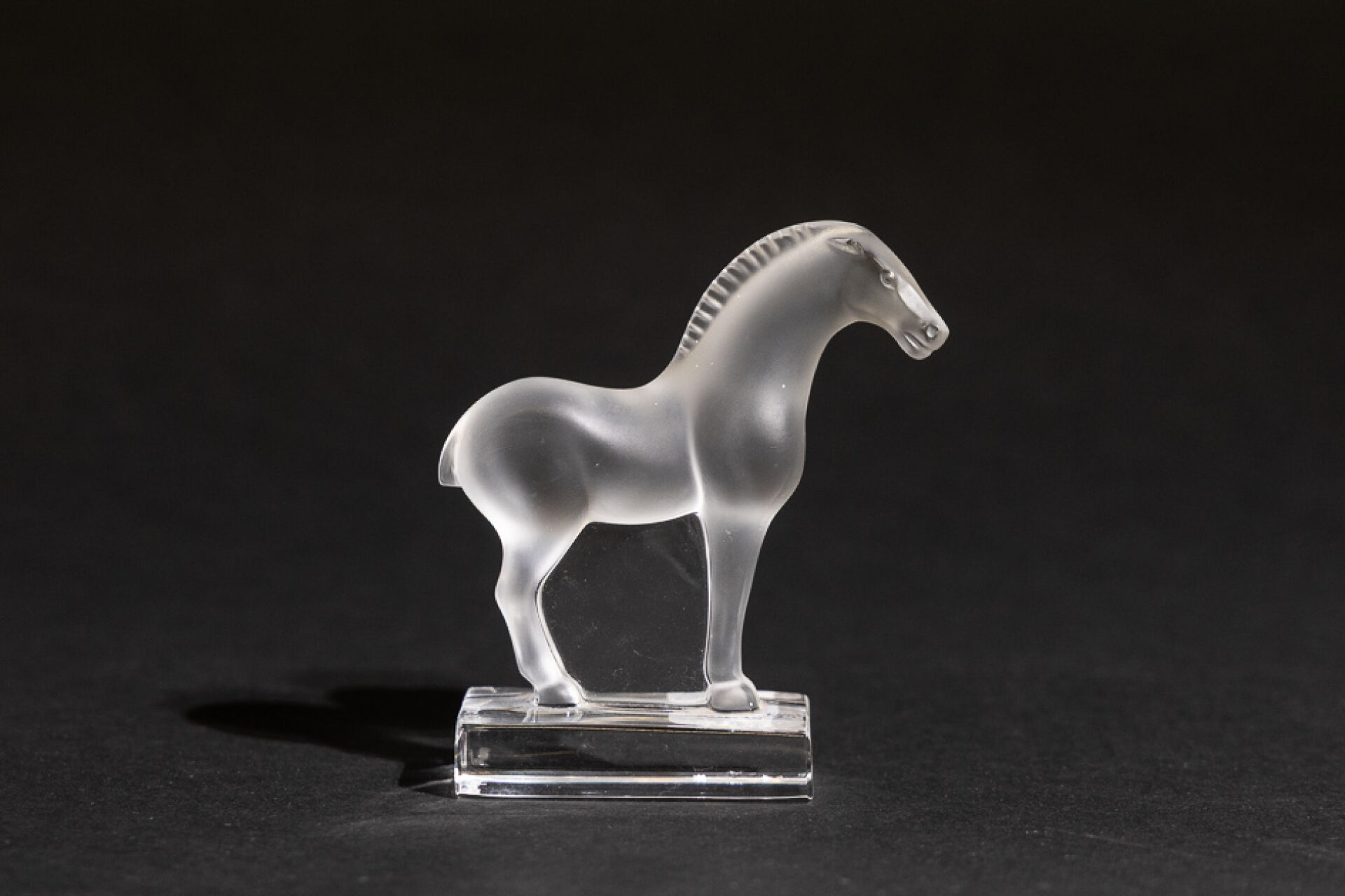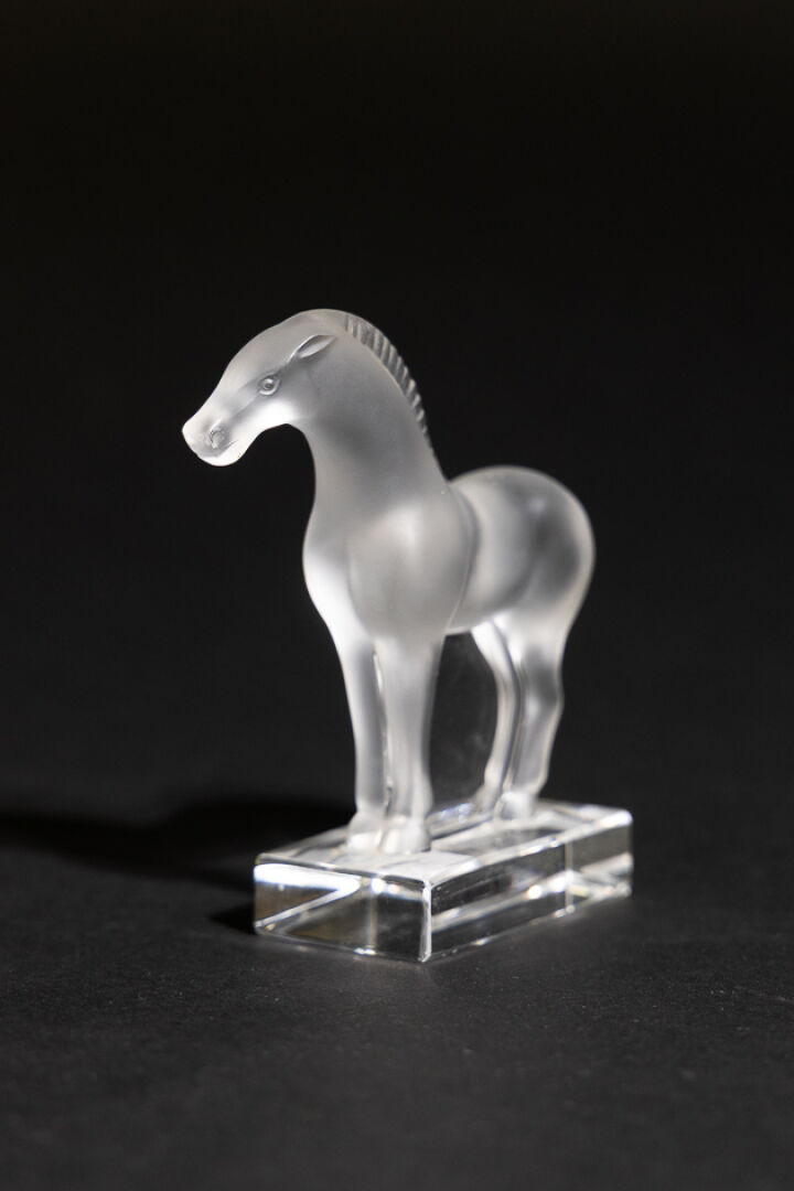 Maison LALIQUE France. Presse-papier cheval sur un socle rectangulaire en verre blanc moulé-pressé satiné, signé à la pointe sous la base. Haut. : 9,5 cm - Larg. : 8,5 cm