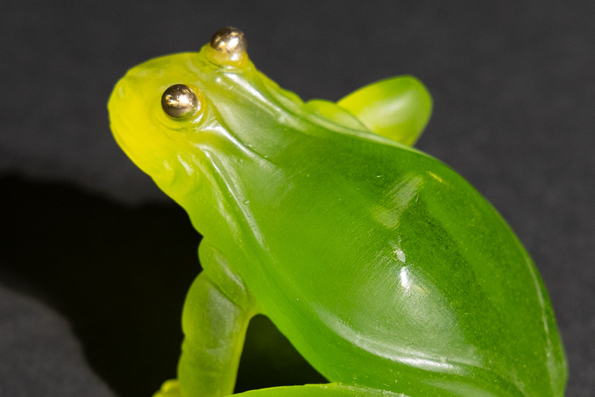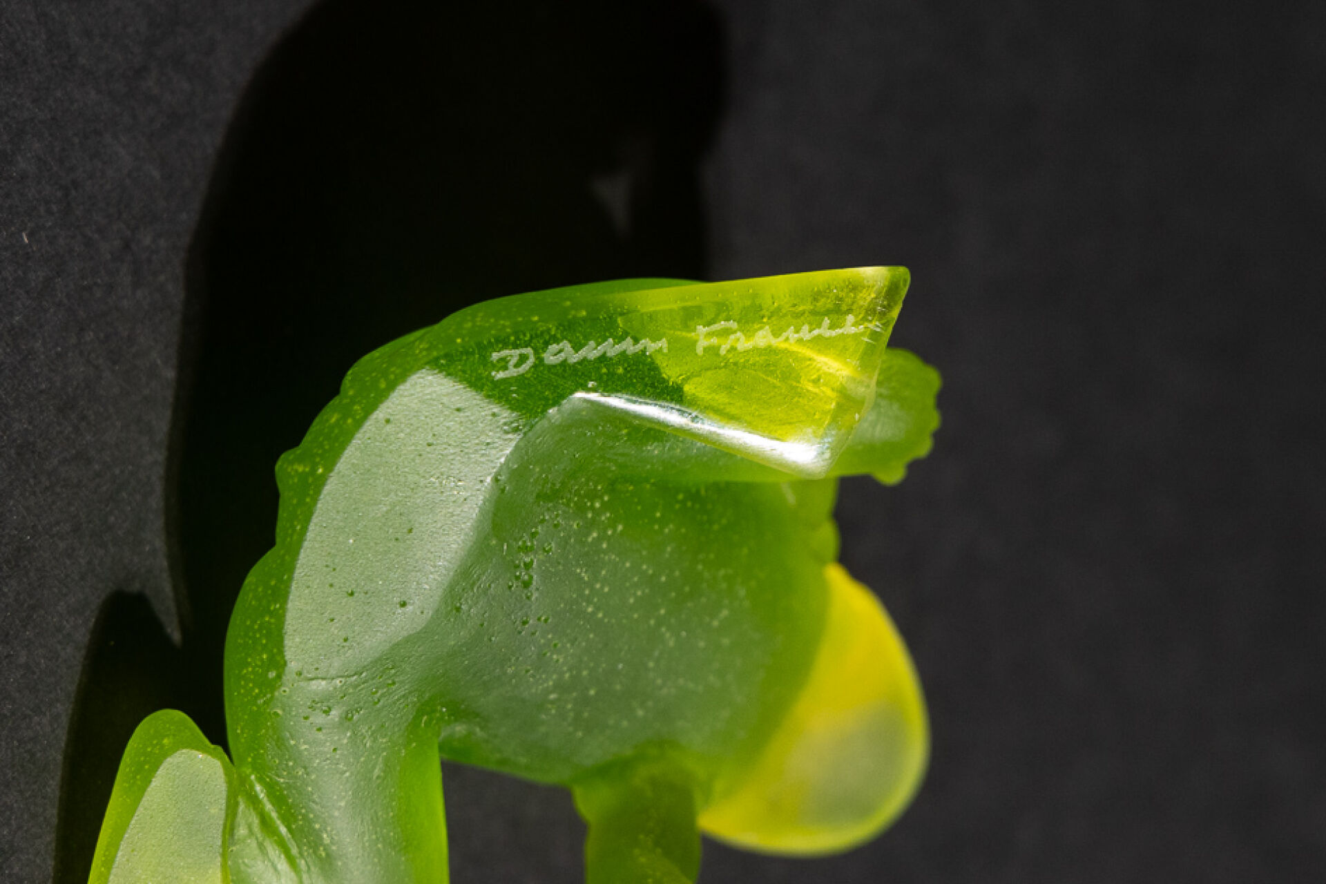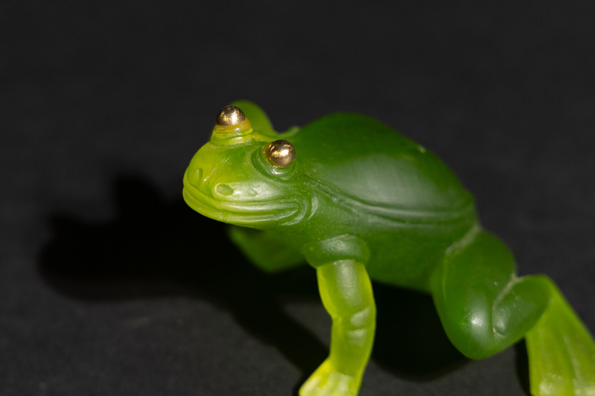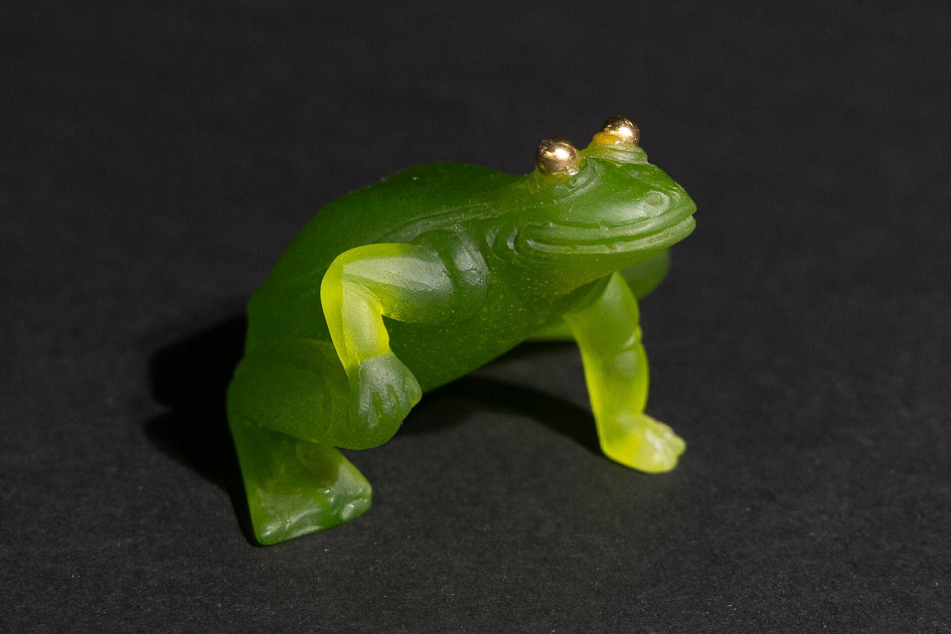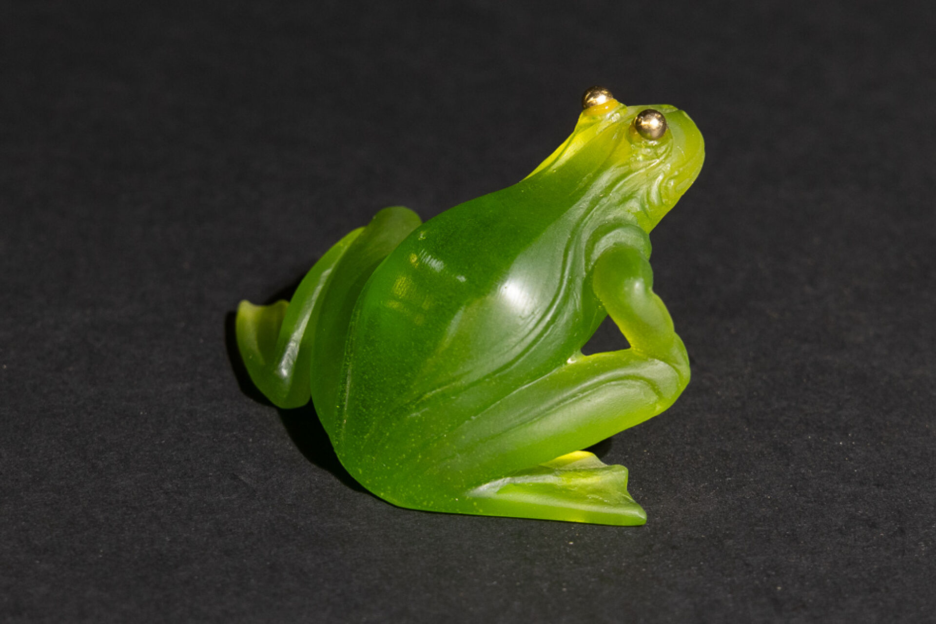 Maison DAUM France. "La grenouille aux Yeux d'Or". Sujet en pâte de verre teintée vert, les yeux rehaussés d'or. Avec sa boîte d'origine (accidentée). Haut. : 6 cm