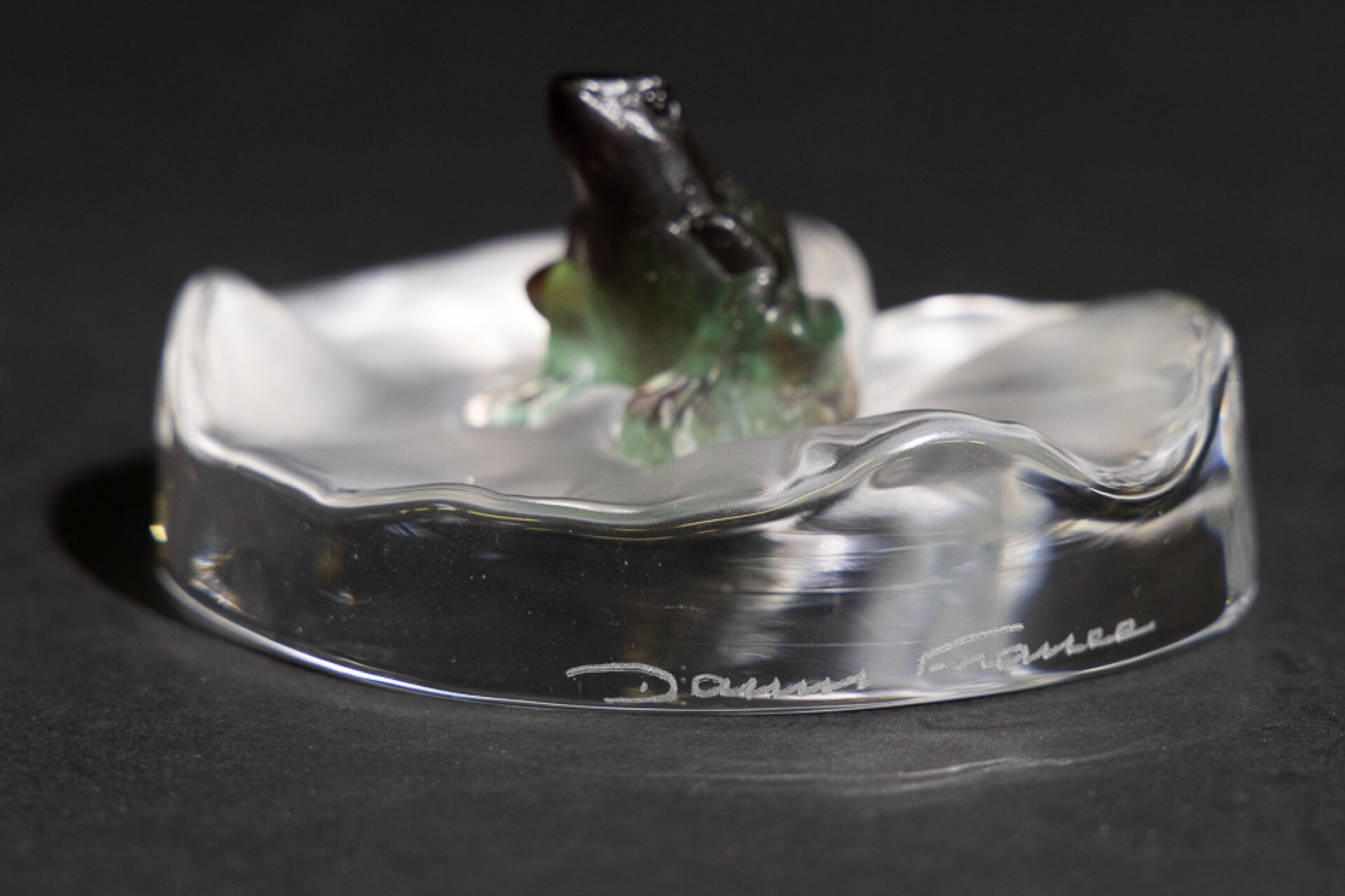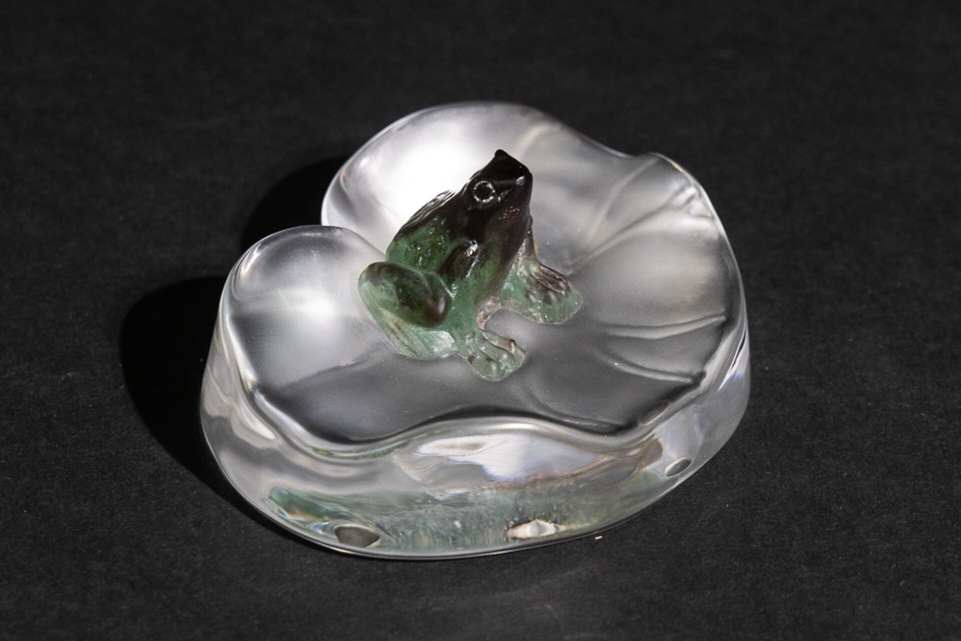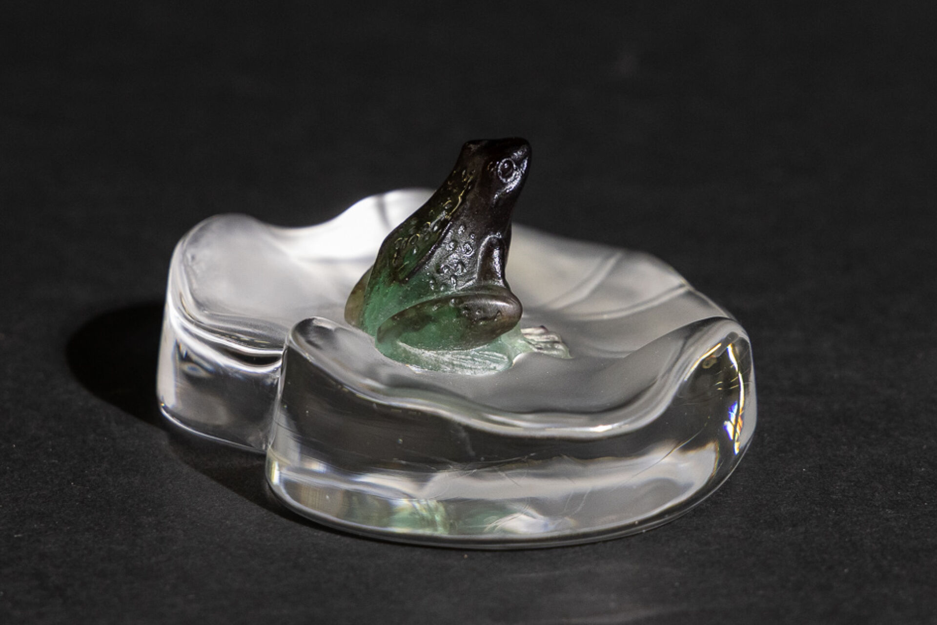 Maison DAUM France. Grenouille rainette assise sur une feuille de nénuphar. Sujet en verre et pâte de verre, signé sur la base. Haut. : 4,5 cm - Larg. : 10 cm