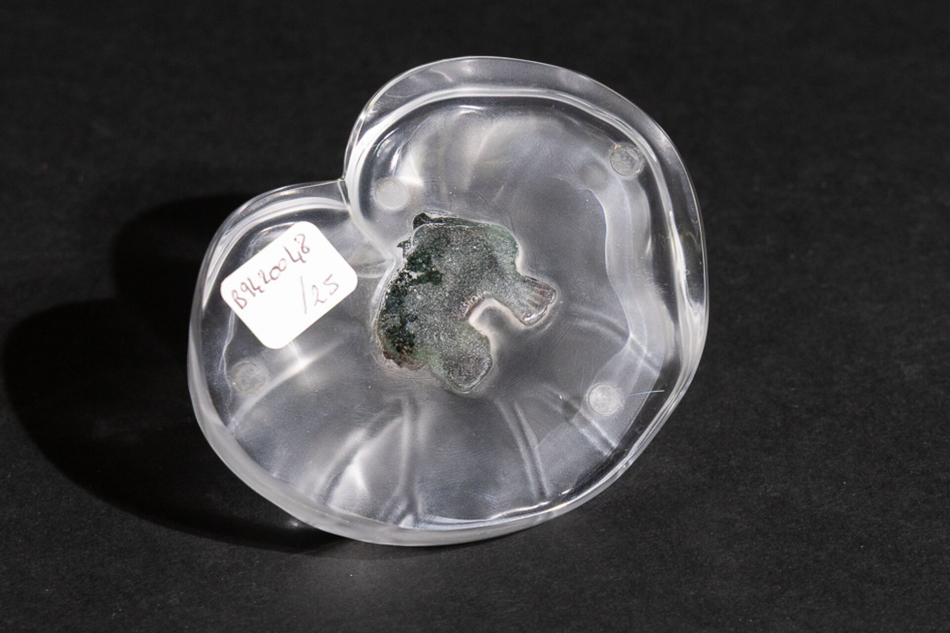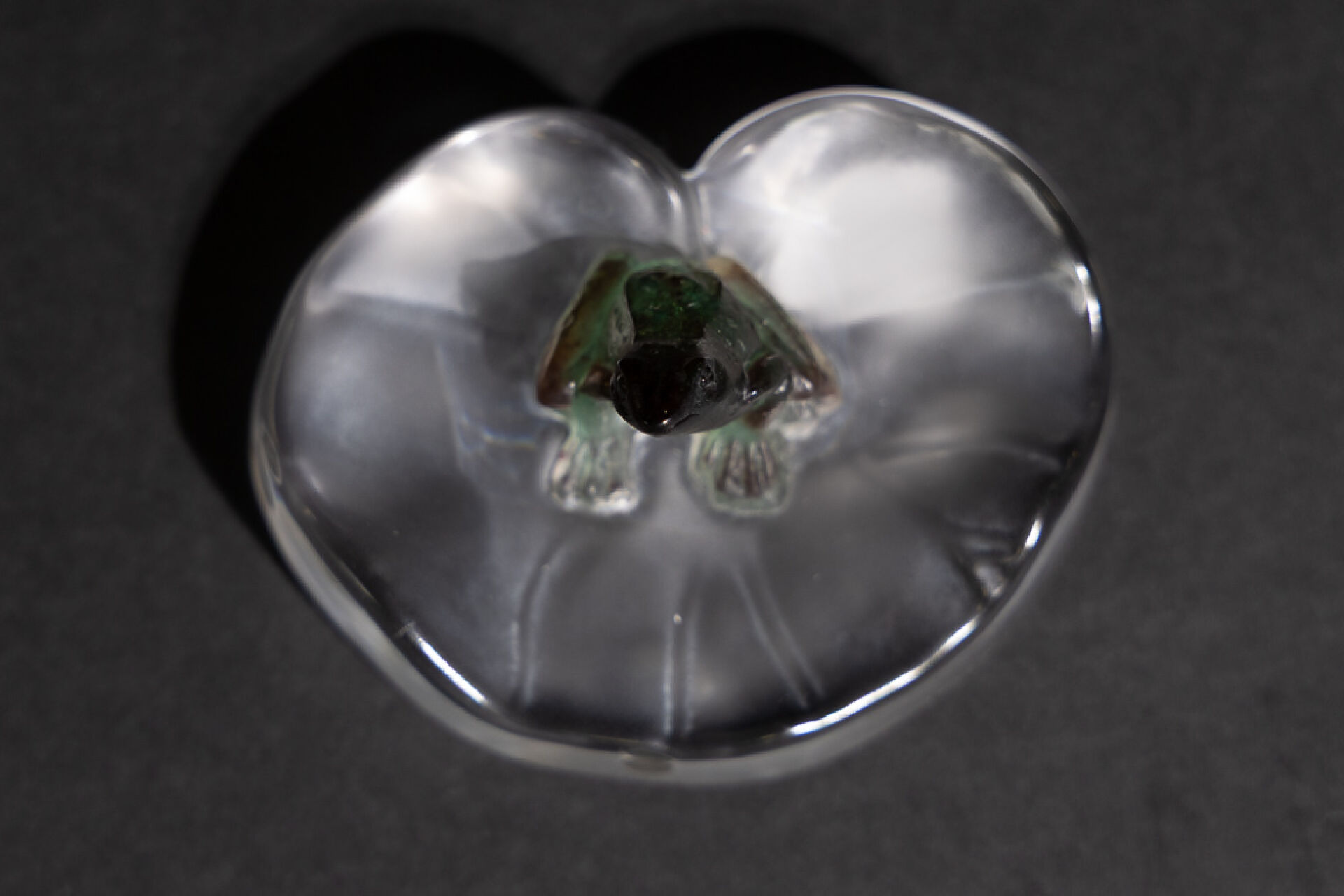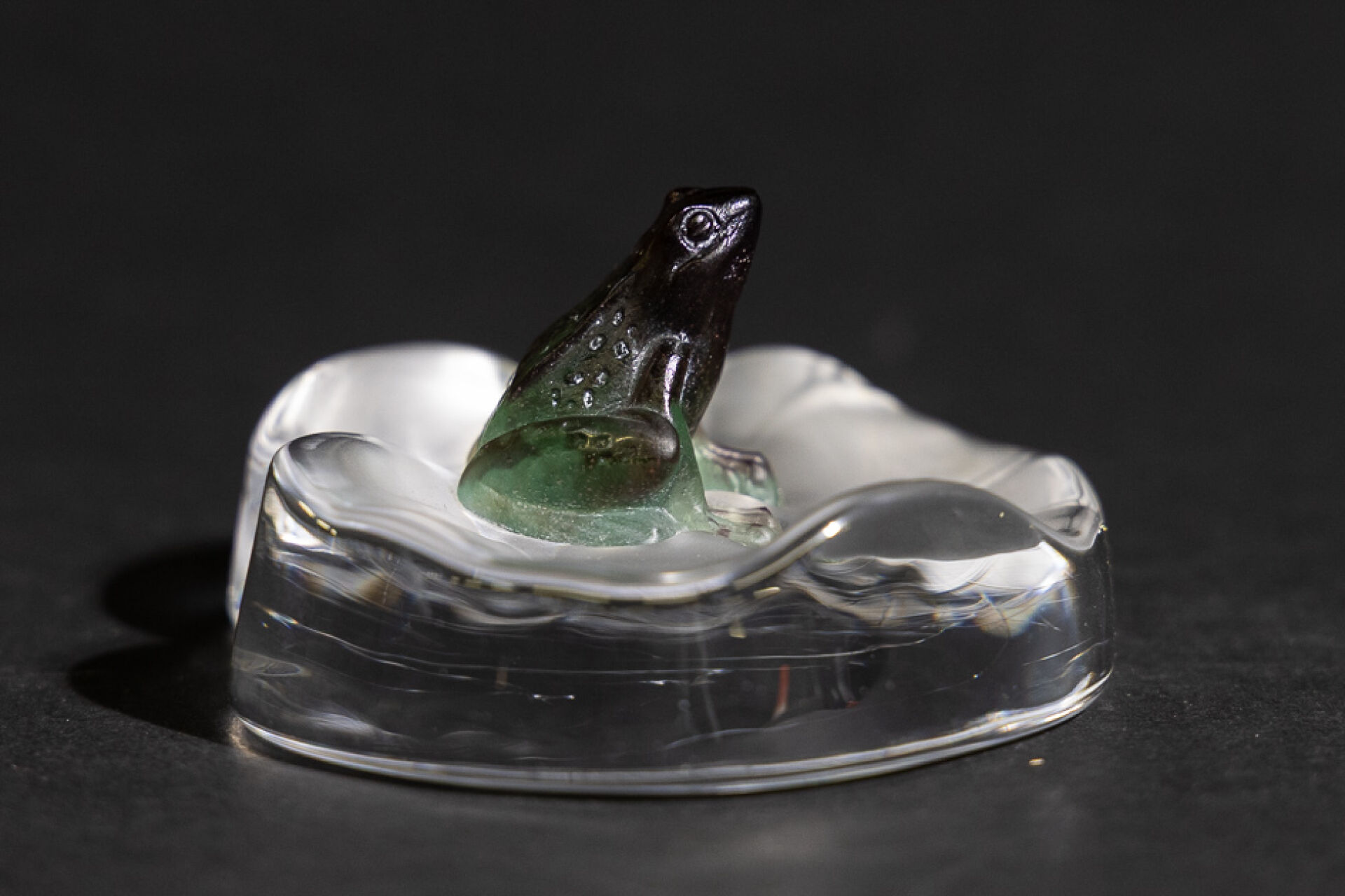 Maison DAUM France. Grenouille rainette assise sur une feuille de nénuphar. Sujet en verre et pâte de verre, signé sur la base. Haut. : 4,5 cm - Larg. : 10 cm