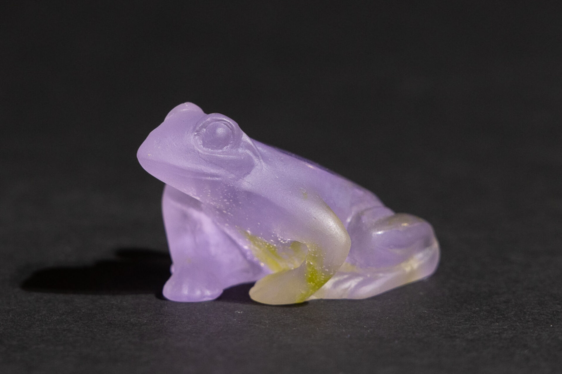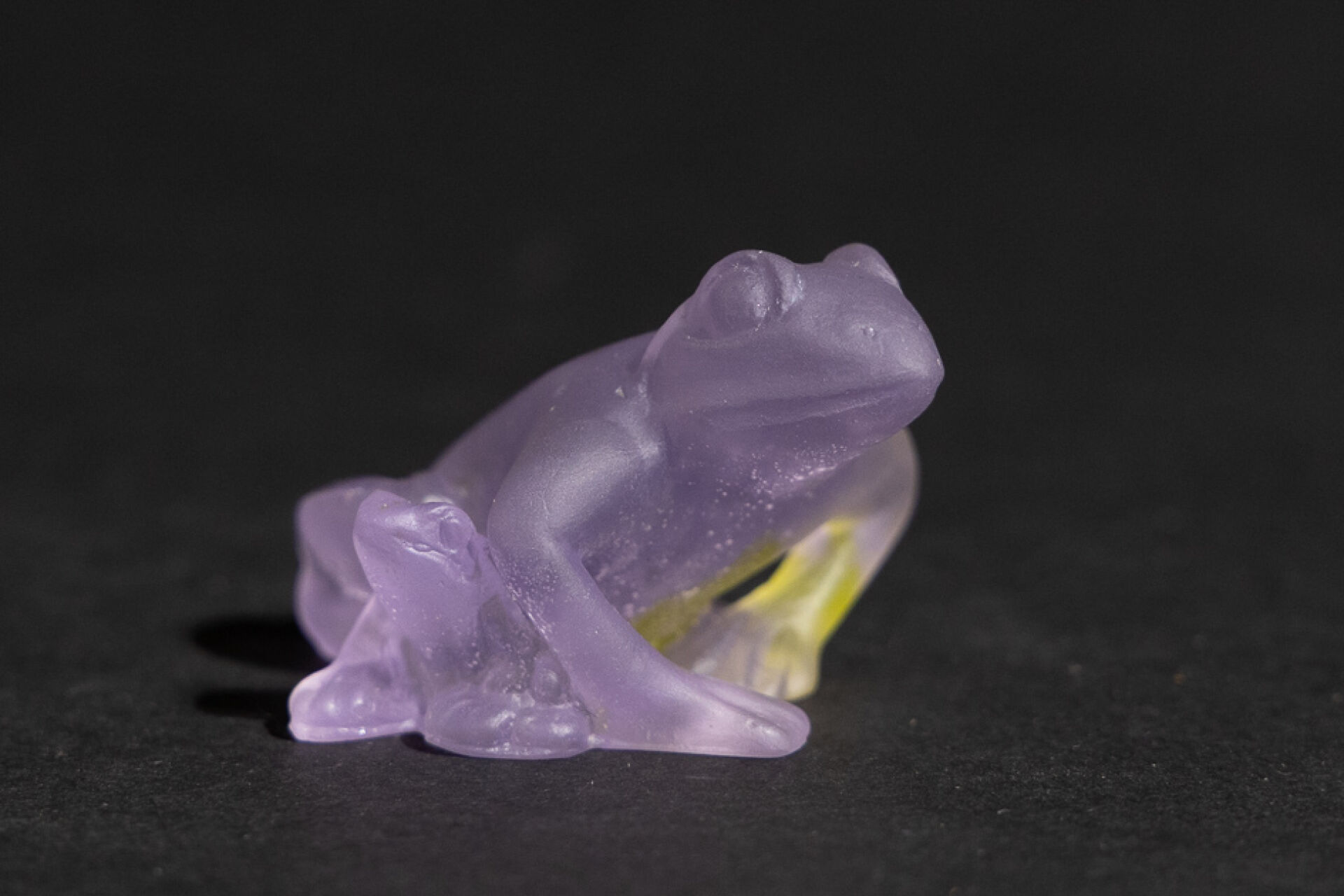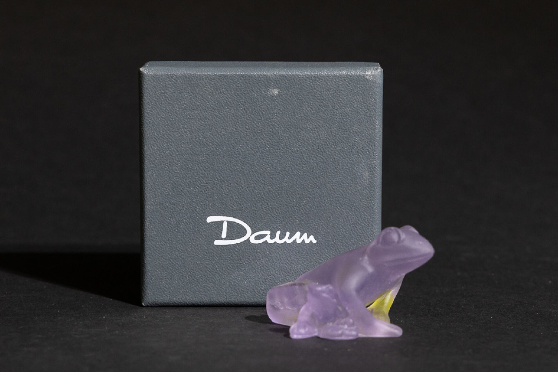 Maison DAUM France. Grenouille rainette et son petit. Sujet en pâte de verre lilas, signé au revers. Avec sa boîte d'origine. Haut. : 3,5 cm