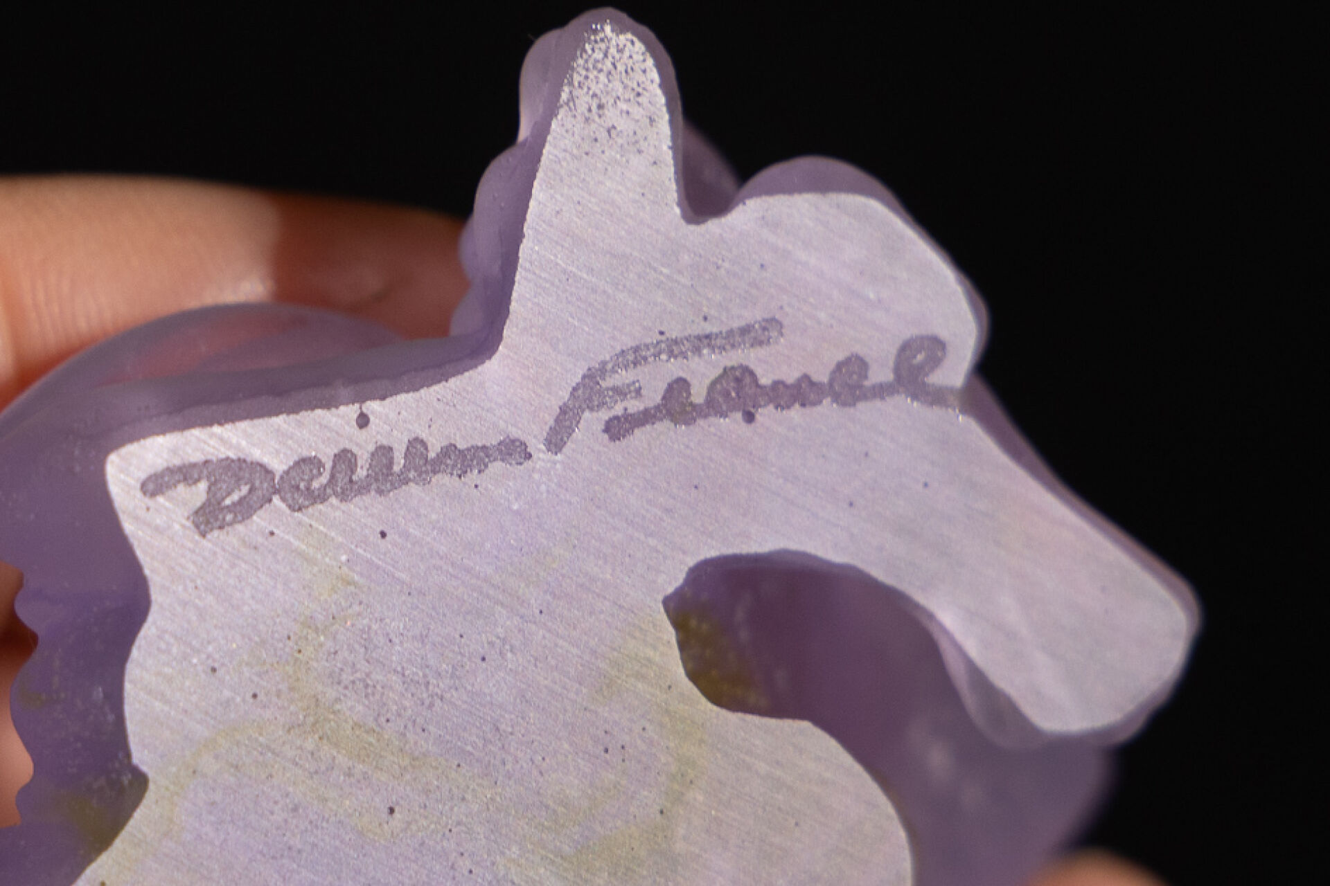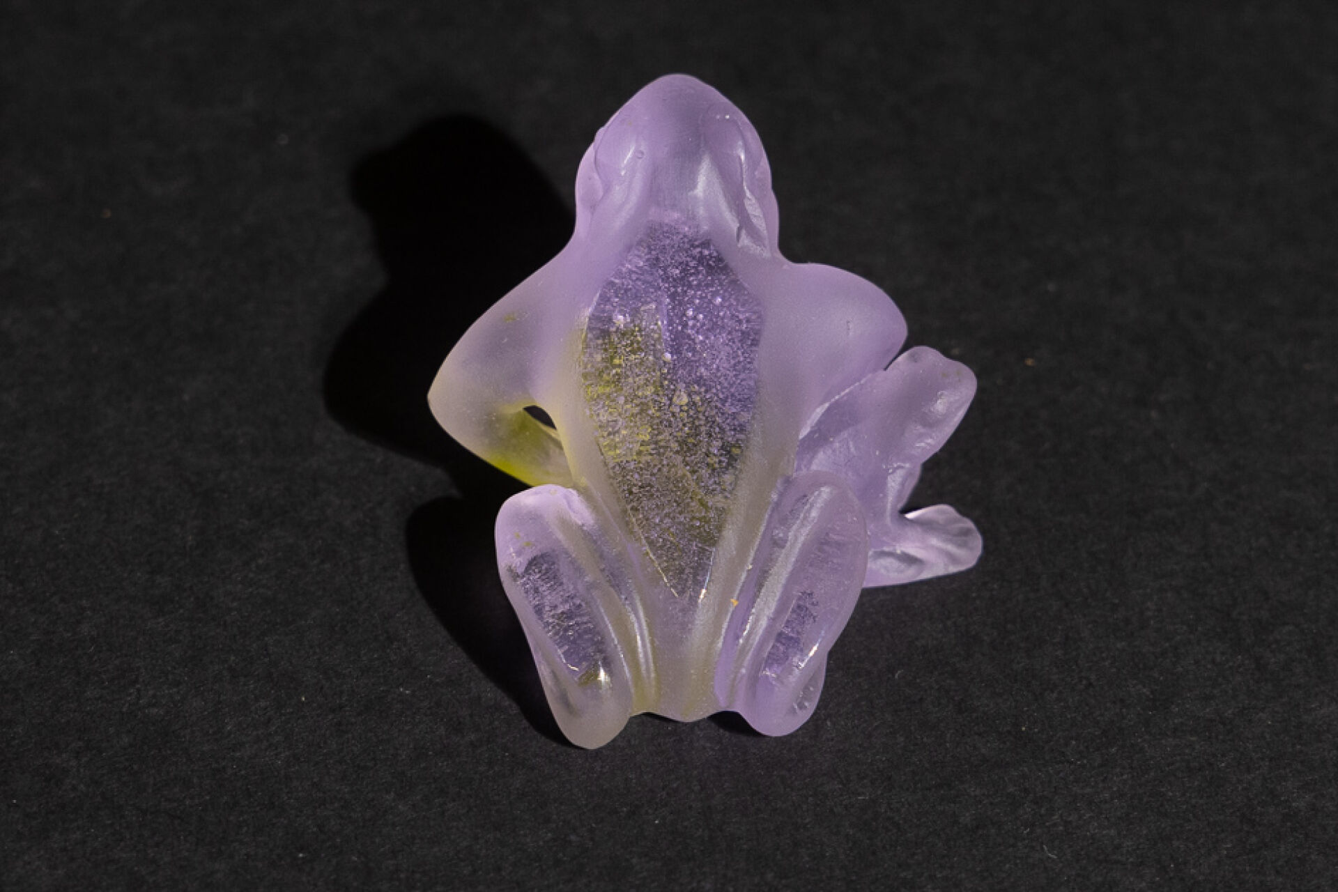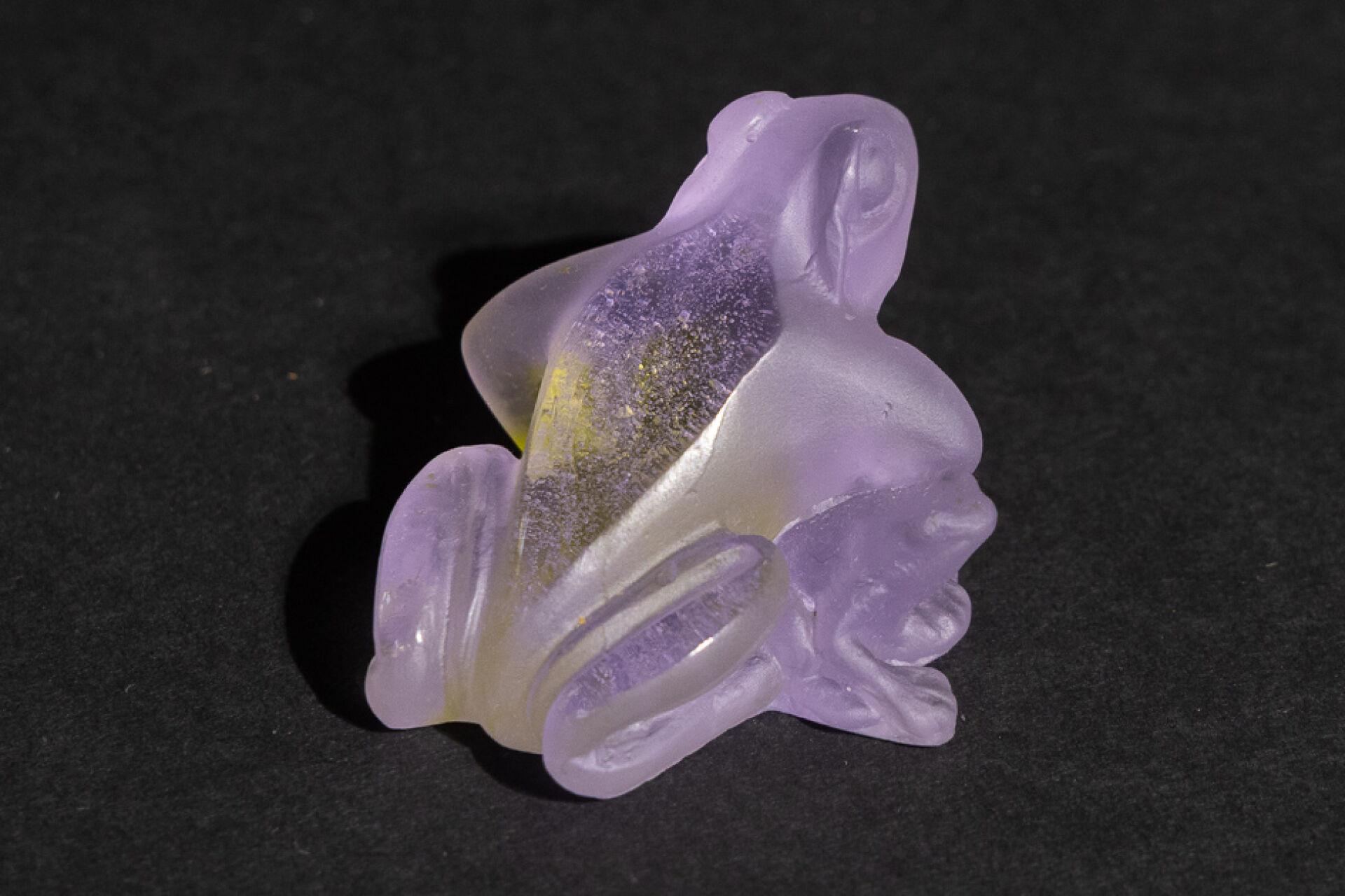 Maison DAUM France. Grenouille rainette et son petit. Sujet en pâte de verre lilas, signé au revers. Avec sa boîte d'origine. Haut. : 3,5 cm