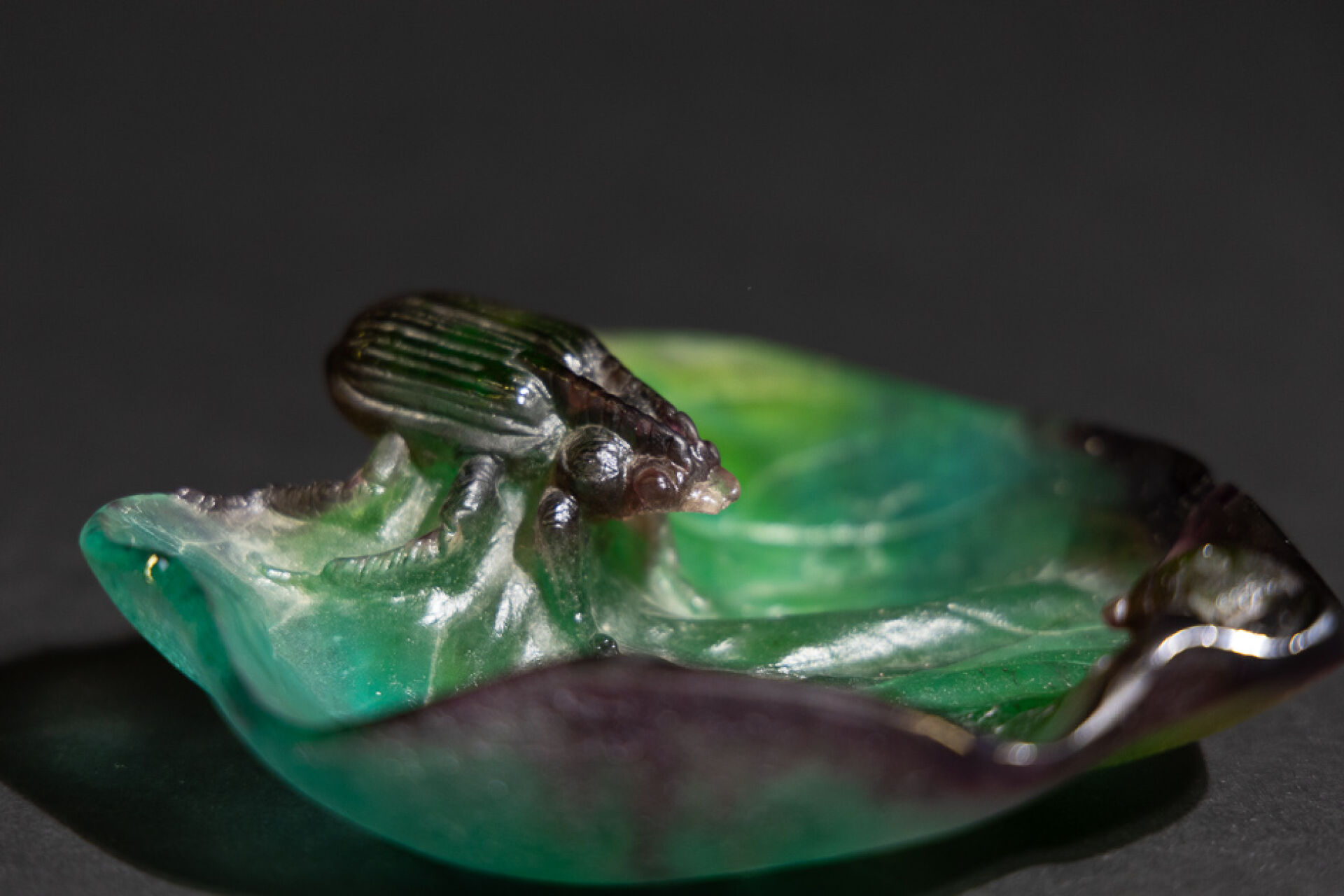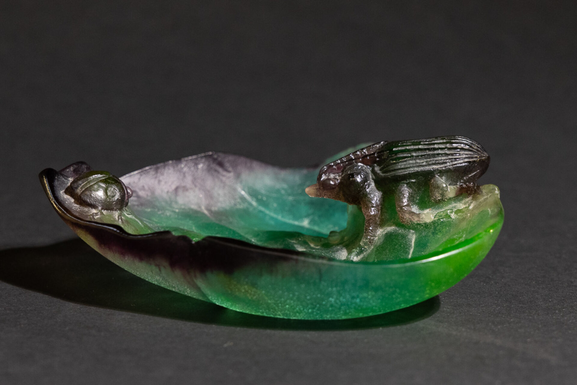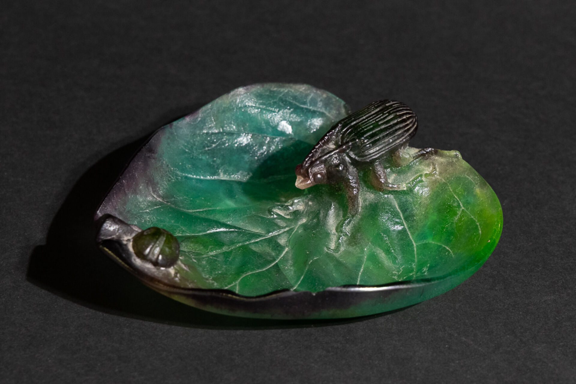 Maison DAUM France. Vide-poche en pâte de verre figurant un scarabée et une coccinelle sur une feuille dans les tons vert et mauve, signé au revers (éclat et fêle). Haut. : 5 cm - Larg. : 16,5 cm