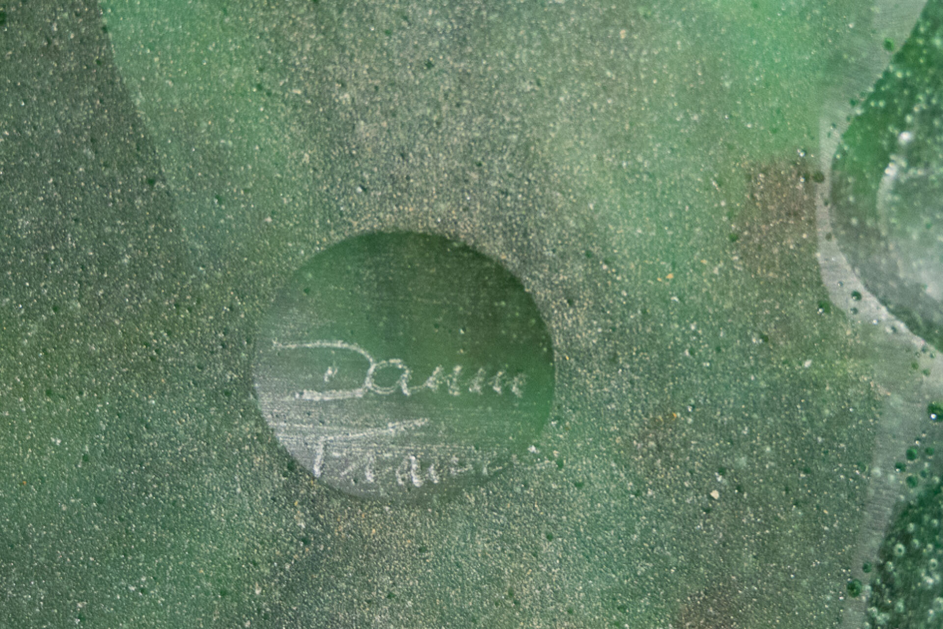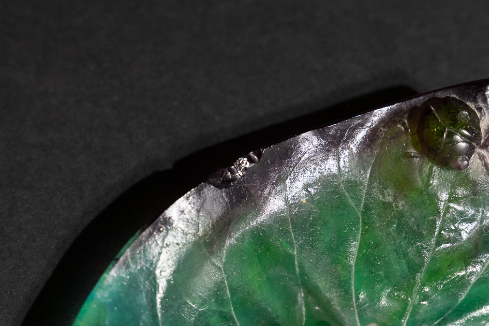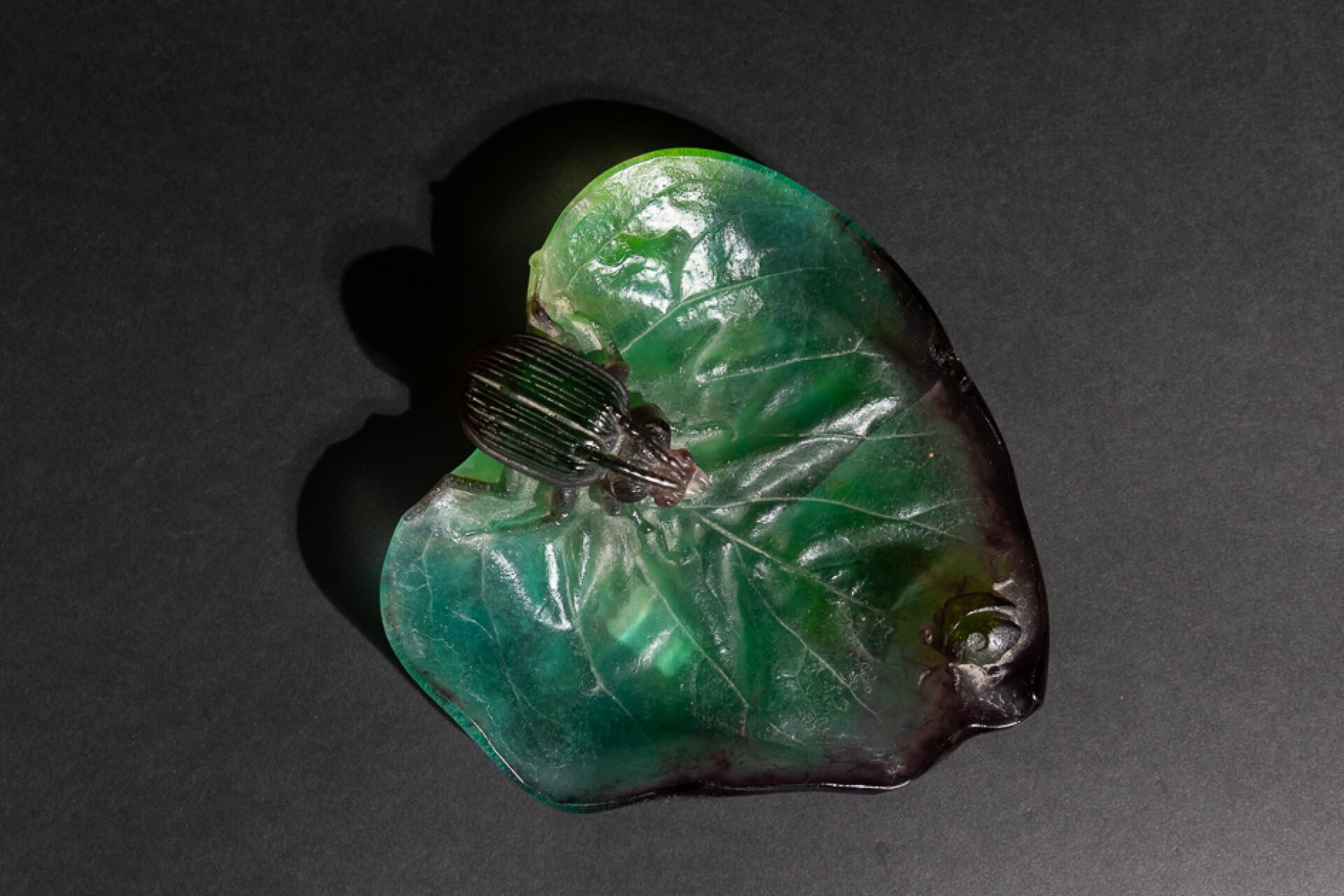 Maison DAUM France. Vide-poche en pâte de verre figurant un scarabée et une coccinelle sur une feuille dans les tons vert et mauve, signé au revers (éclat et fêle). Haut. : 5 cm - Larg. : 16,5 cm