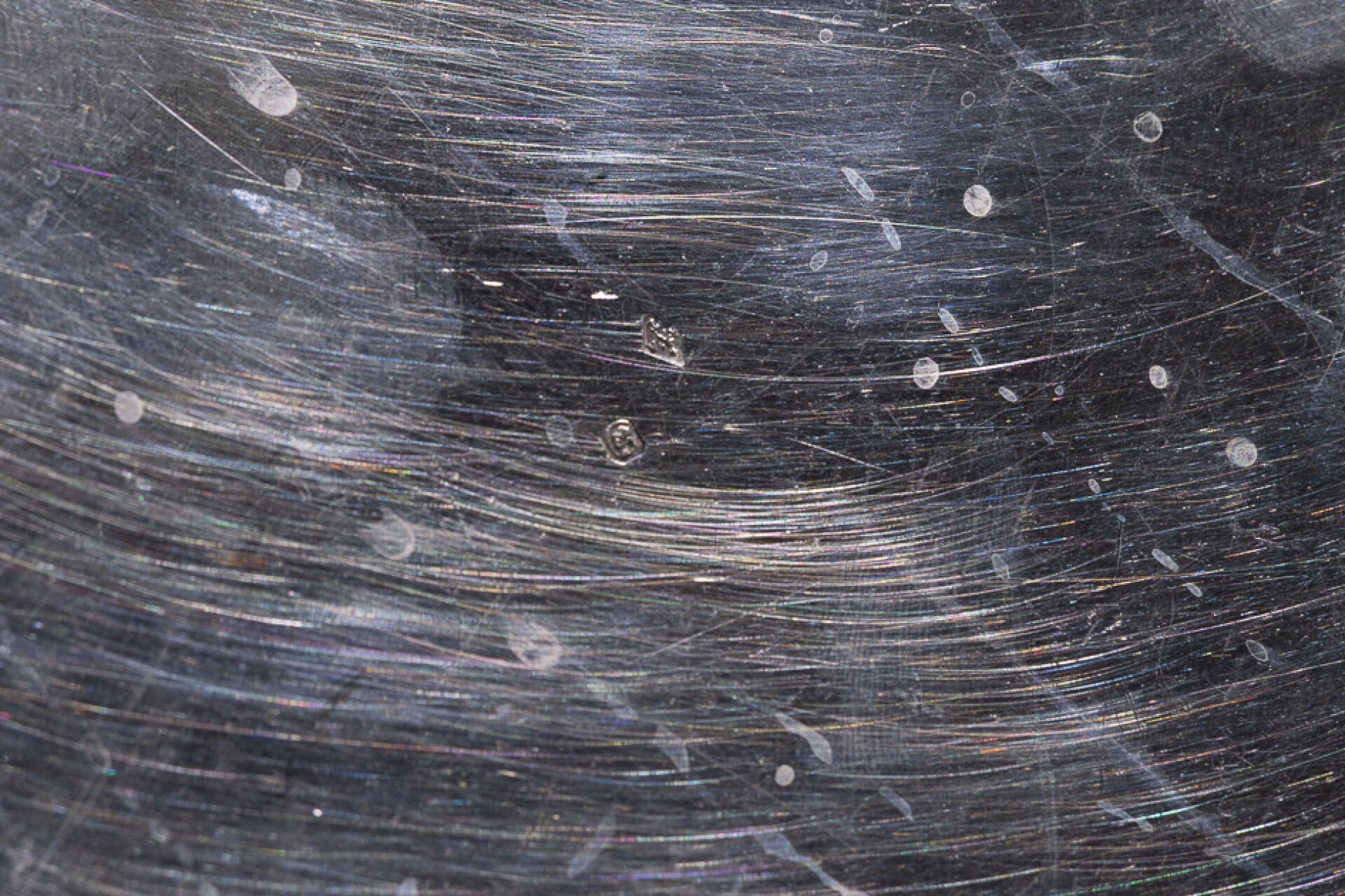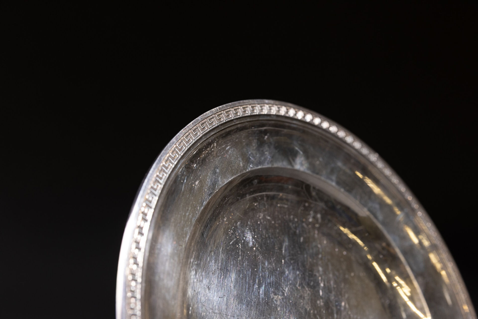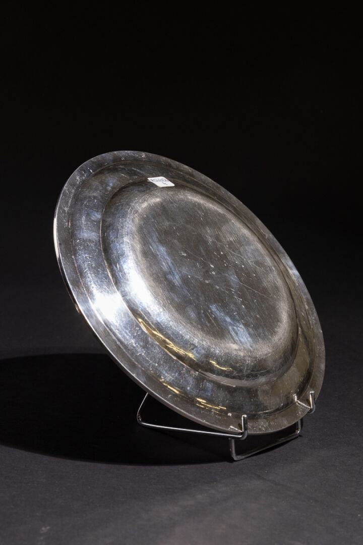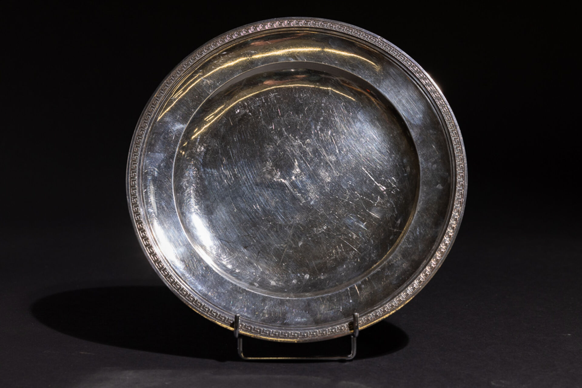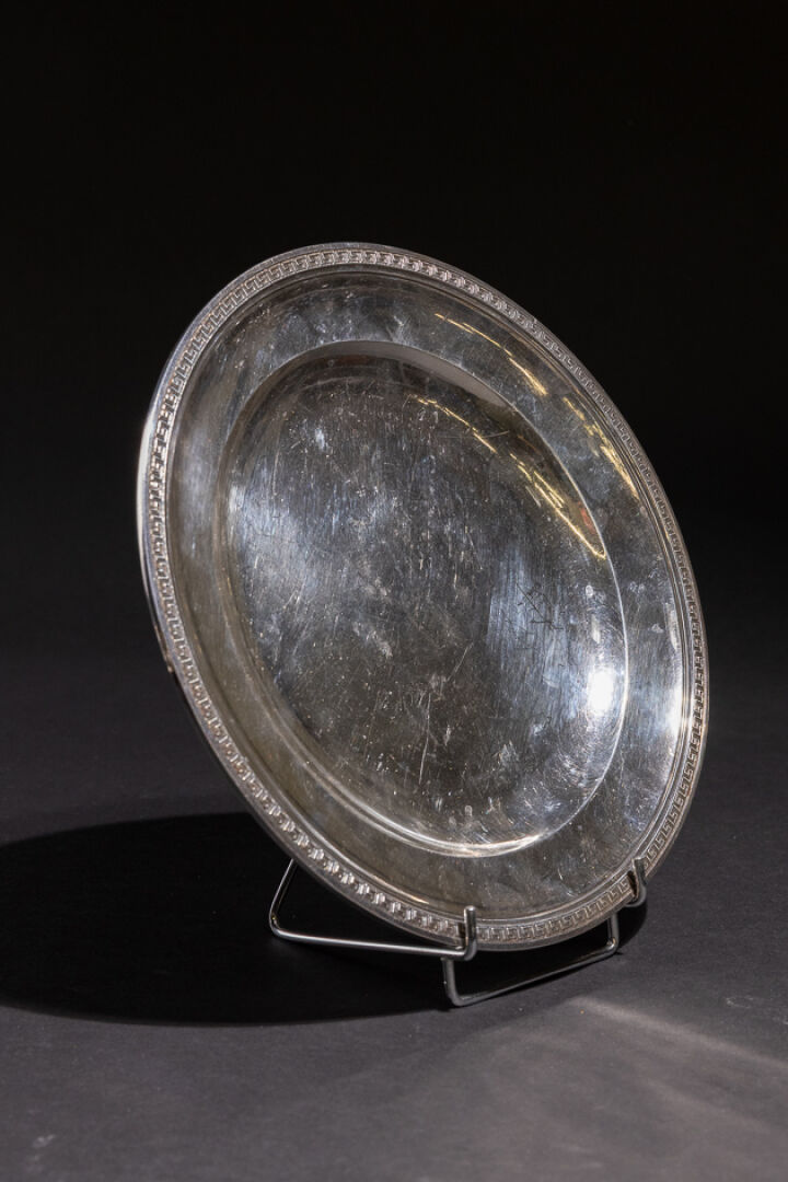 Assiette en argent, la bordure à méandres, l'aile anciennement monogrammée (rayures d'usage). Poinçon Minerve Orfèvre : ATA. Poids : 671.09 g