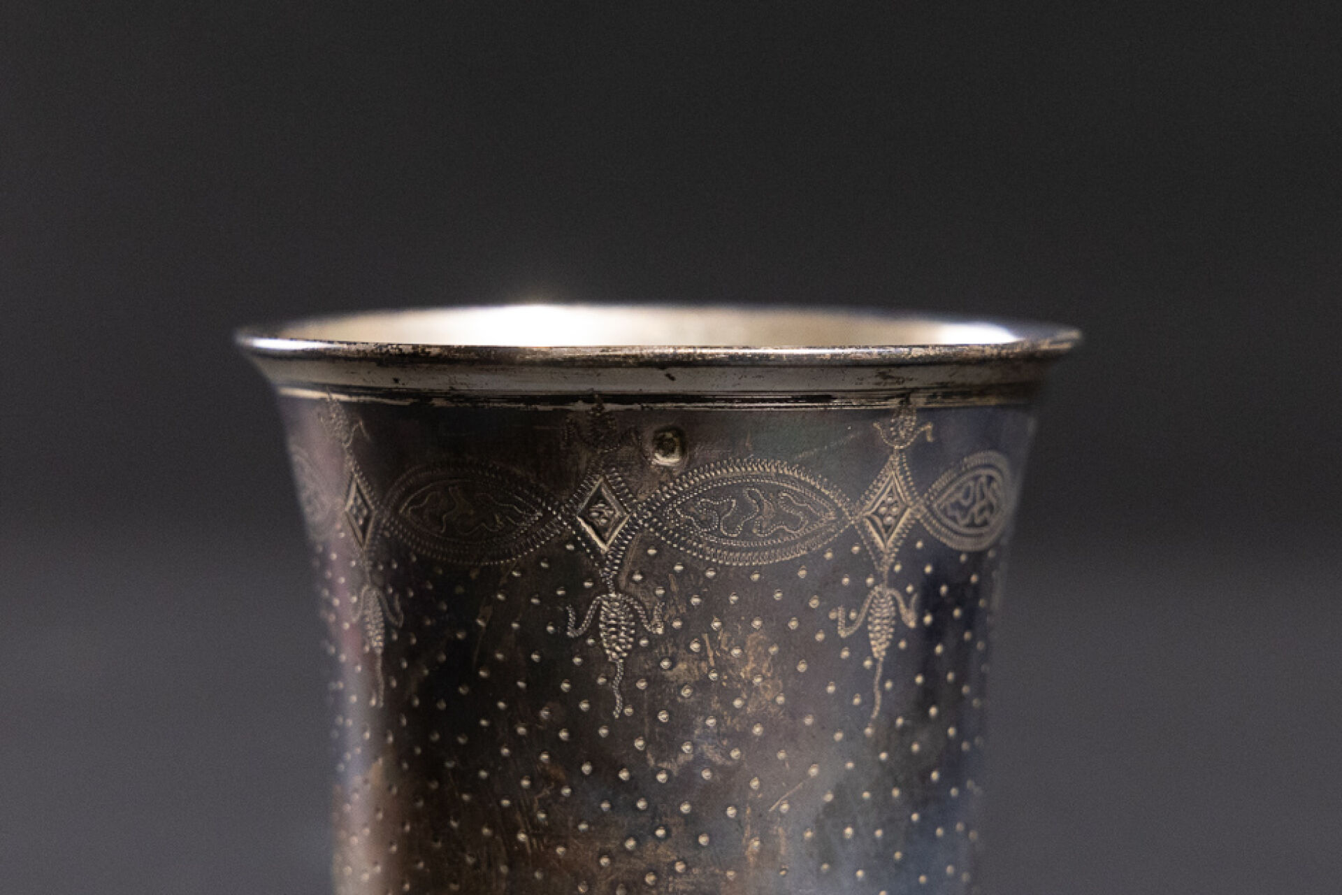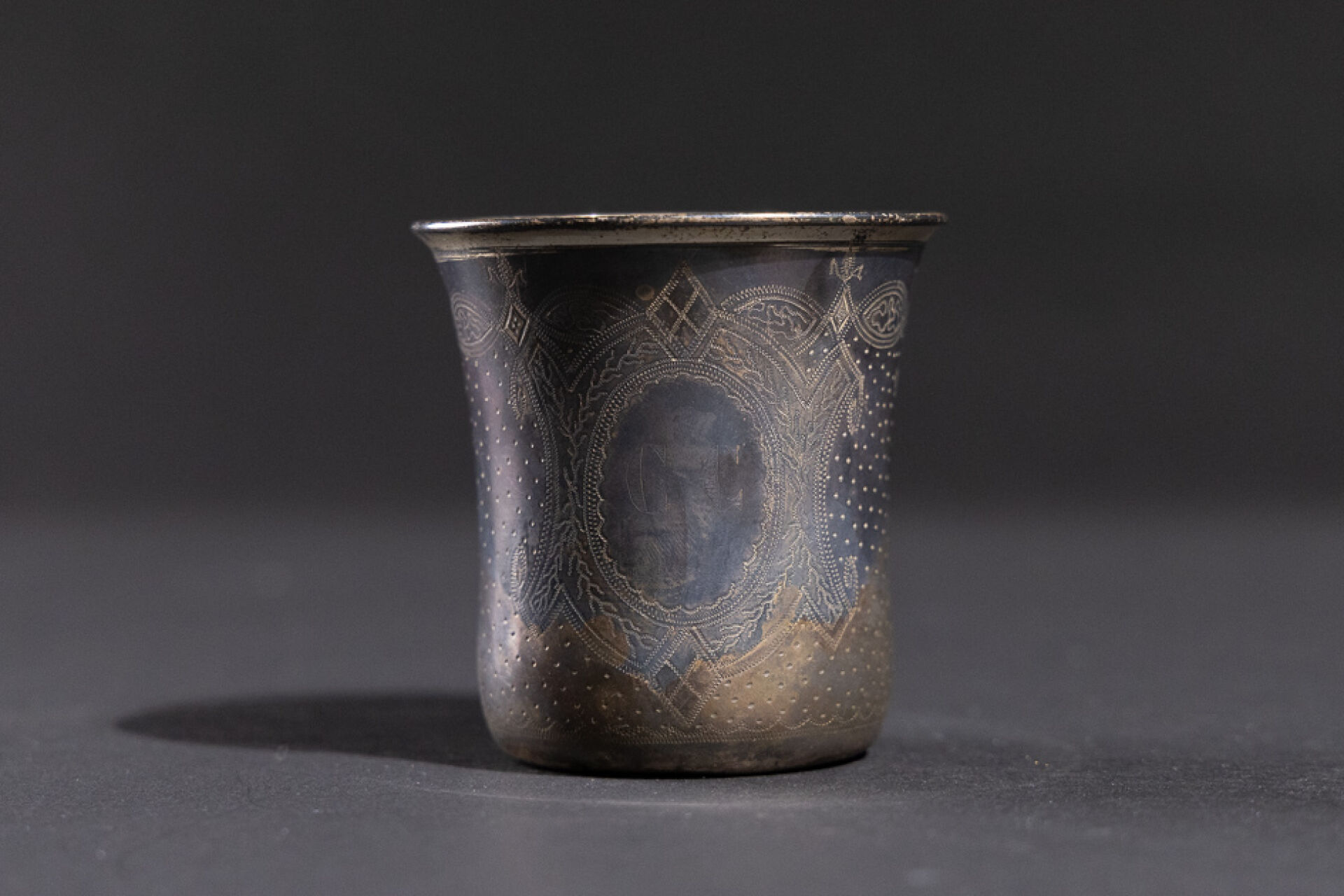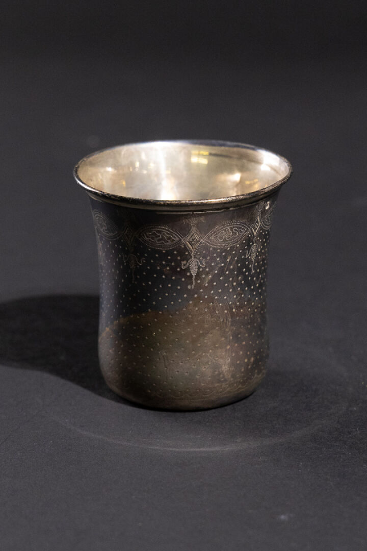 Timbale en argent à décor de semi de points et d'un cartouche monogrammé C.C. (chocs). Poinçon Minerve Orfèvre : Ernest BUNET (actif de 1855 à 1886). Poids : 74,99 g - Haut. : 8 cm