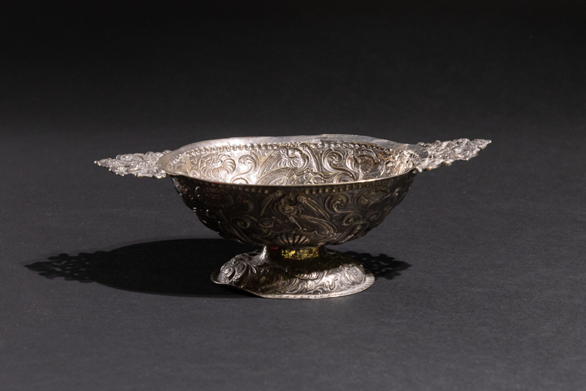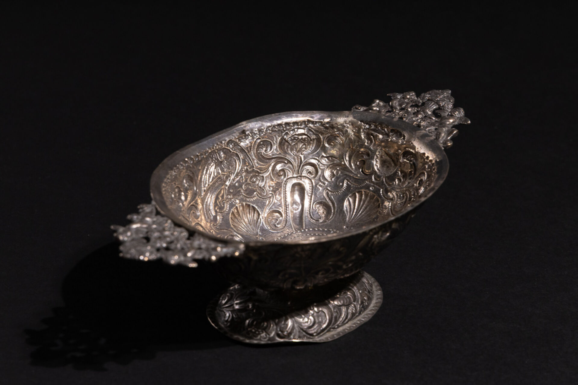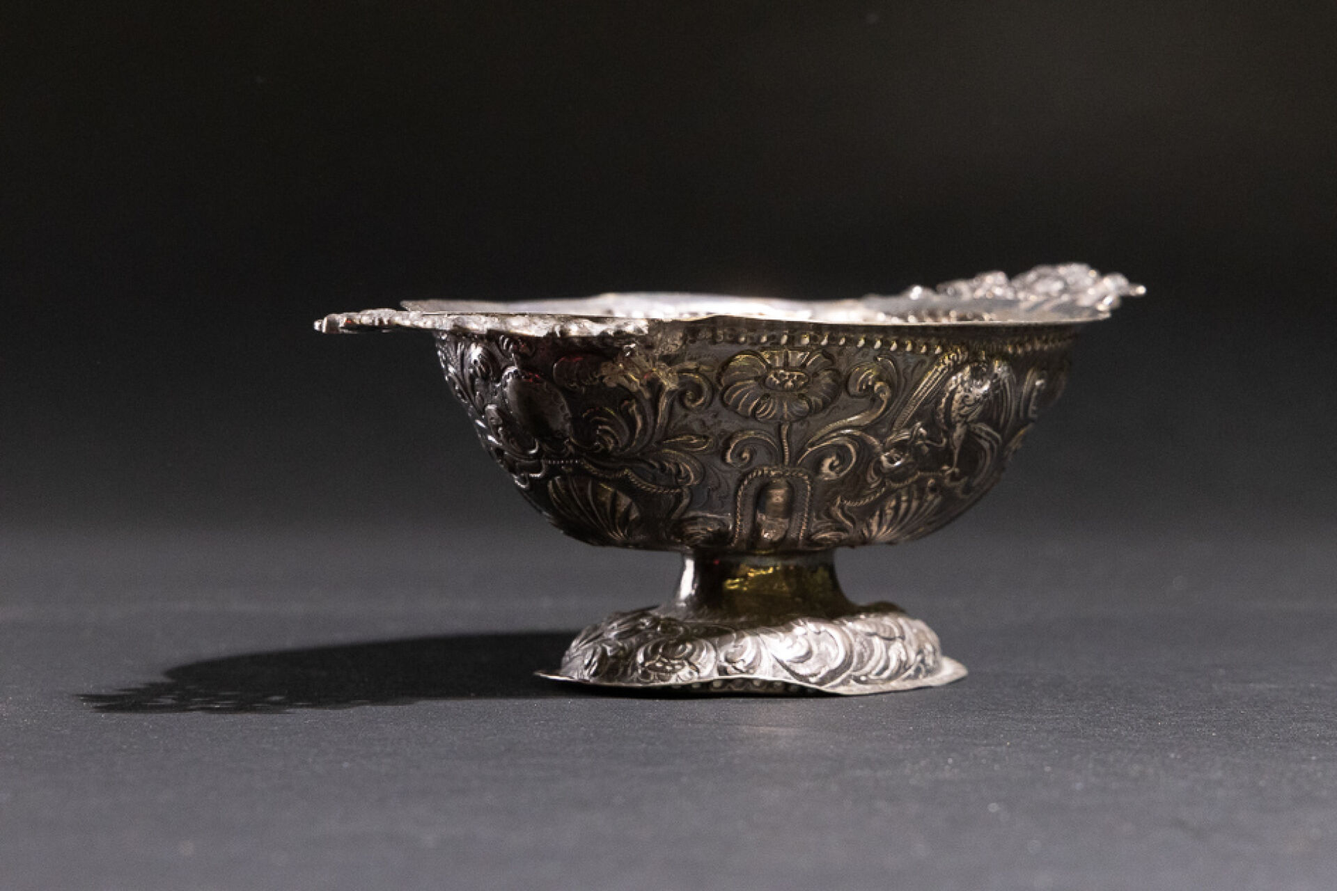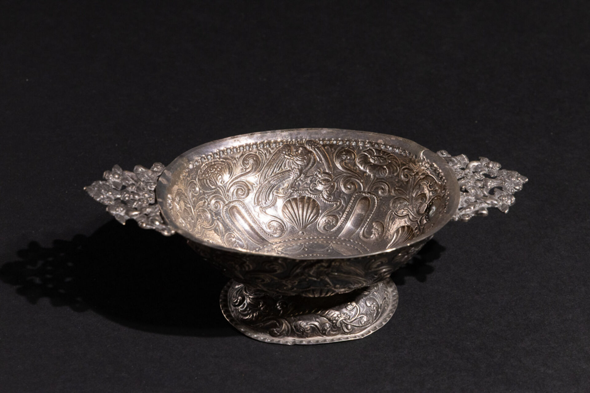 Coupe ovoïde en argent à décor repoussé de fleurs et coquilles, les anses en angelots affrontés centrés d'un bouquet de fleurs (restaurations, chocs). Travail probablement étranger XVIIIe siècle. Poids. : 175,91 g