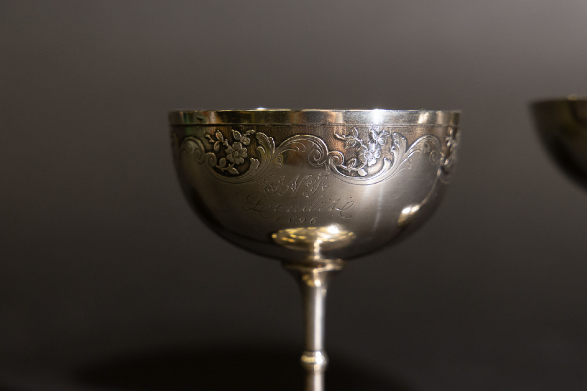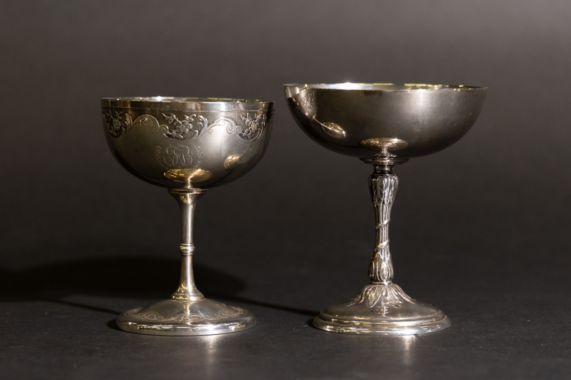 Deux coupes en argent (traces d'usage) comprenant : Coupe monogrammée CH, le fût orné de feuillage (restaurations). Travail étranger. Haut. : 12 cm Coupe ornée d'une frise de volutes fleuries, monogrammée FB et gravée Championnat de France 1897. Poinçon Minerve. Haut. : 11,3 cm. Poids total : 312,99 g