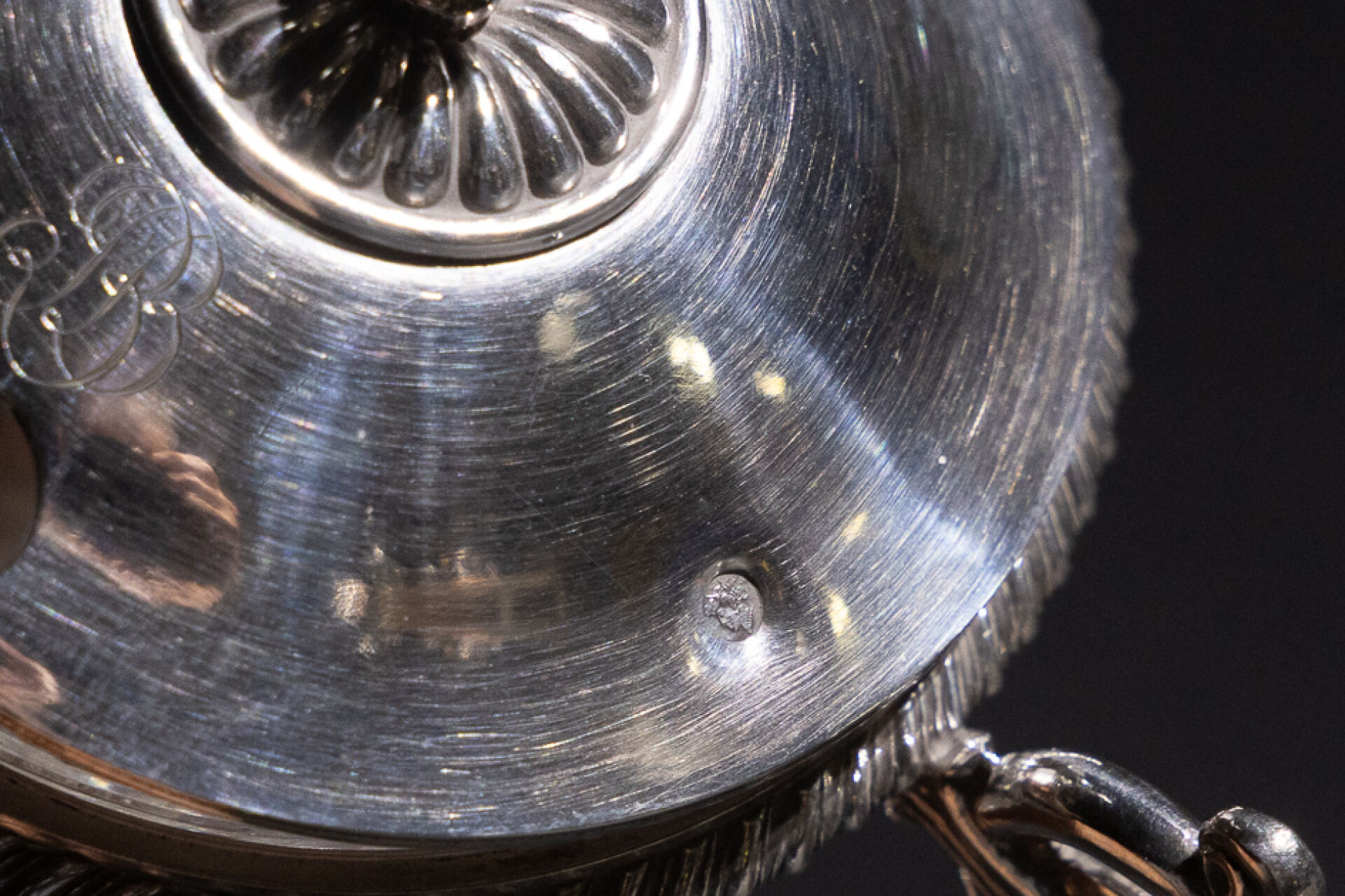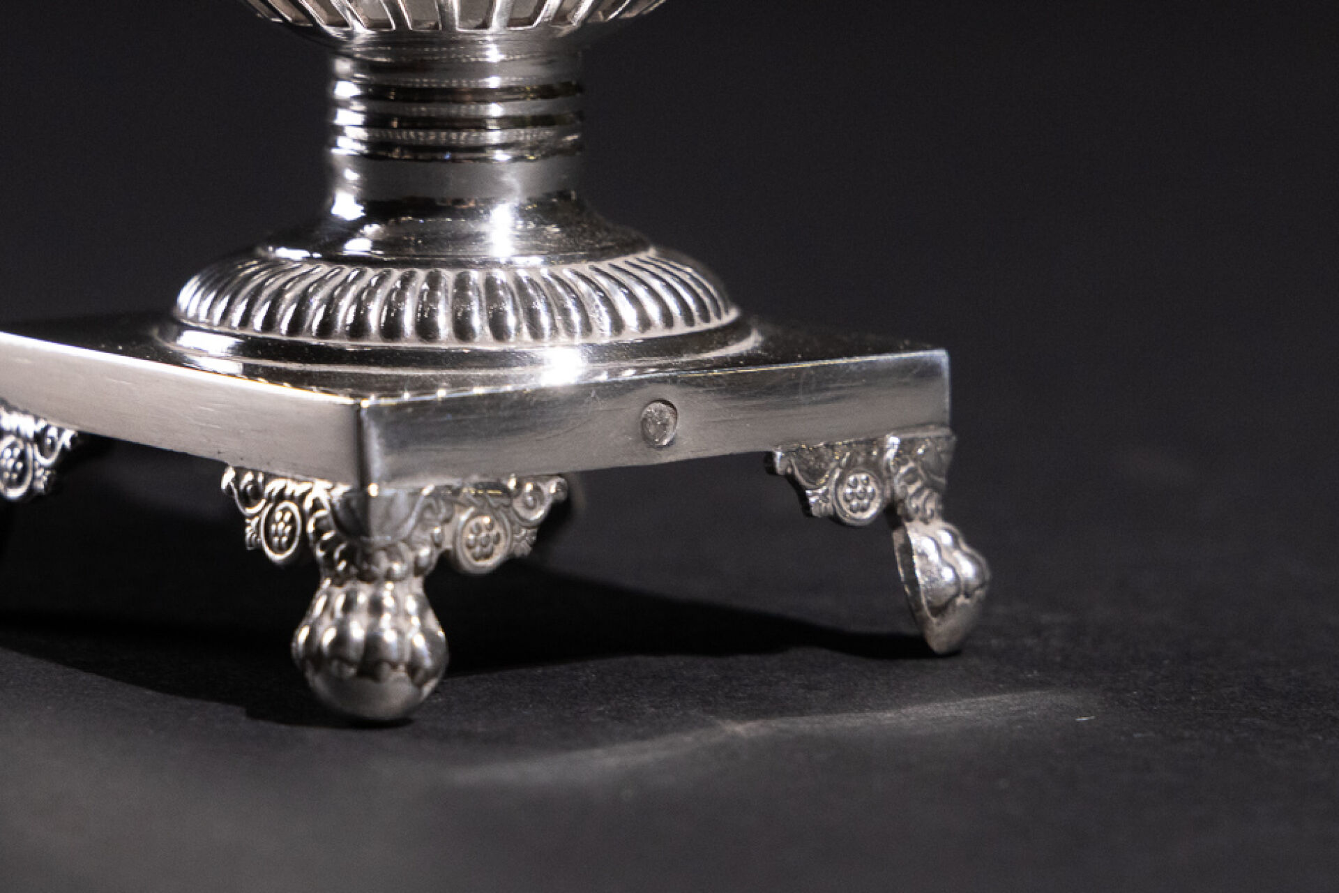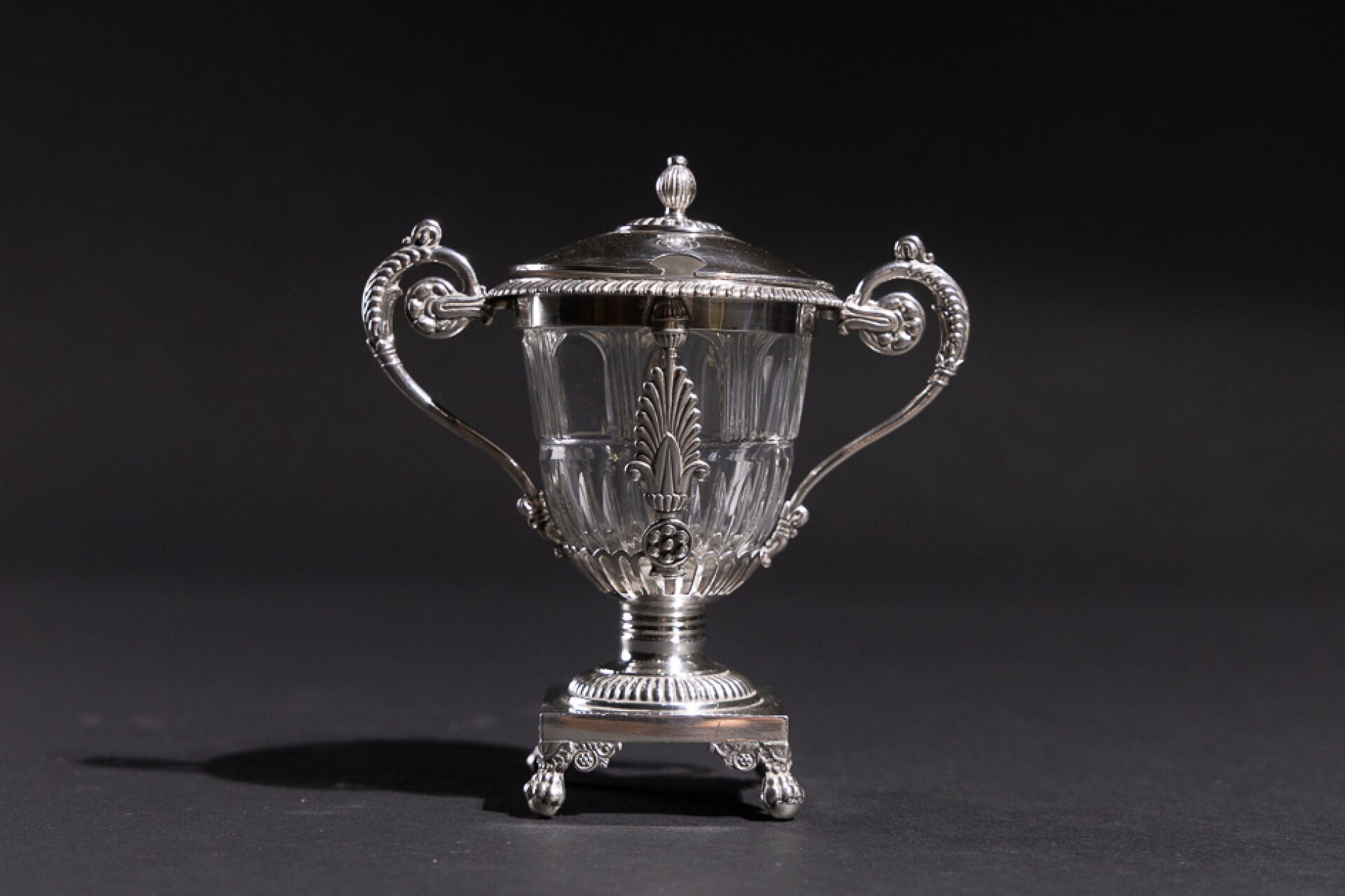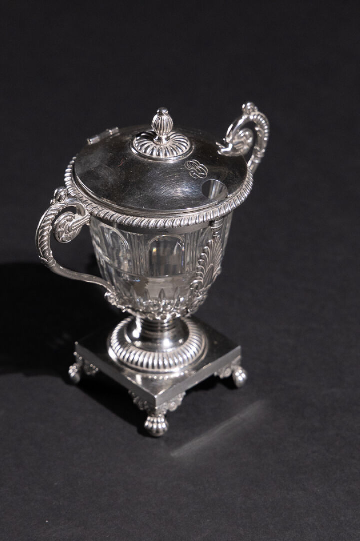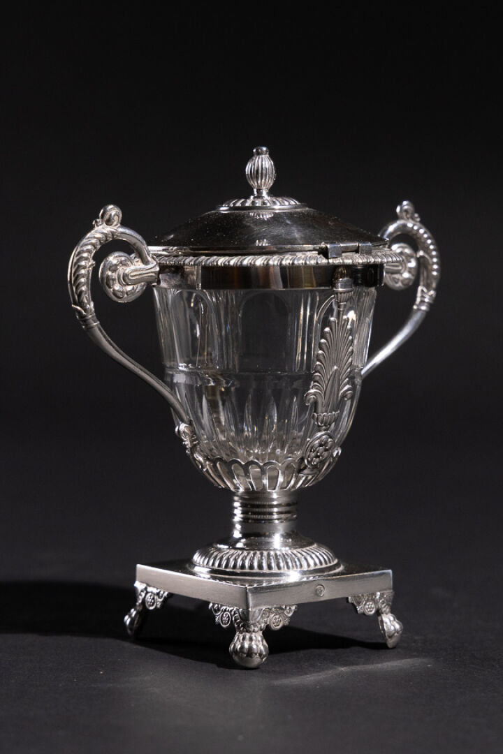 Moutardier à deux anses en argent et doublure en verre, à décor ajouré de godrons et palmettes, monogrammé BB, piètement carré reposant sur quatre pieds griffus (restauration au frétel). Poinçon Vieillard (1819-1838). Orfèvre : Jean-Pierre-Nicolas BIBRON (?) Poids argent : 142,61 g - Haut. : 13,5 cm - Larg. : 13 cm