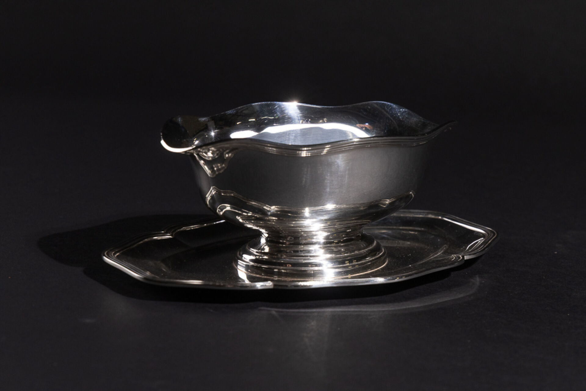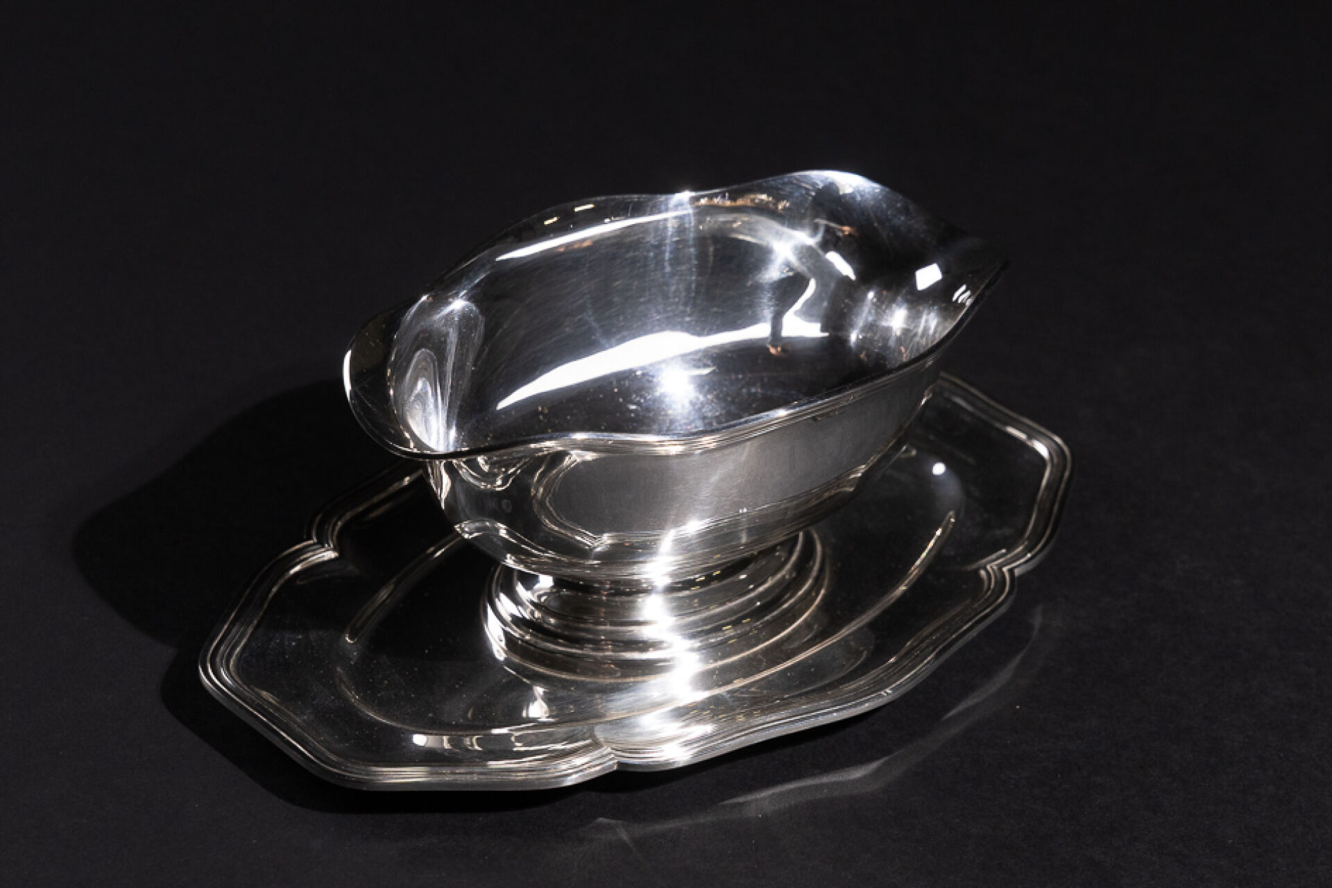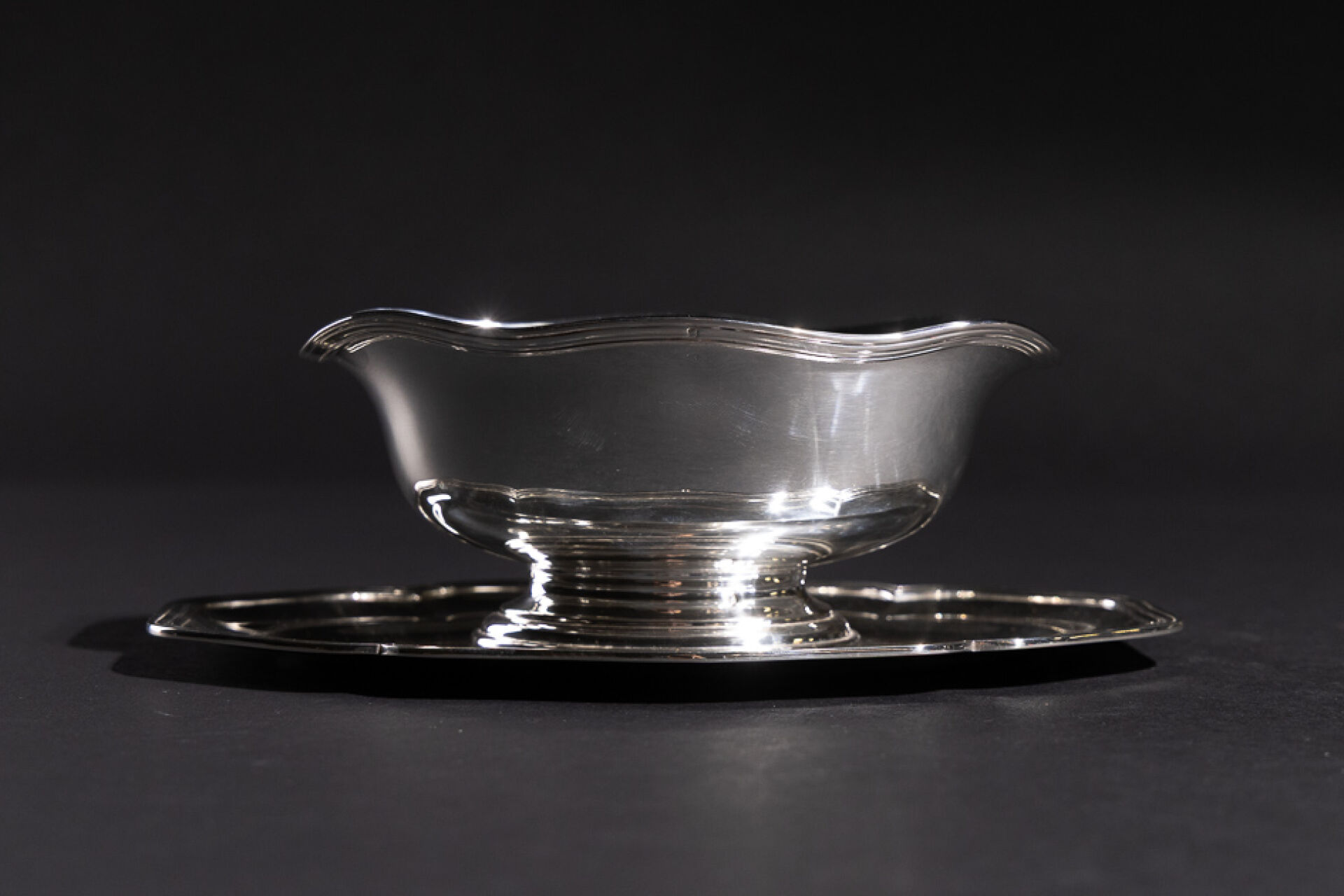 Saucière et son dormant fixe en argent, dormant polylobé à décor de filets. Poinçon Minerve. Orfèvre ME. Poids : 551,88 g - Haut. : 8 cm - Larg. : 24 cm - Prof. : 15 cm