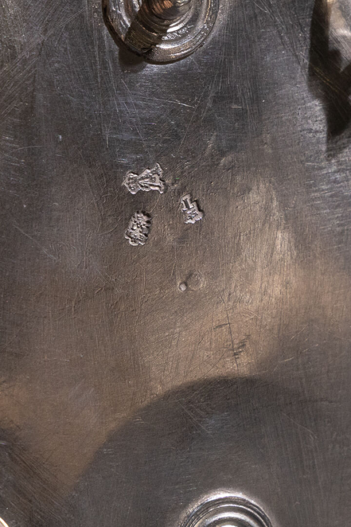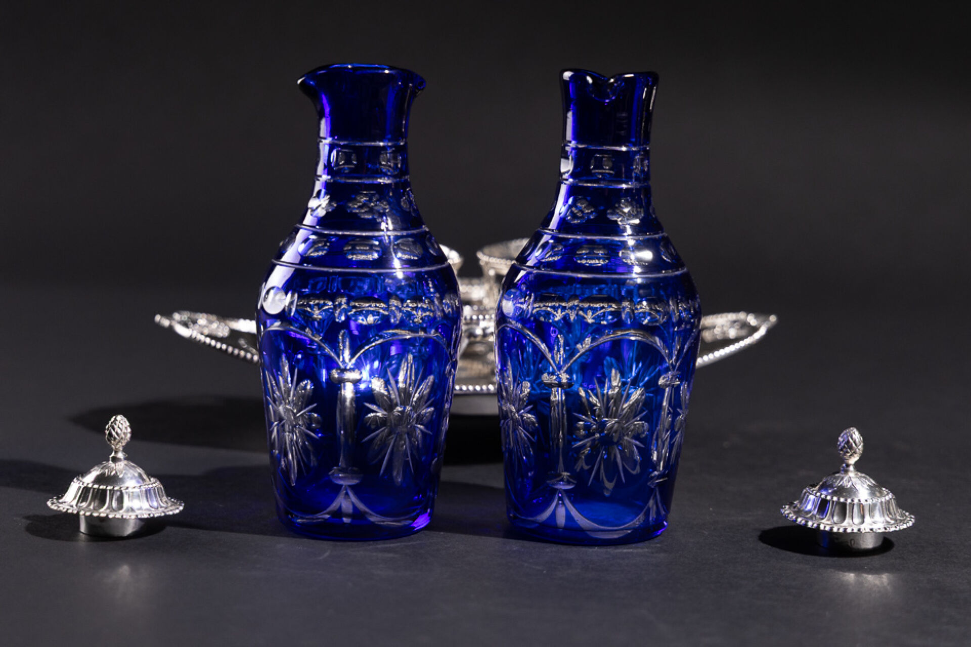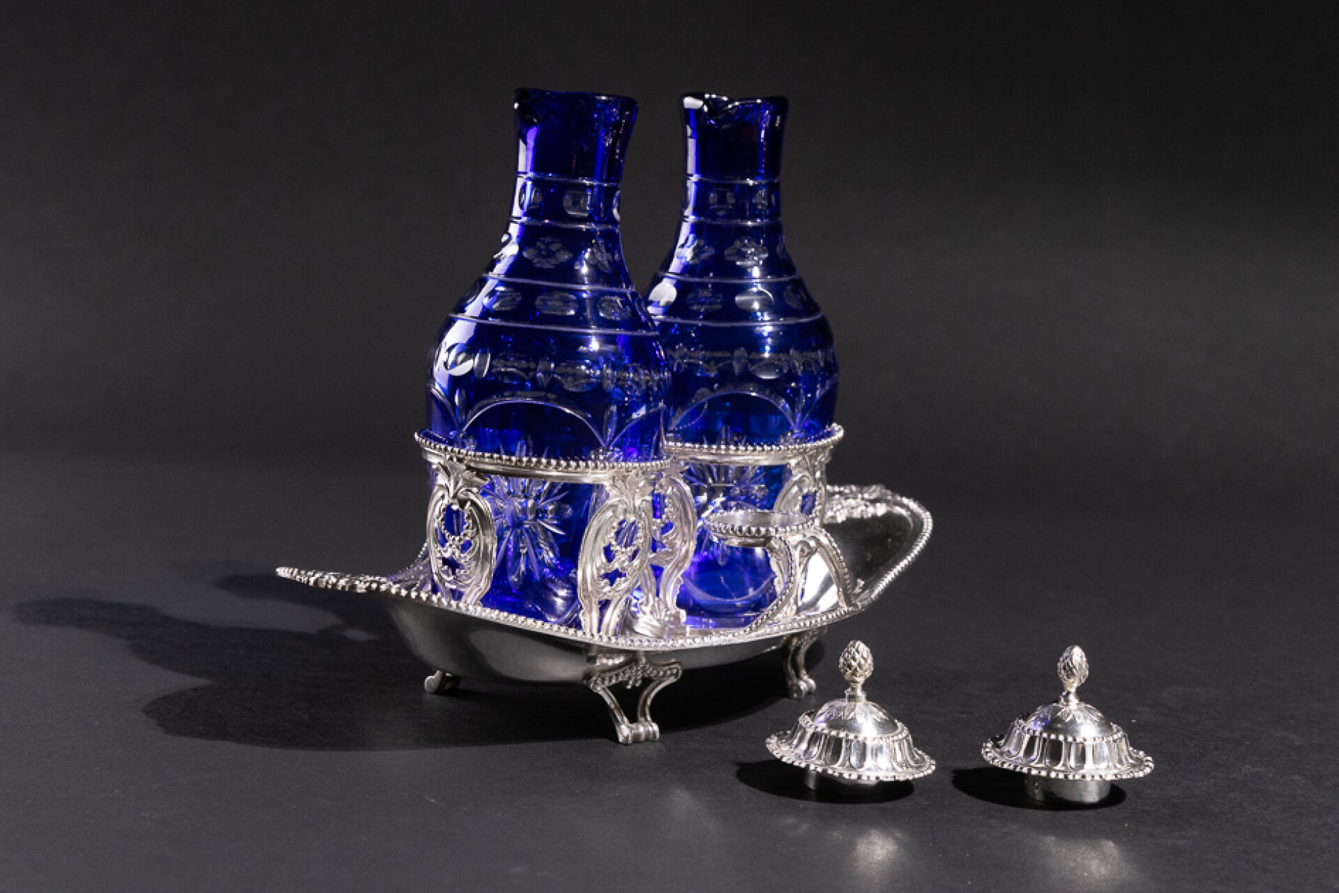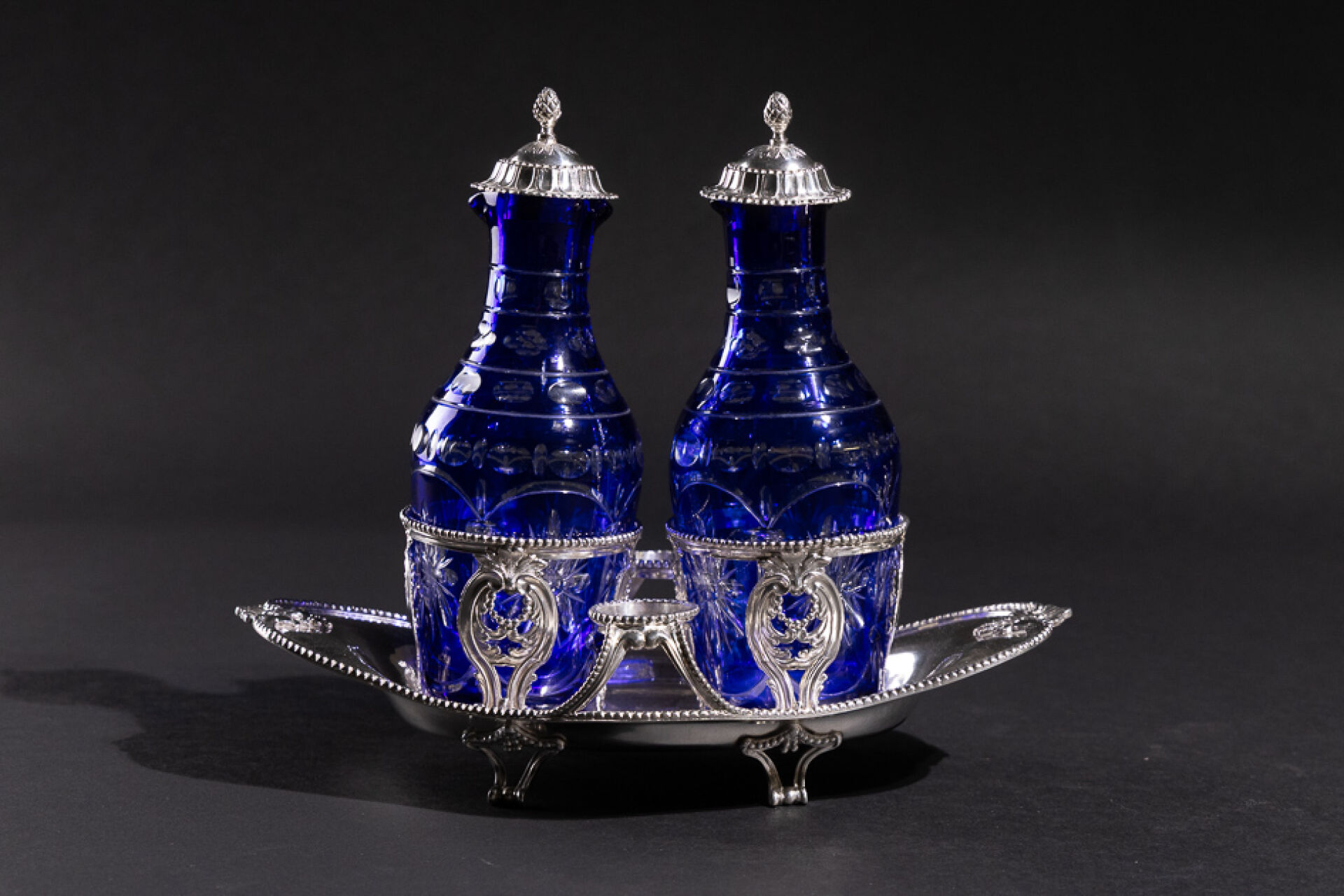 Huilier-vinaigrier en argent à décor de frises de perles, volutes et feuillages. Le bassin ovale repose sur quatre pieds à enroulement. Deux burettes en cristal taillé bleu, bouchons en argent à décor de perles et godrons, frétel en pomme de pin (accidents et restaurations). Armoiries timbrées d'une couronne comtale de la famille Rollée de La Moinerie. Paris, 1782-1783. Maître Orfèvre Louis Joseph BOUTY, dit MILLERAUD BOUTY, reçu maître en 1779. Poids argent : 510,85 g - Haut. hors burettes : 8,5 cm - Larg. : 27 cm - Prof. : 15 cm