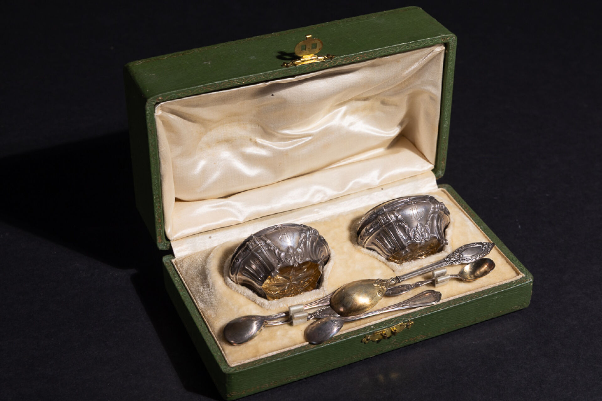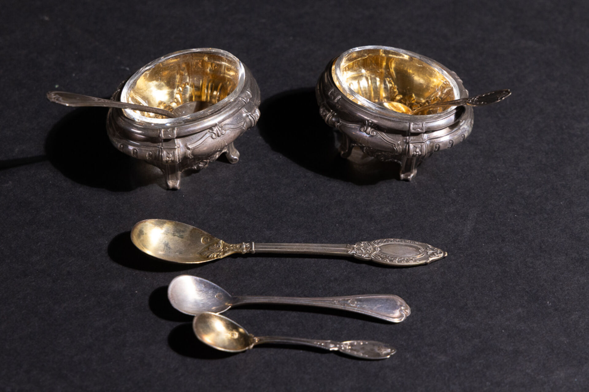Paire de salerons en argent de forme tombeau à ciselure de cannelures, godrons, cartouches monogrammés et feuilles d'acanthe, avec cuillère à sel au cuilleron vermeillé, doublure en verre, écrin à forme. Poinçon Minerve Orfèvre Émile François. Poids : 38.32 gr On joint : Ensemble de trois cuillères en argent, dont paire de cuillères de saleron à motif filet à feuilles d'acanthe et lys stylisé et cuillère à moutarde au cuilleron vermeillé à feuille d'acanthe. Poinçon Minerve. Poids : 26.42 gr