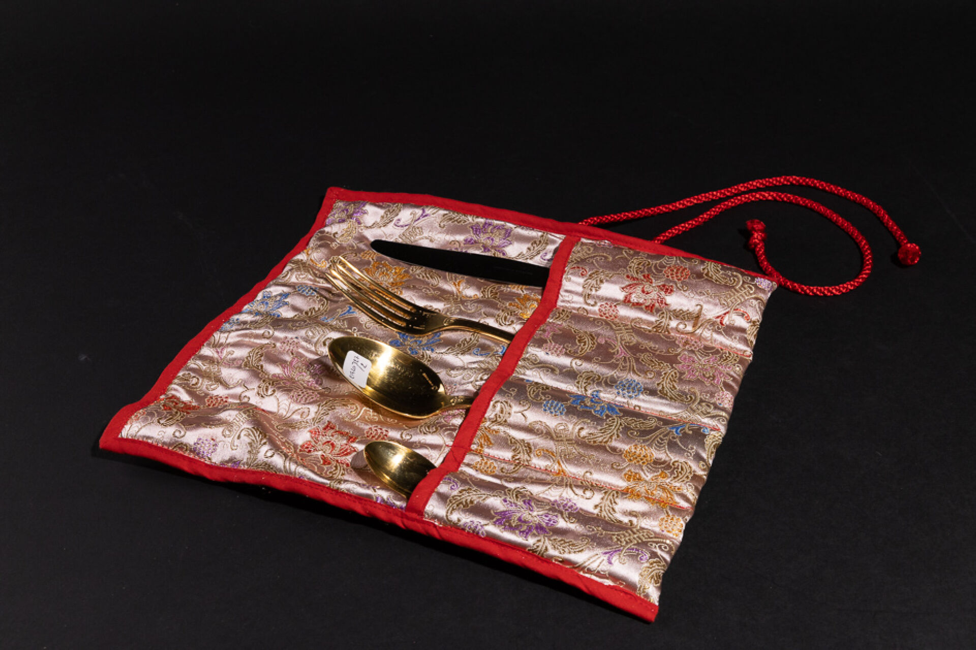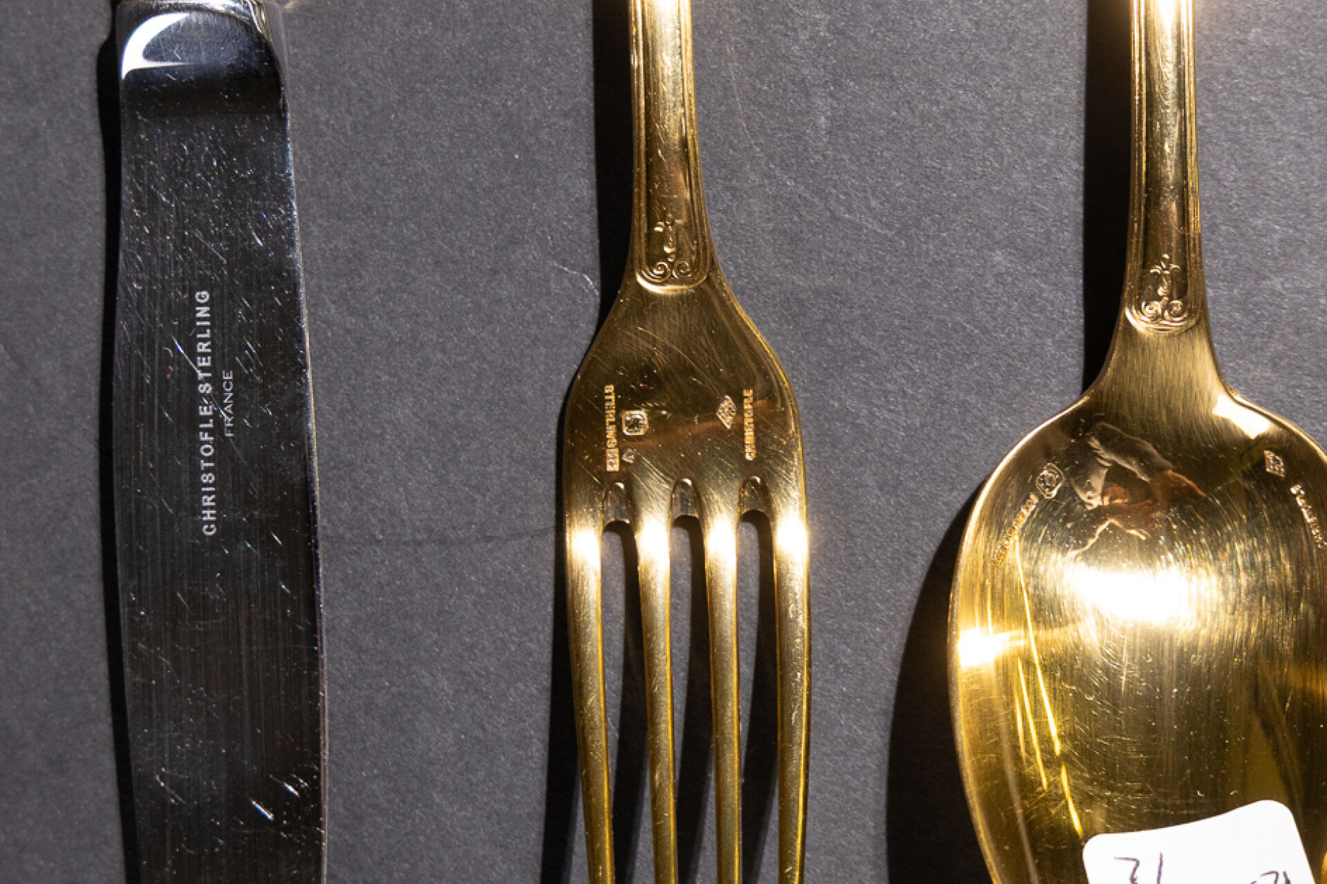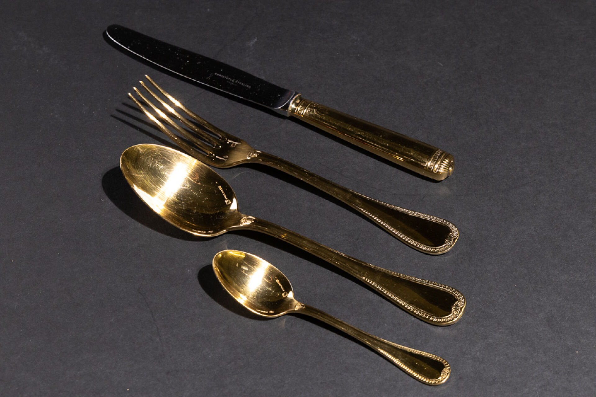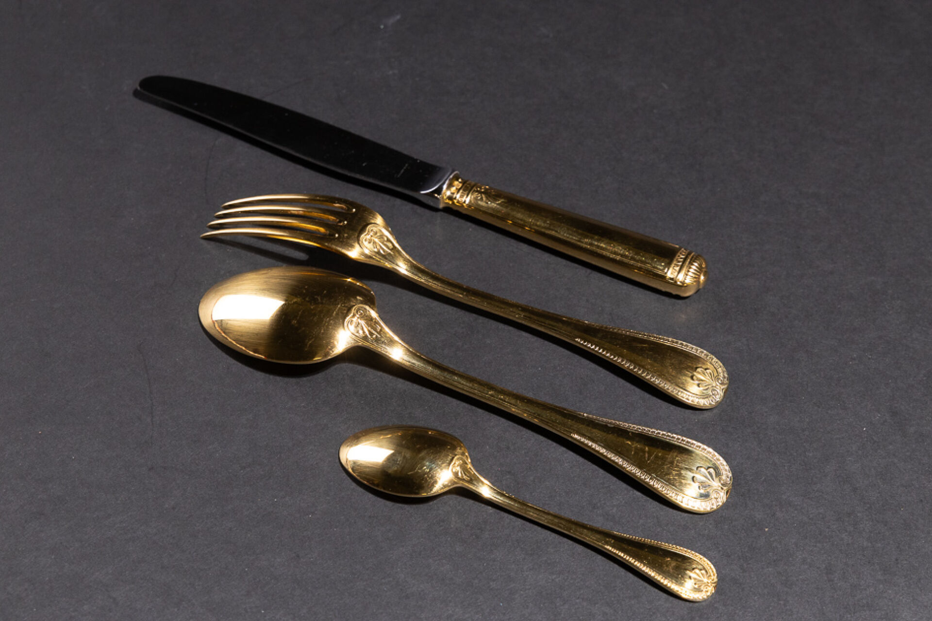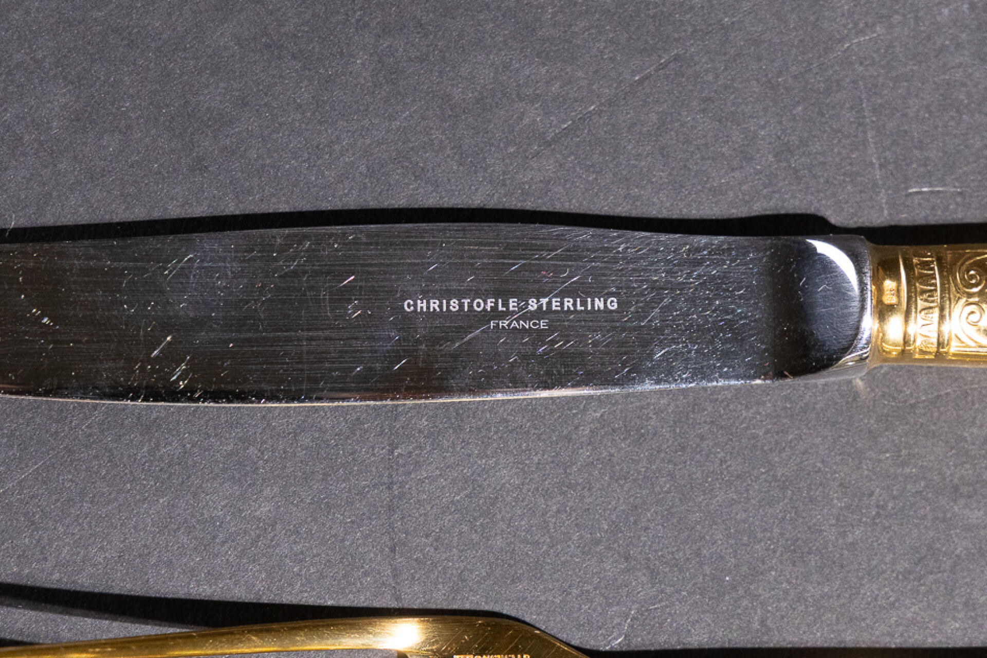Maison CHRISTOFLE. Couvert en vermeil modèle MALMAISON comprenant : - Couvert, - Cuillère à dessert, - Couteau. Poids net total : 231.79 g - Poids du couteau : 90.08 g Dans un étui en tissu rose à motifs sinisants.