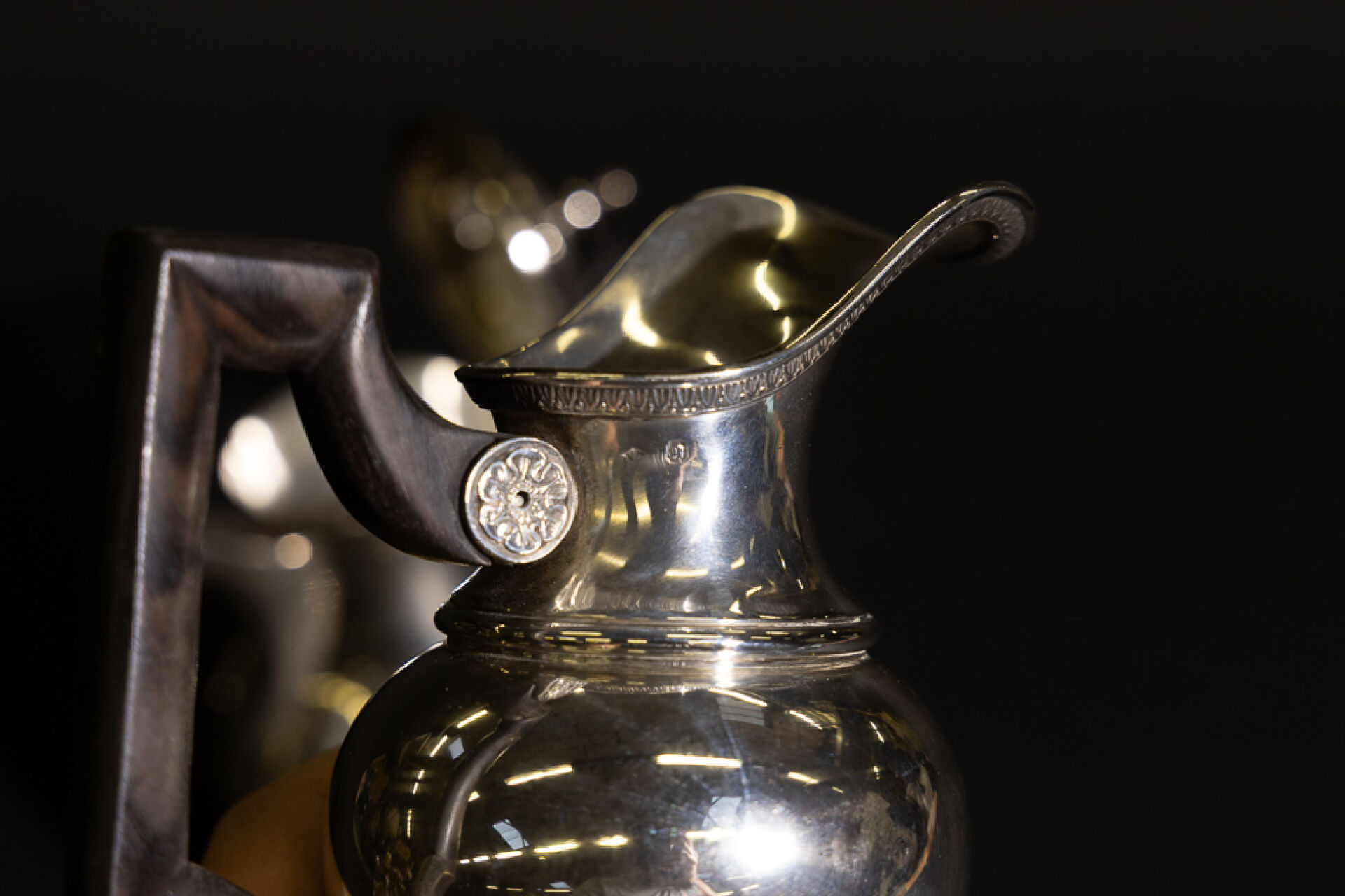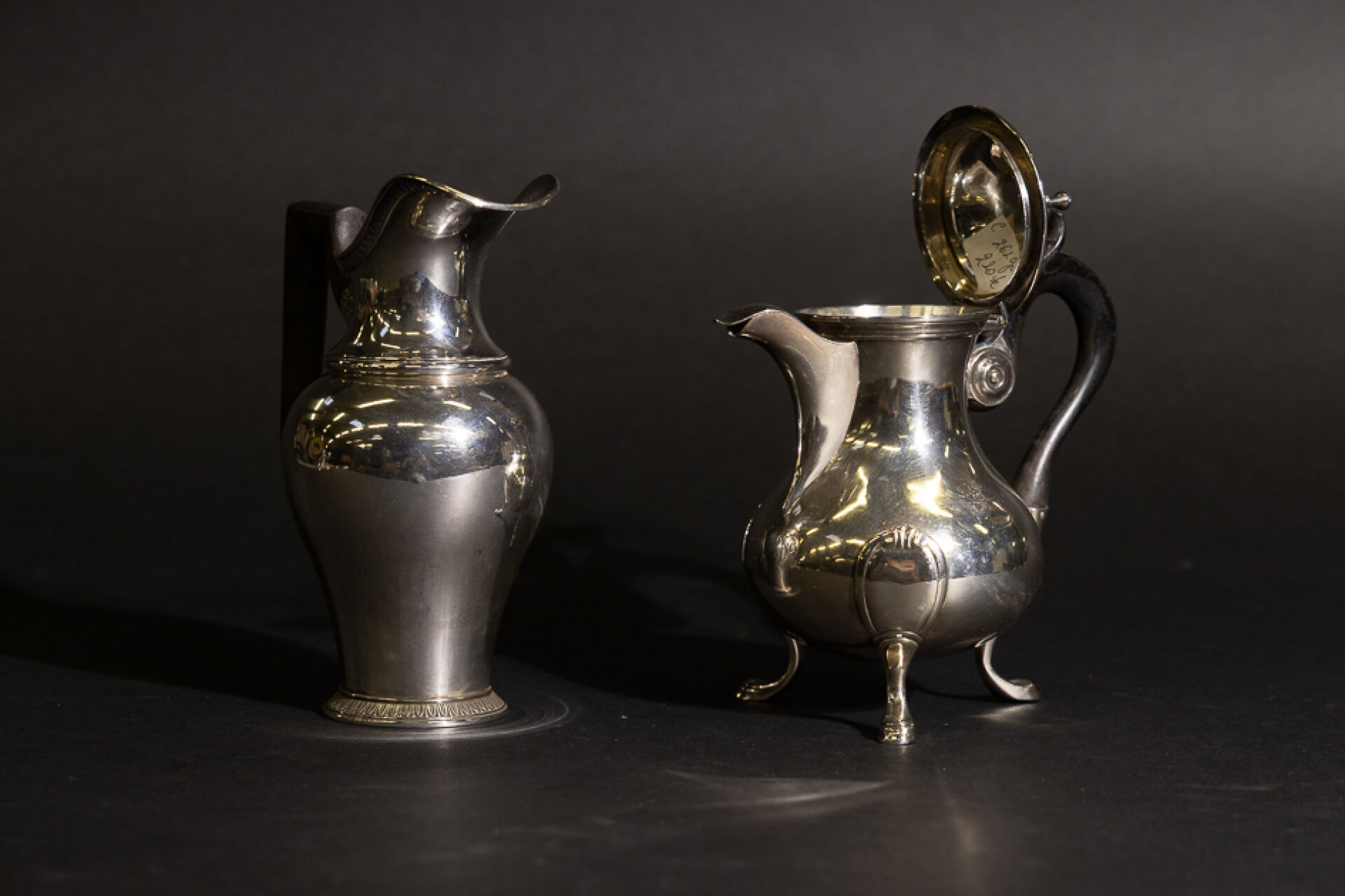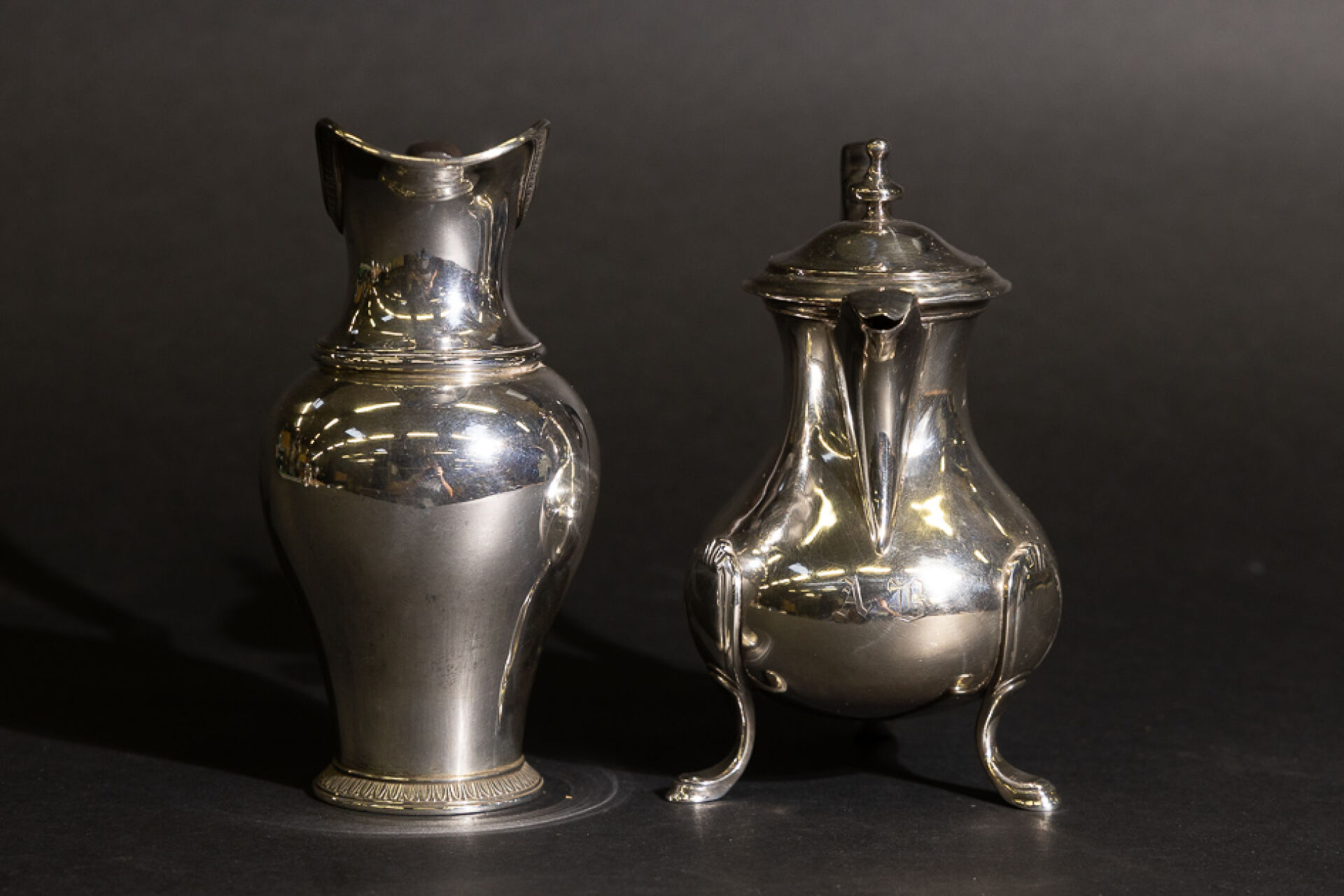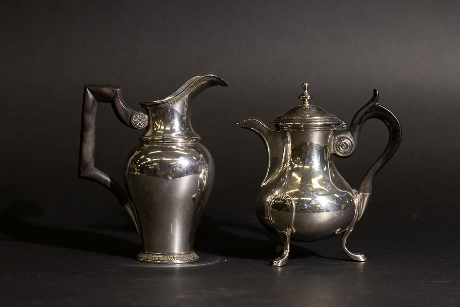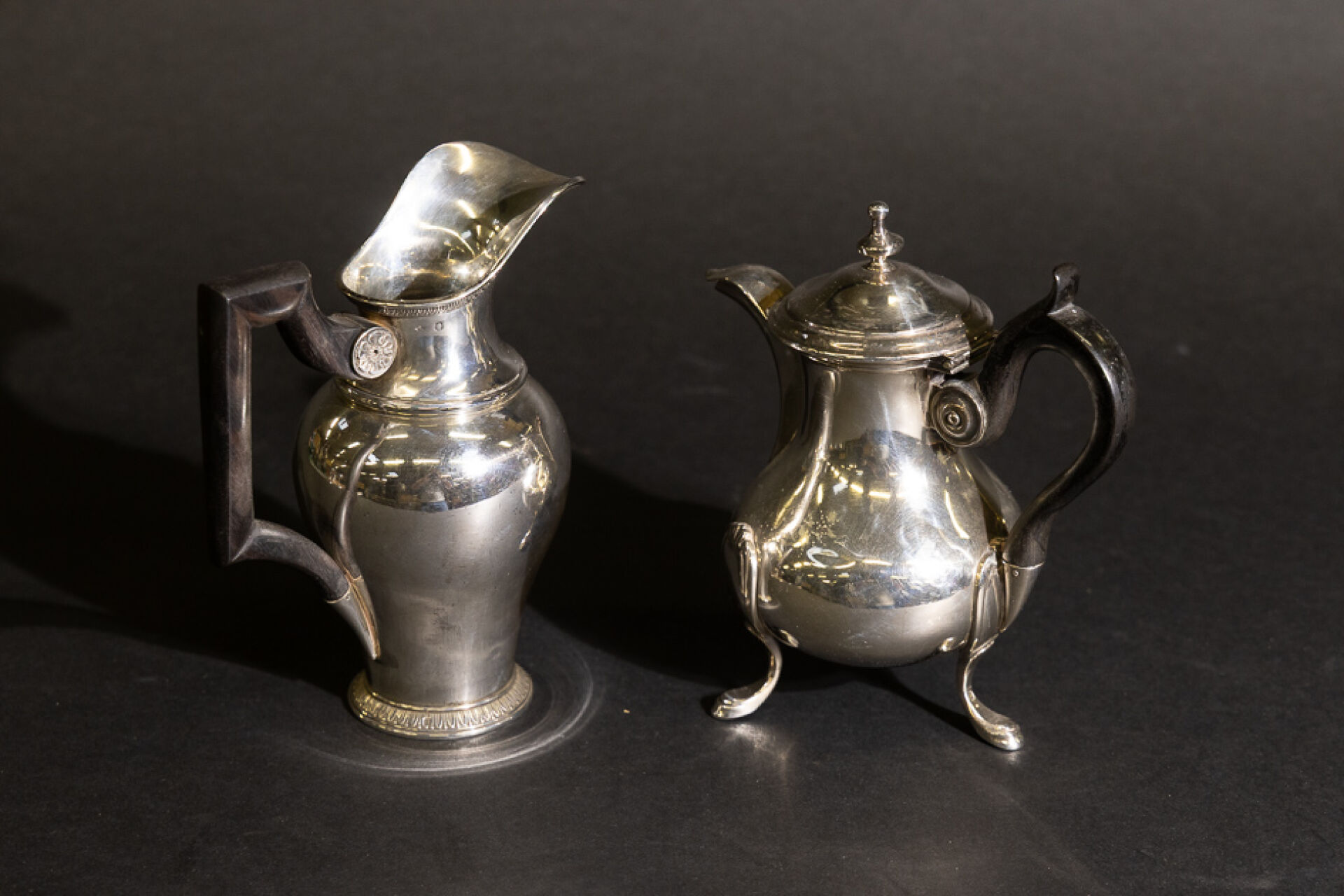 Cafetière égoïste tripode en argent, manche en bois noirci à poucier. Poinçon Minerve. Orfèvre : Martial FRAY (actif entre 1849 et 1861) Pot à lait balustre en argent à décor de frises d'oves et fleurettes, l'anse anguleuse en bois. Poinçon Minerve. Poids brut total : 600,80 g