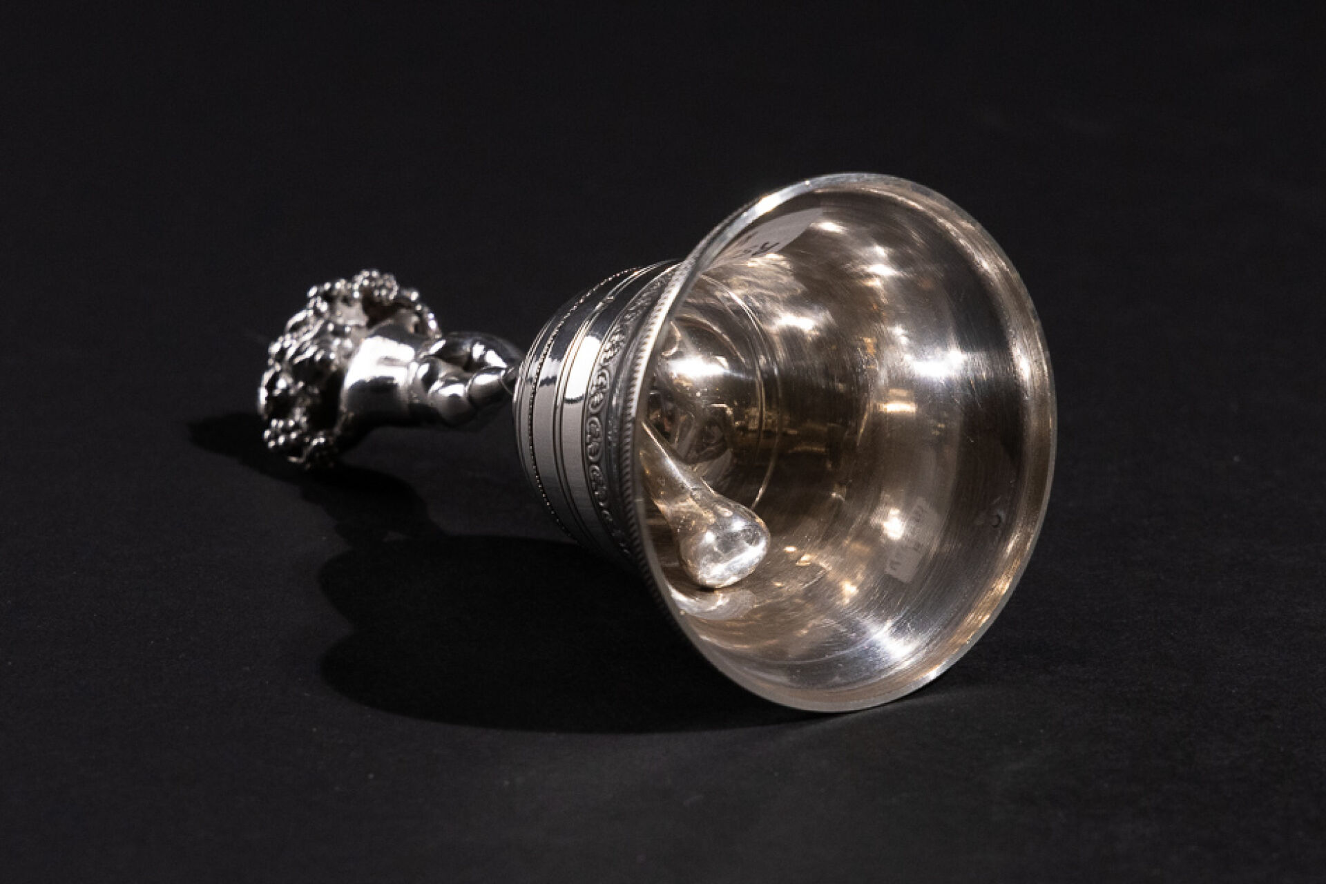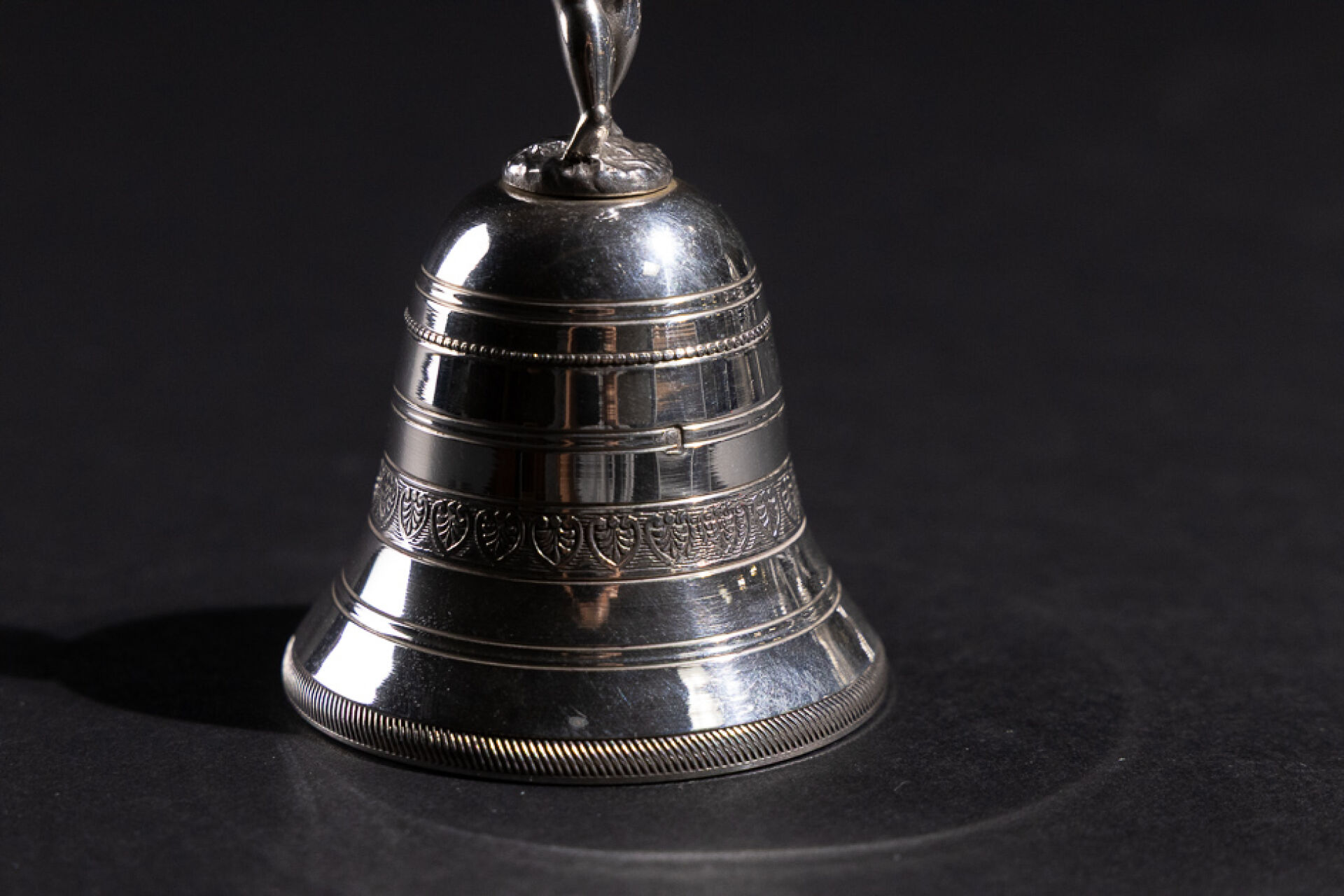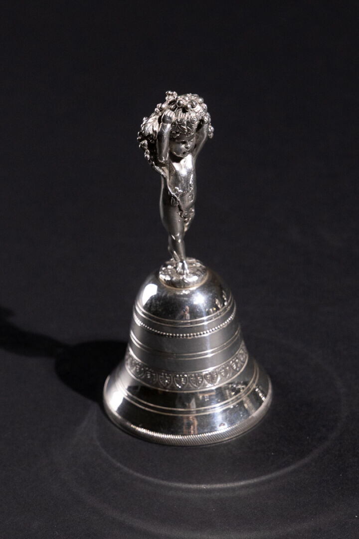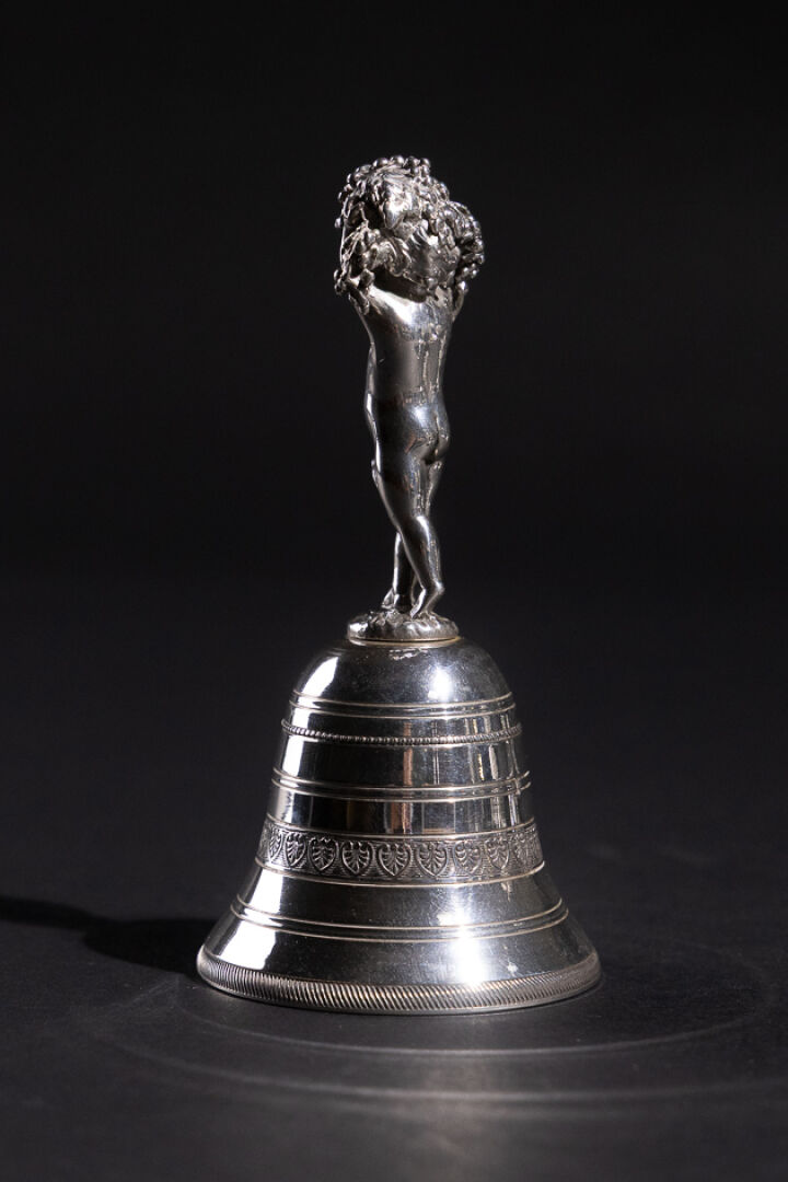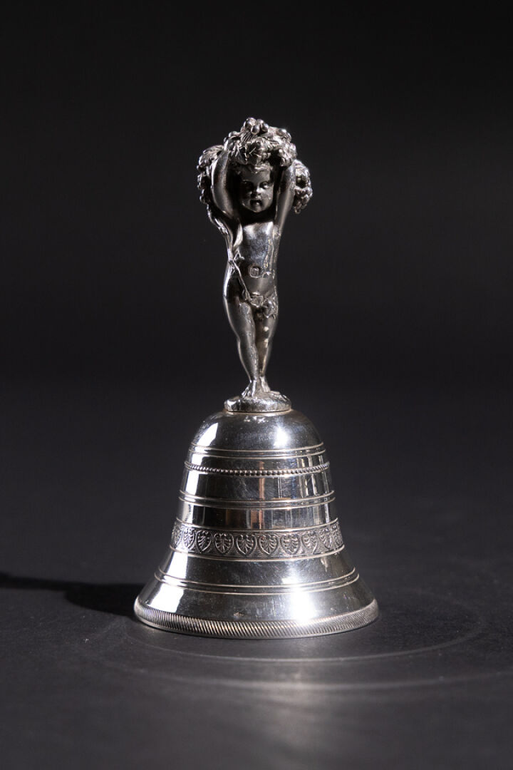 Clochette de table en argent à décor d'une frise de raies de cœur, d'une frise de perles, de filets et surmontée d'un putto vendangeur. Poinçon Minerve. Poids : 192,70 g - Haut. : 13 cm