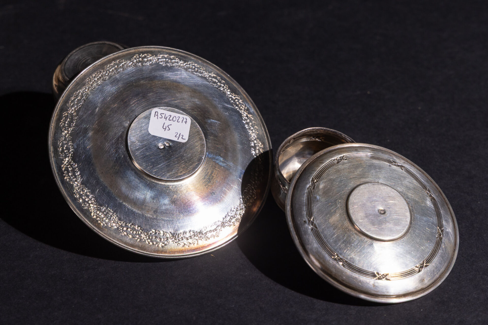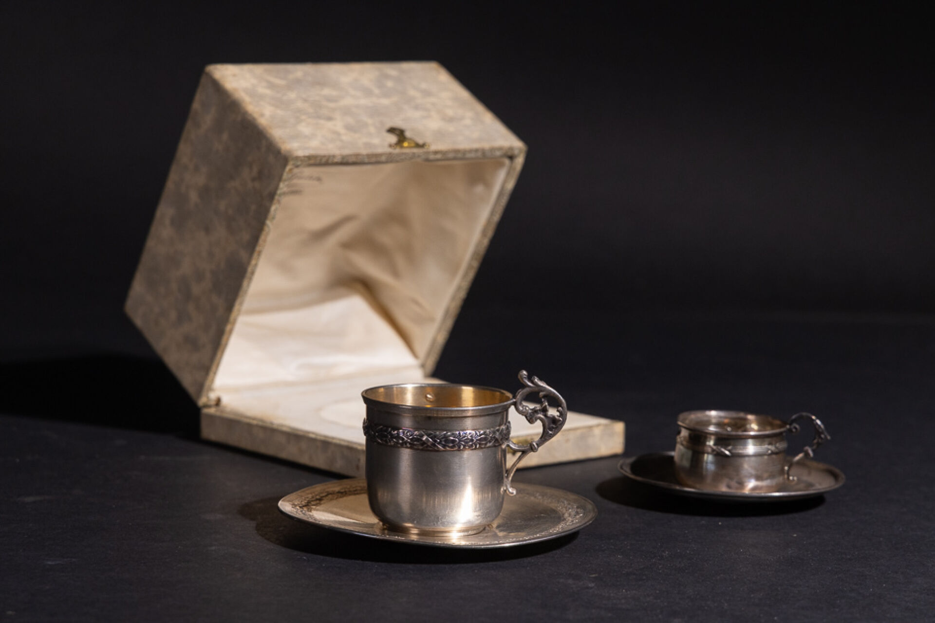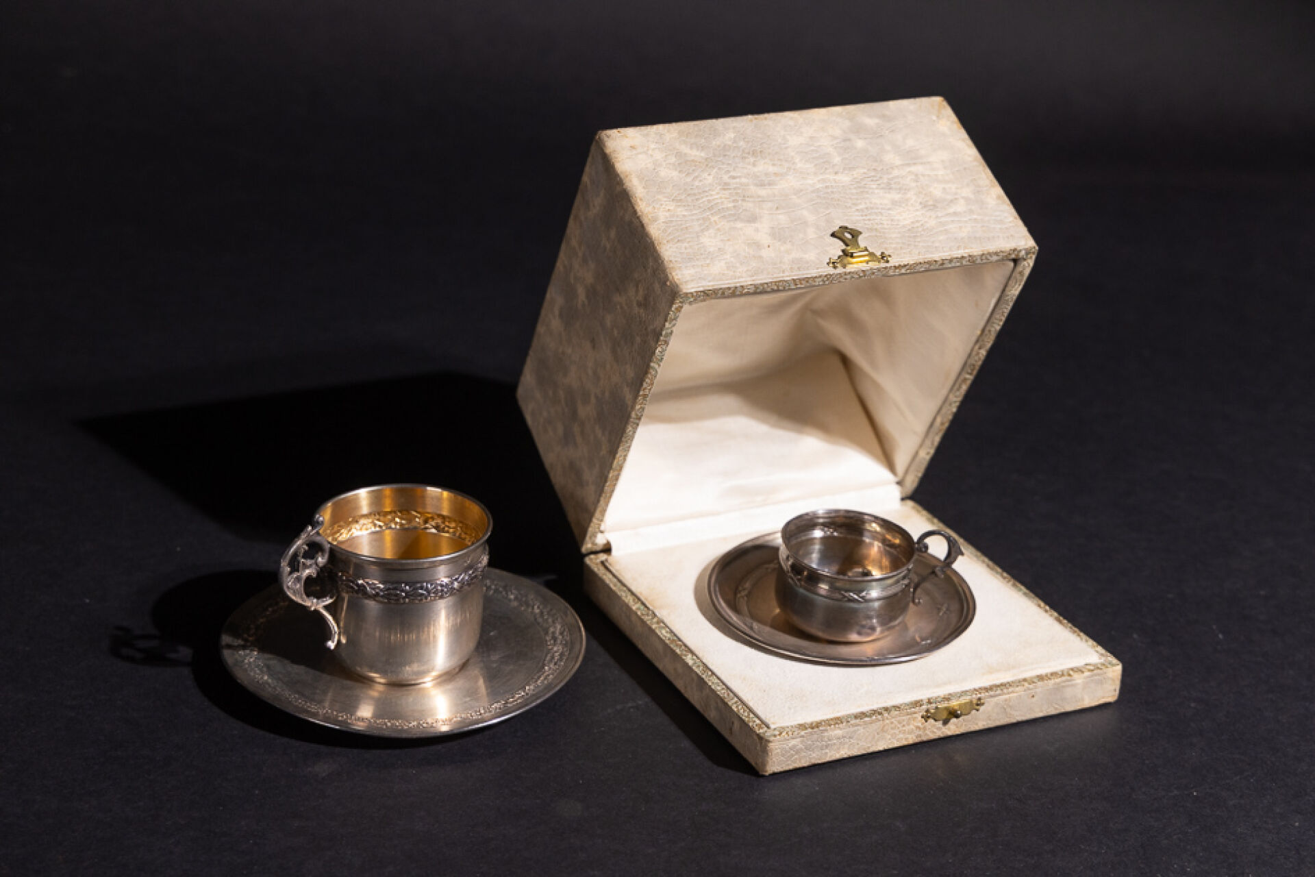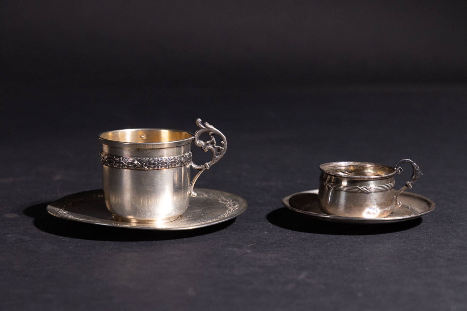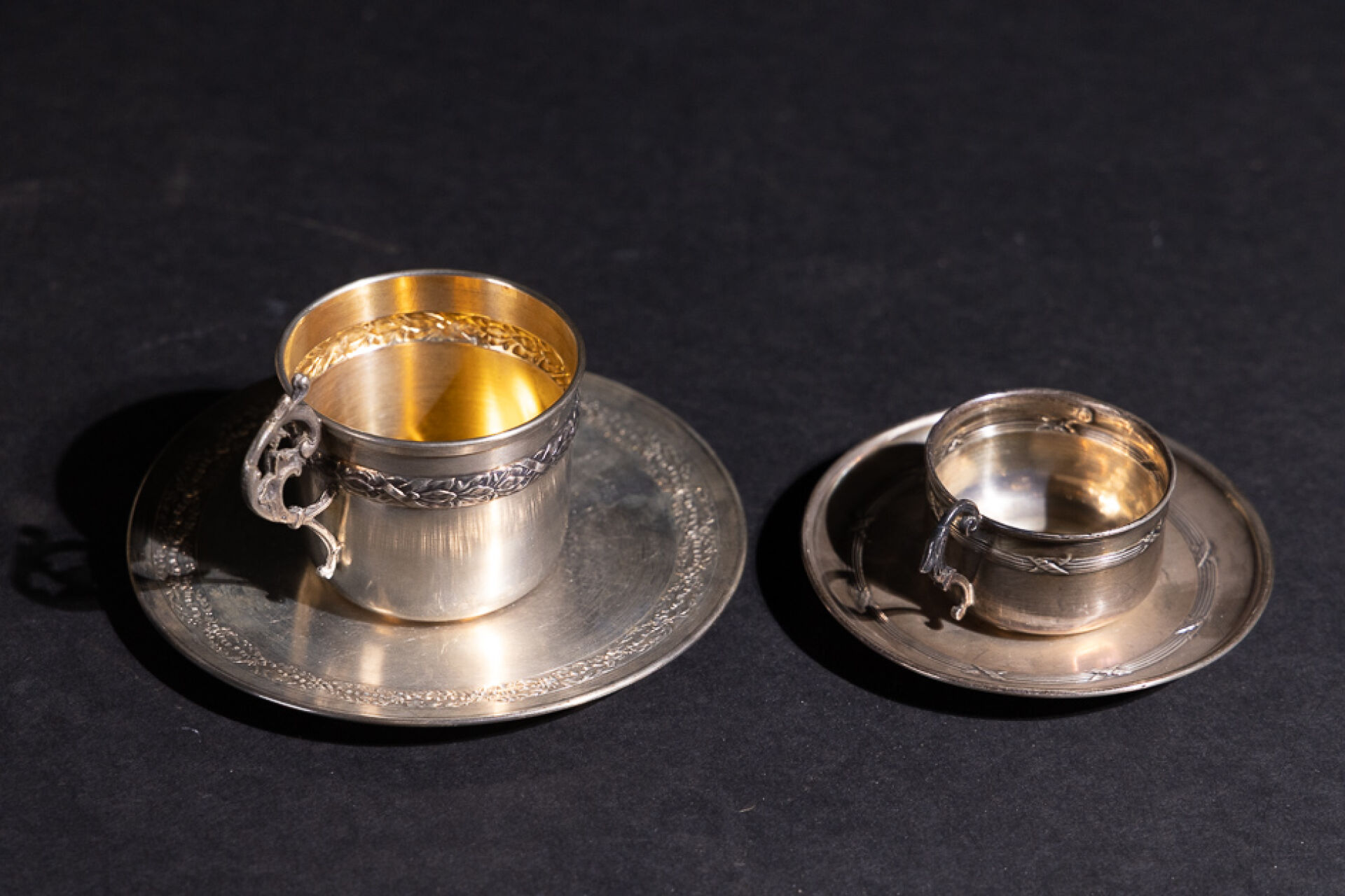 Ensemble en argent à décor de frise de joncs rubanés (chocs) comprenant : - Soucoupe ; - Tasse. Poinçon Minerve. Poids : 46.76 gr Écrin de la maison Guerin. On joint : Tasse et soucoupe en argent à décor de frise de tors de lauriers, l'anse en volute. Poinçon Minerve. Poids : 79.51 gr