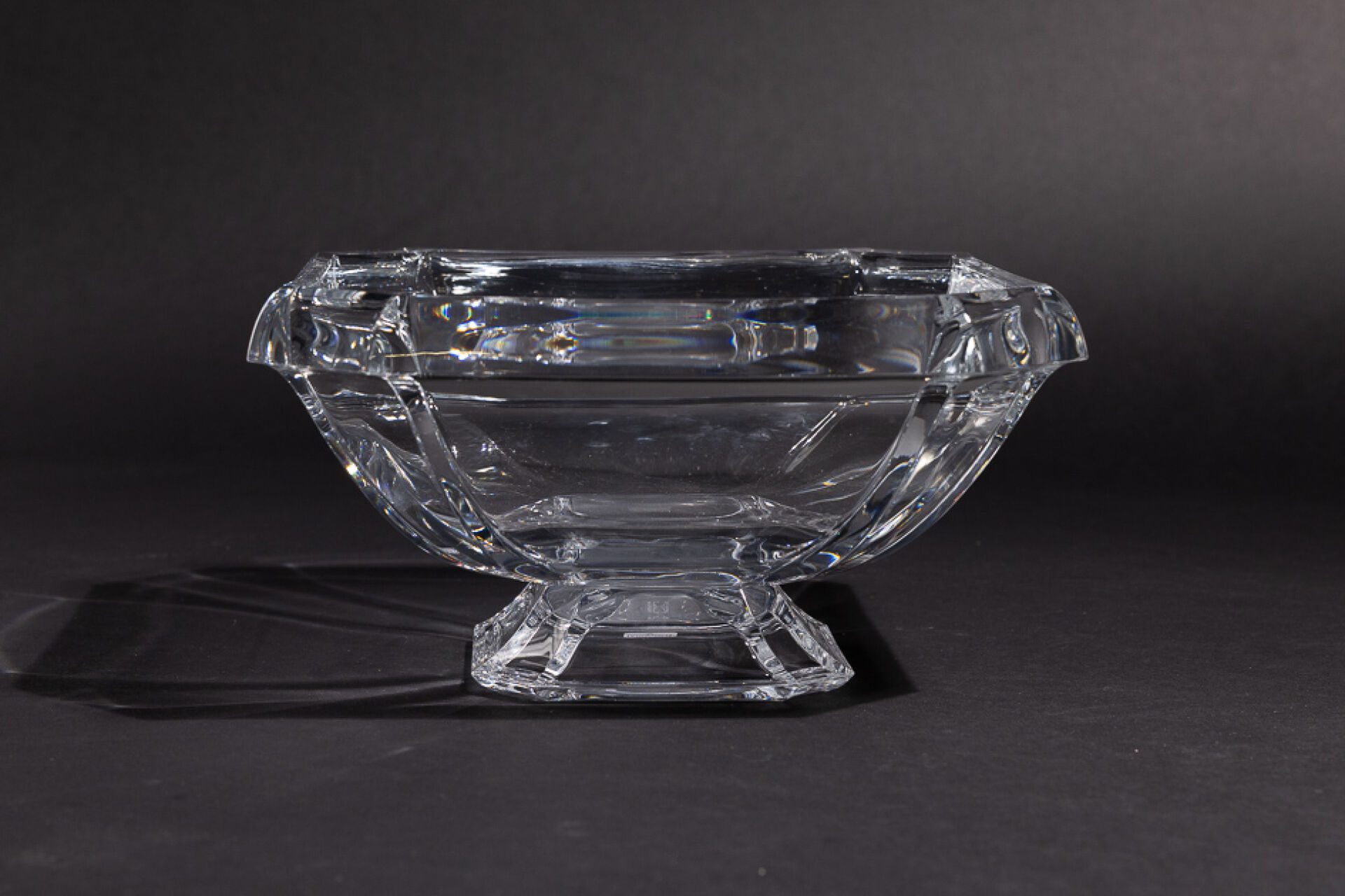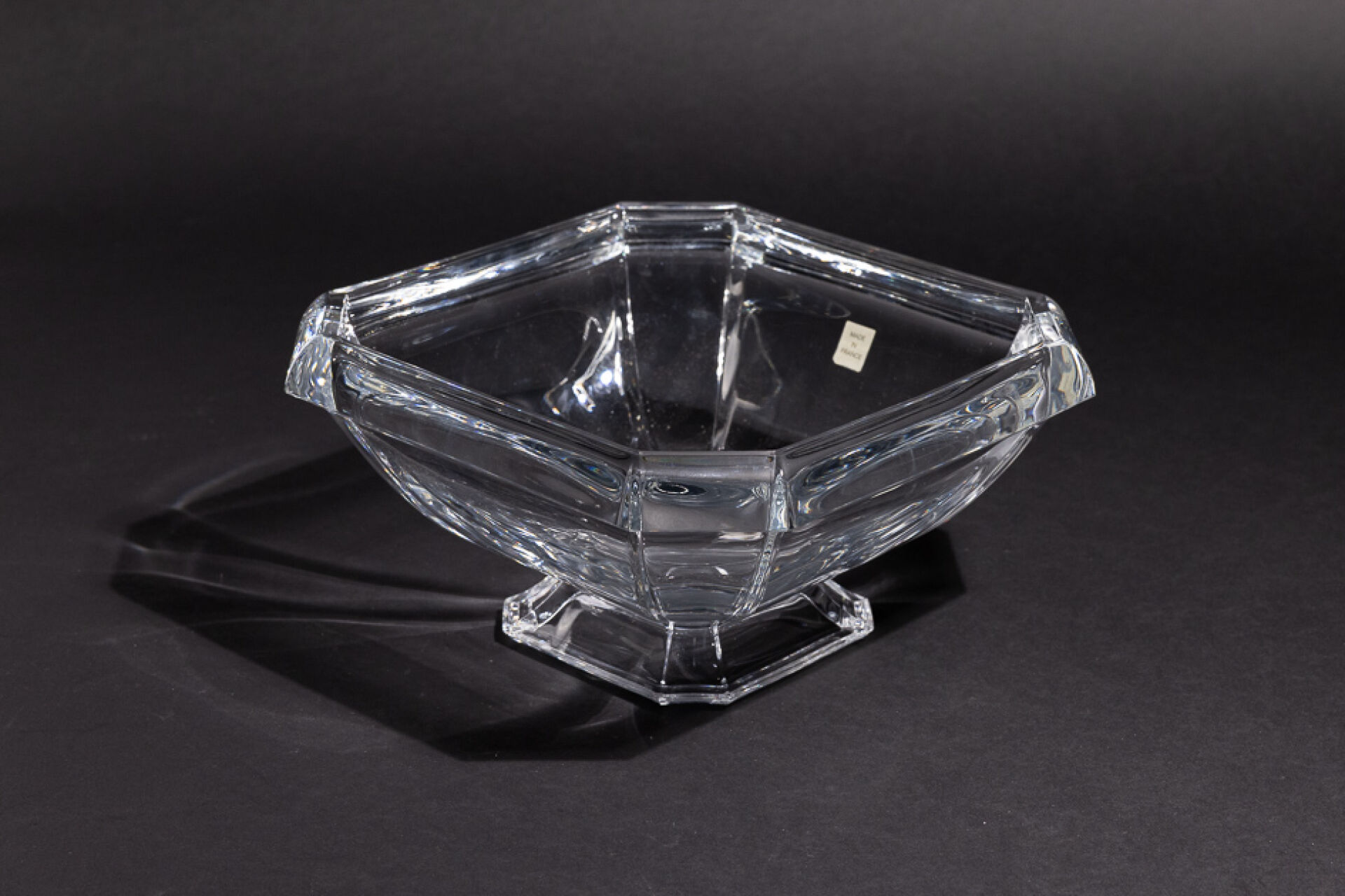 Cristallerie DURAND. Coupe en cristal quadrangulaire à pans sur pied. Marquée au revers, étiquette. Haut. : 15 cm - Côté : 28 cm
