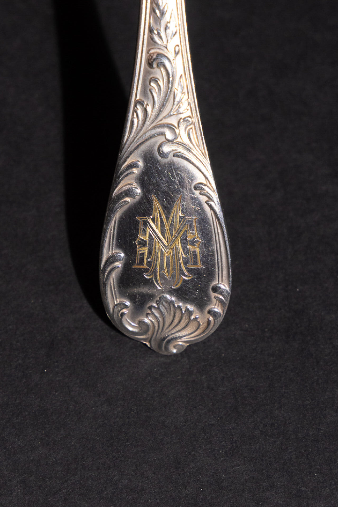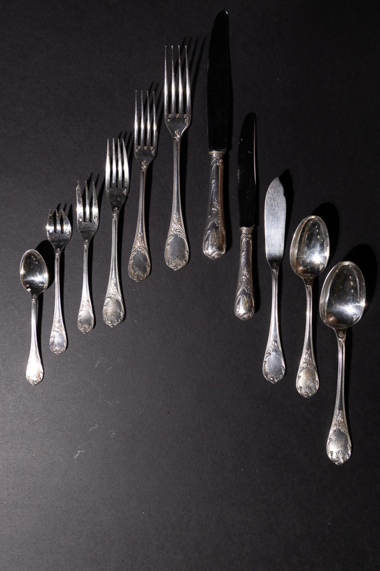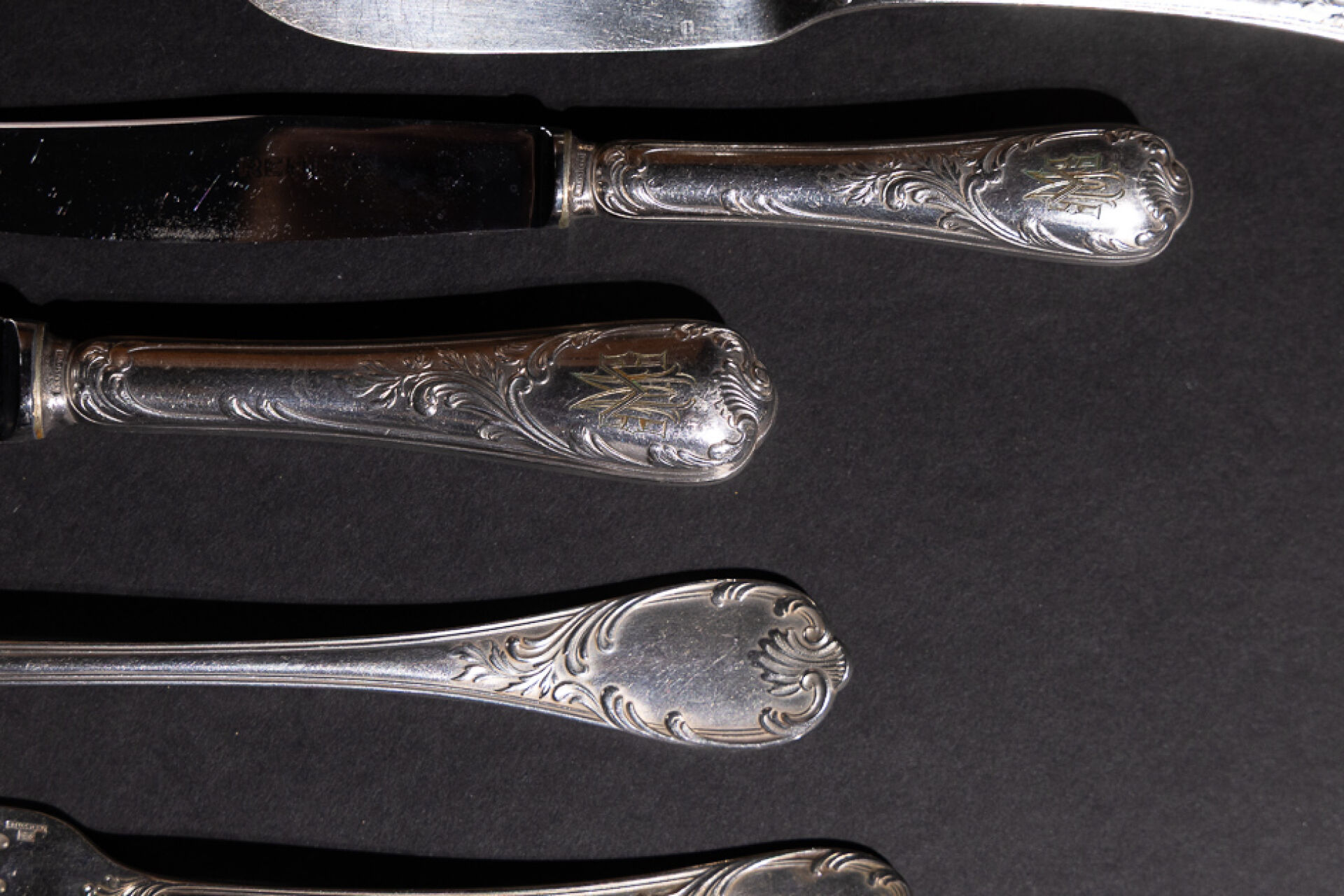 Maison CHRISTOFLE. Partie de ménagère en métal argenté modèle "Marly" monogrammée "MM" comprenant : - Douze couverts, - Douze couverts à entremets, - Douze couteaux, - Douze couteaux à fromage, - Douze fourchettes à fruit, - Douze fourchettes à huitre, - Douze couverts à poisson, - Douze cuillères à dessert, - Fourchette à sardines, - Pelle à tarte, - Louche à sauce, - Fourchette à viande froide, - Couvert à poisson, - Louche à lait, - Cuillère à sucre brésilienne, - Louche, - Couteau à découper. Style Louis XV. Coffret en bois à quatre tiroirs (fentes, manque la clé). Haut. : 31 cm - Long. : 50 cm - Prof. : 35 cm