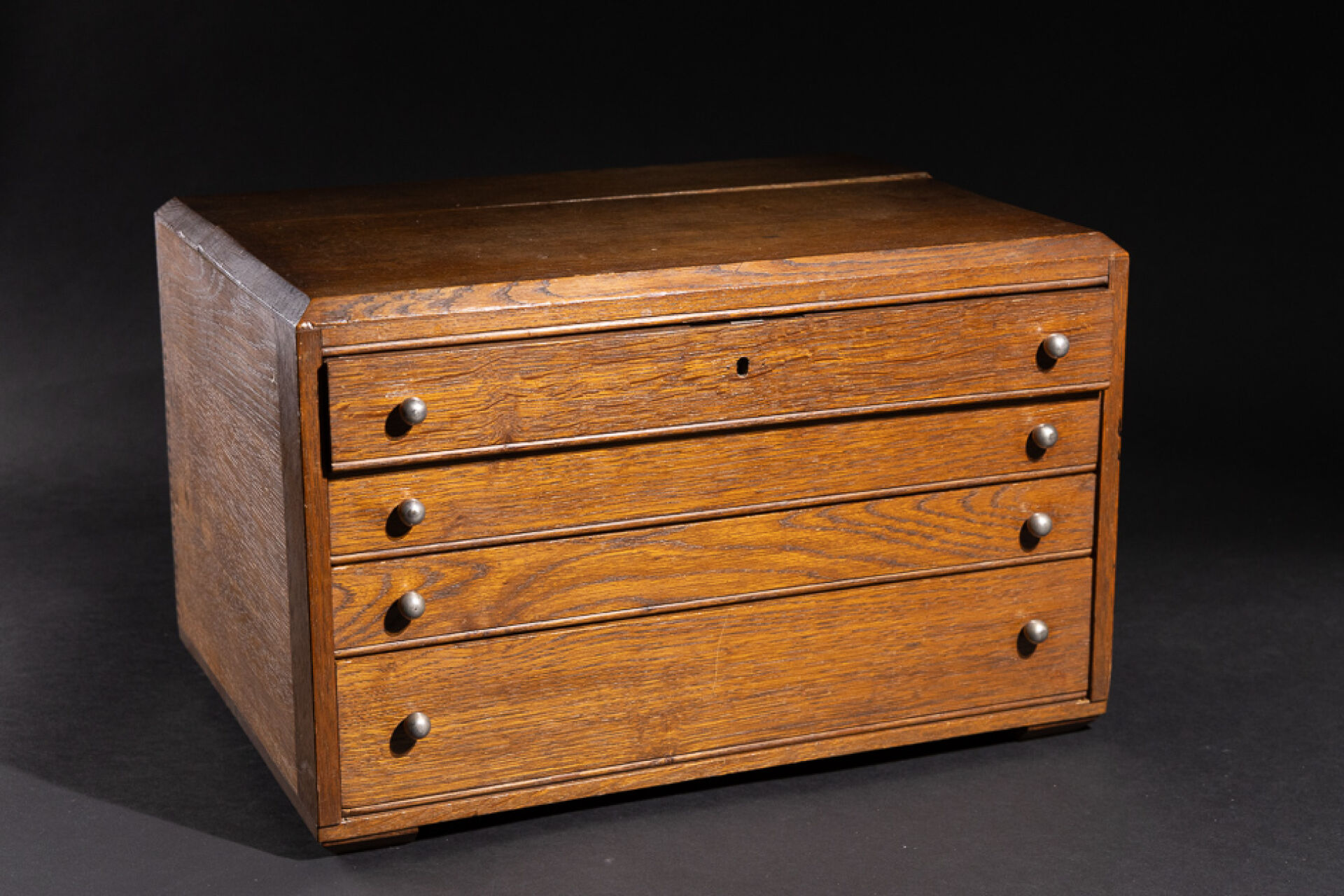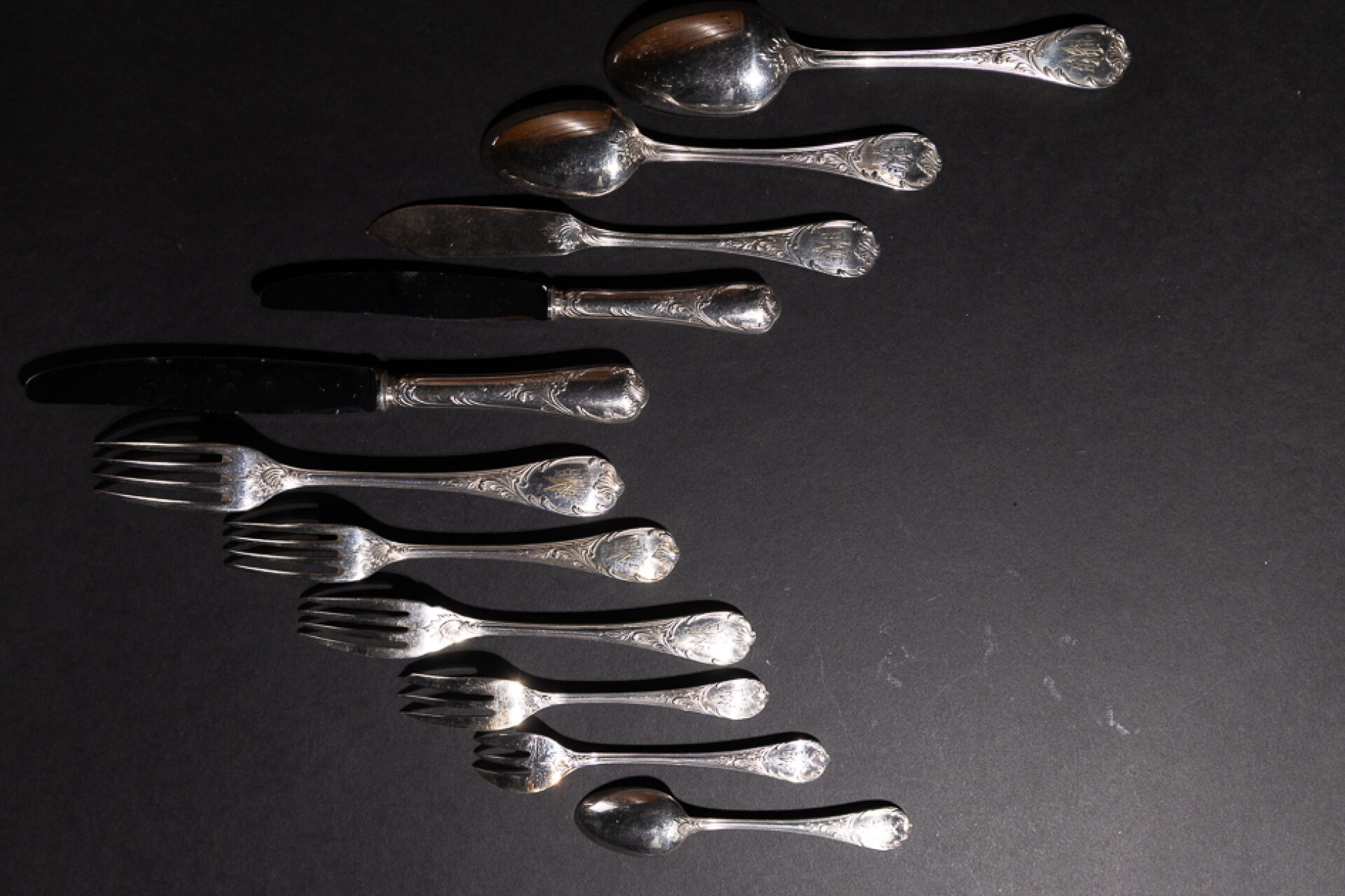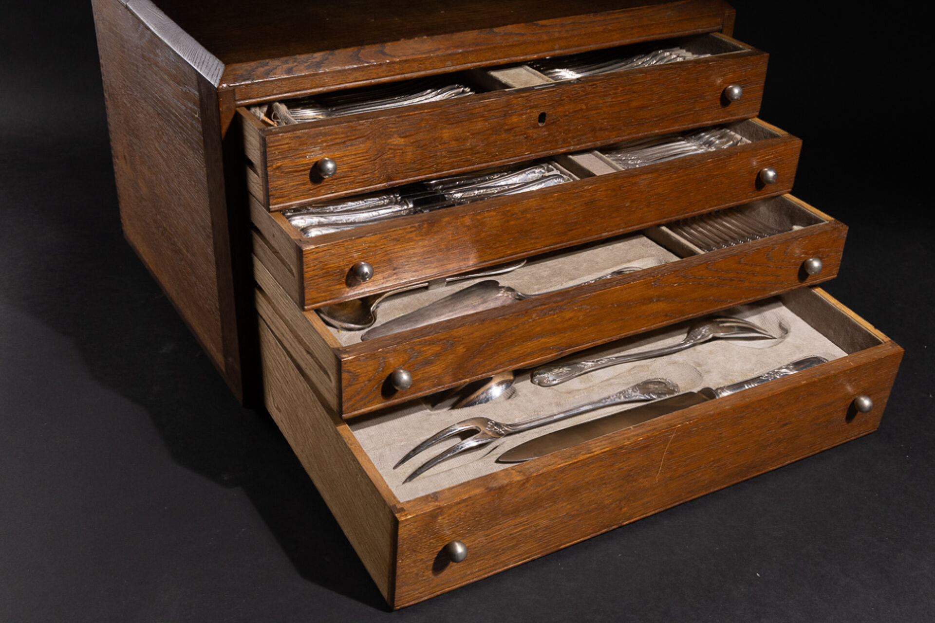 Maison CHRISTOFLE. Partie de ménagère en métal argenté modèle "Marly" monogrammée "MM" comprenant : - Douze couverts, - Douze couverts à entremets, - Douze couteaux, - Douze couteaux à fromage, - Douze fourchettes à fruit, - Douze fourchettes à huitre, - Douze couverts à poisson, - Douze cuillères à dessert, - Fourchette à sardines, - Pelle à tarte, - Louche à sauce, - Fourchette à viande froide, - Couvert à poisson, - Louche à lait, - Cuillère à sucre brésilienne, - Louche, - Couteau à découper. Style Louis XV. Coffret en bois à quatre tiroirs (fentes, manque la clé). Haut. : 31 cm - Long. : 50 cm - Prof. : 35 cm