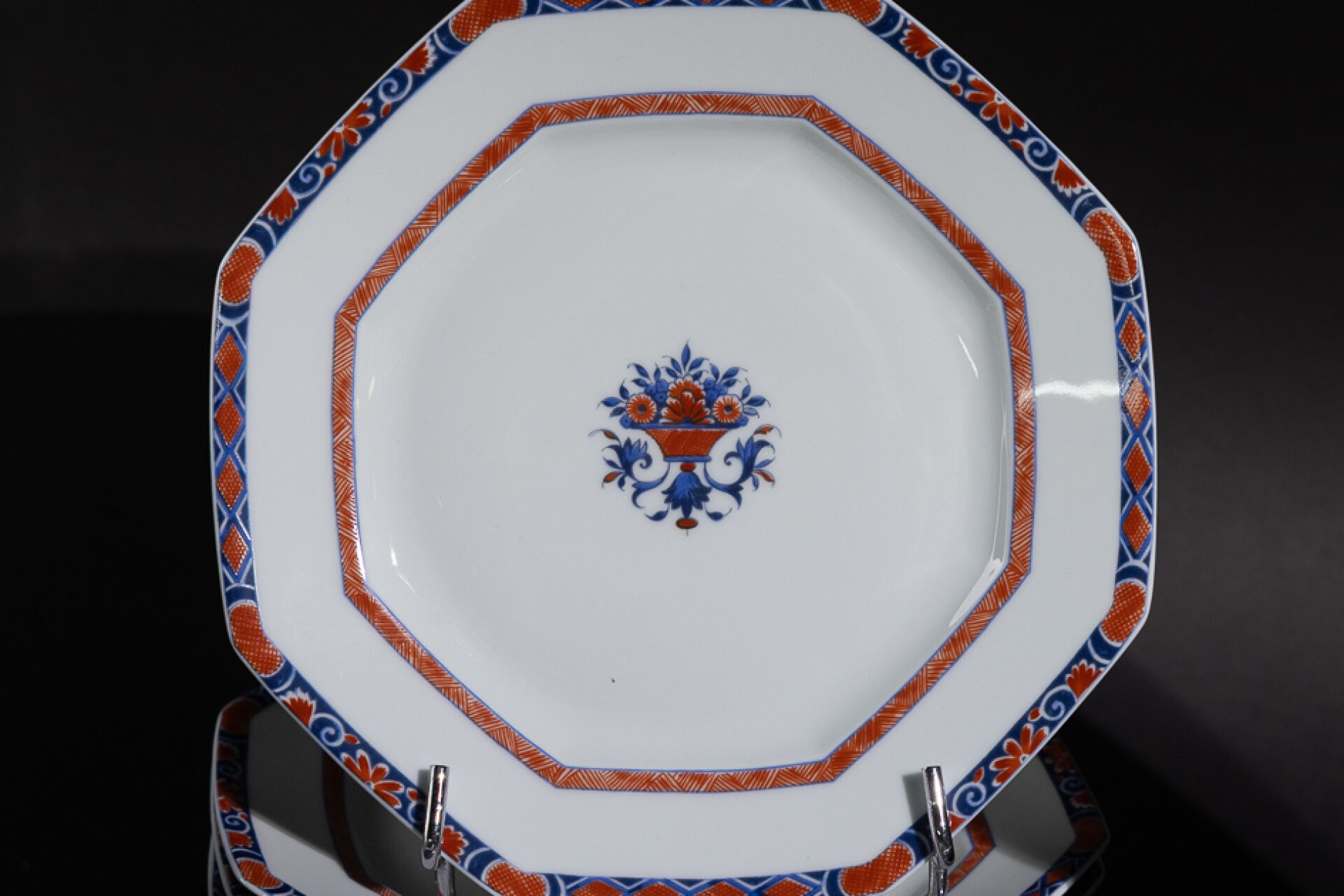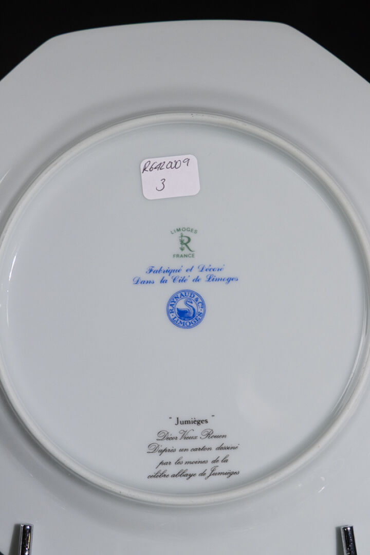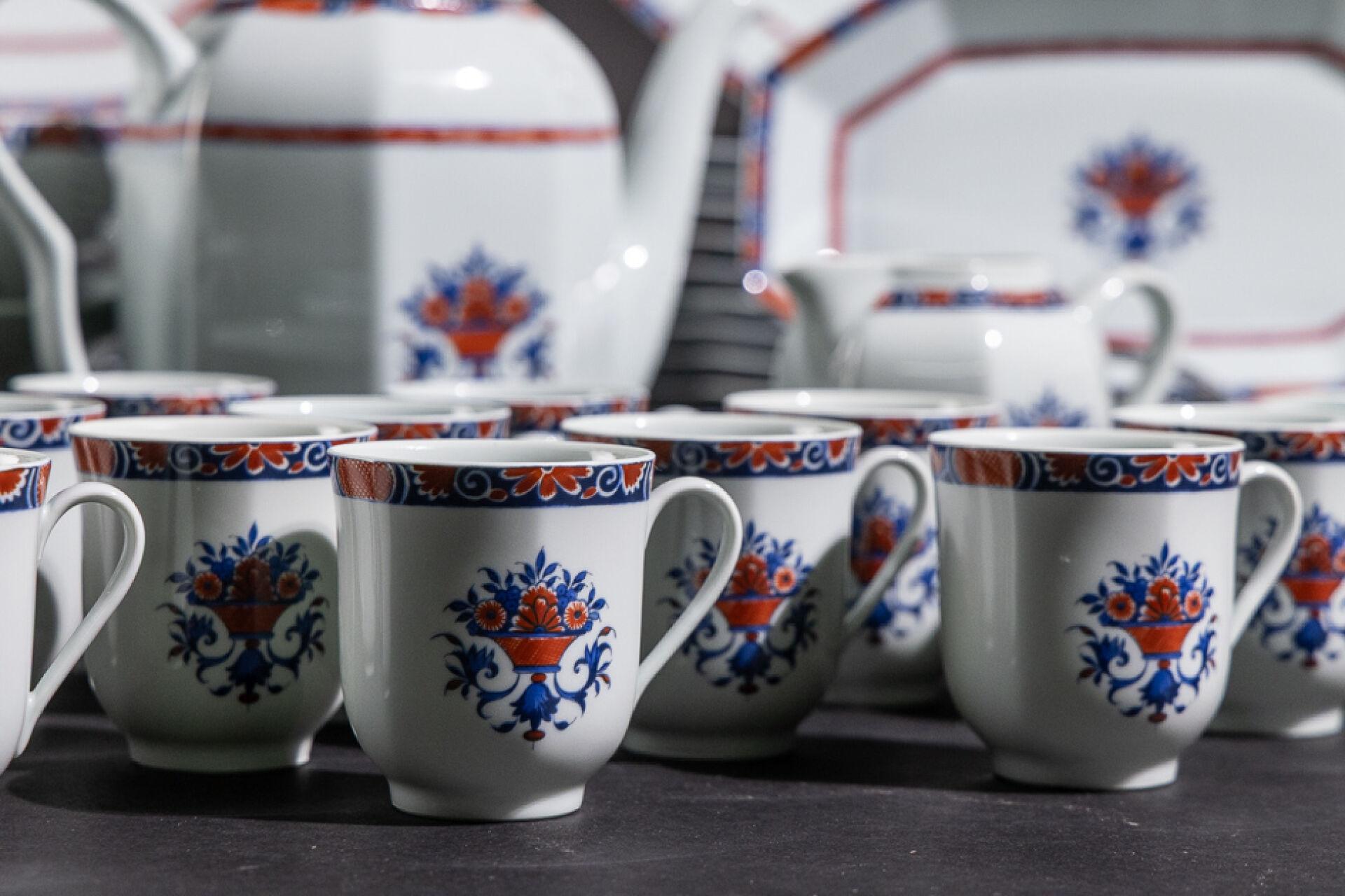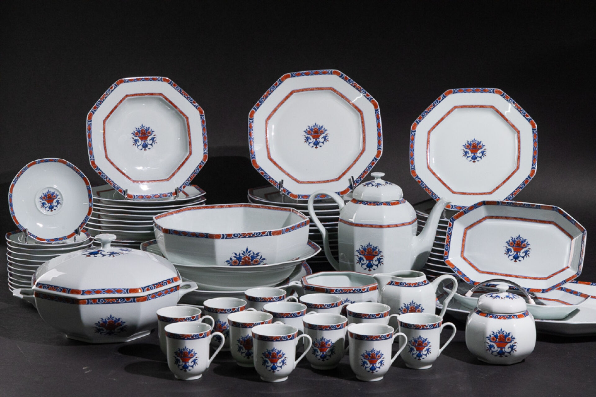 Maison RAYNAUD & Cie. Partie de service de table en porcelaine modèle JUMIEGES à décor de paniers fleuris dans les tons rouge et bleu dit décor vieux Rouen d'après un carton dessiné par les moines de l'Abbaye de Jumièges comprenant : - Douze assiettes plates ; - Douze assiettes à dessert ; - Douze assiettes creuses ; - Plat creux ; - Plat ; - Plat à tarte ; - Plat ovale ; - Saladier ; - Légumier ; - Deux raviers ; - Saucière ; - Partie de service à café comprenant verseuse, pot à lait, sucrier couvert ; - Douze tasses à café et douze soucoupes.