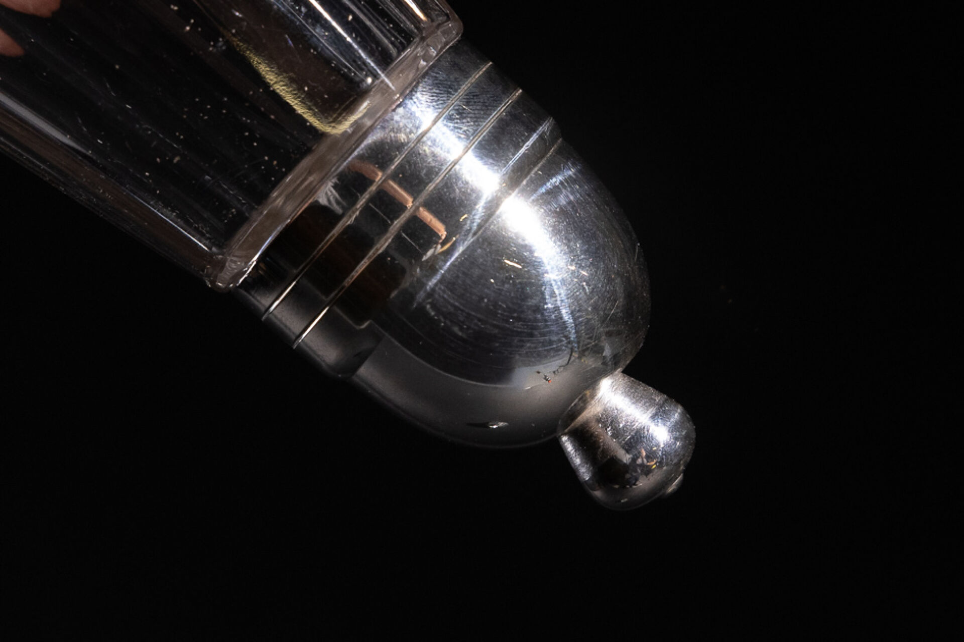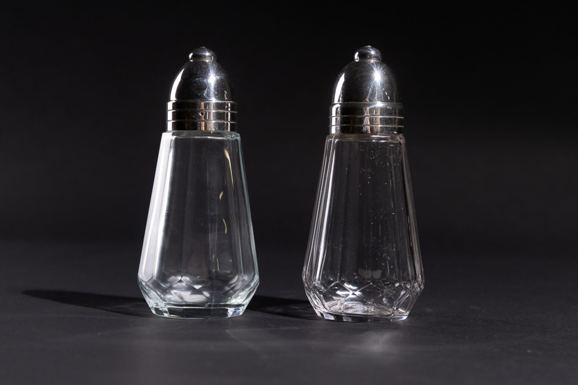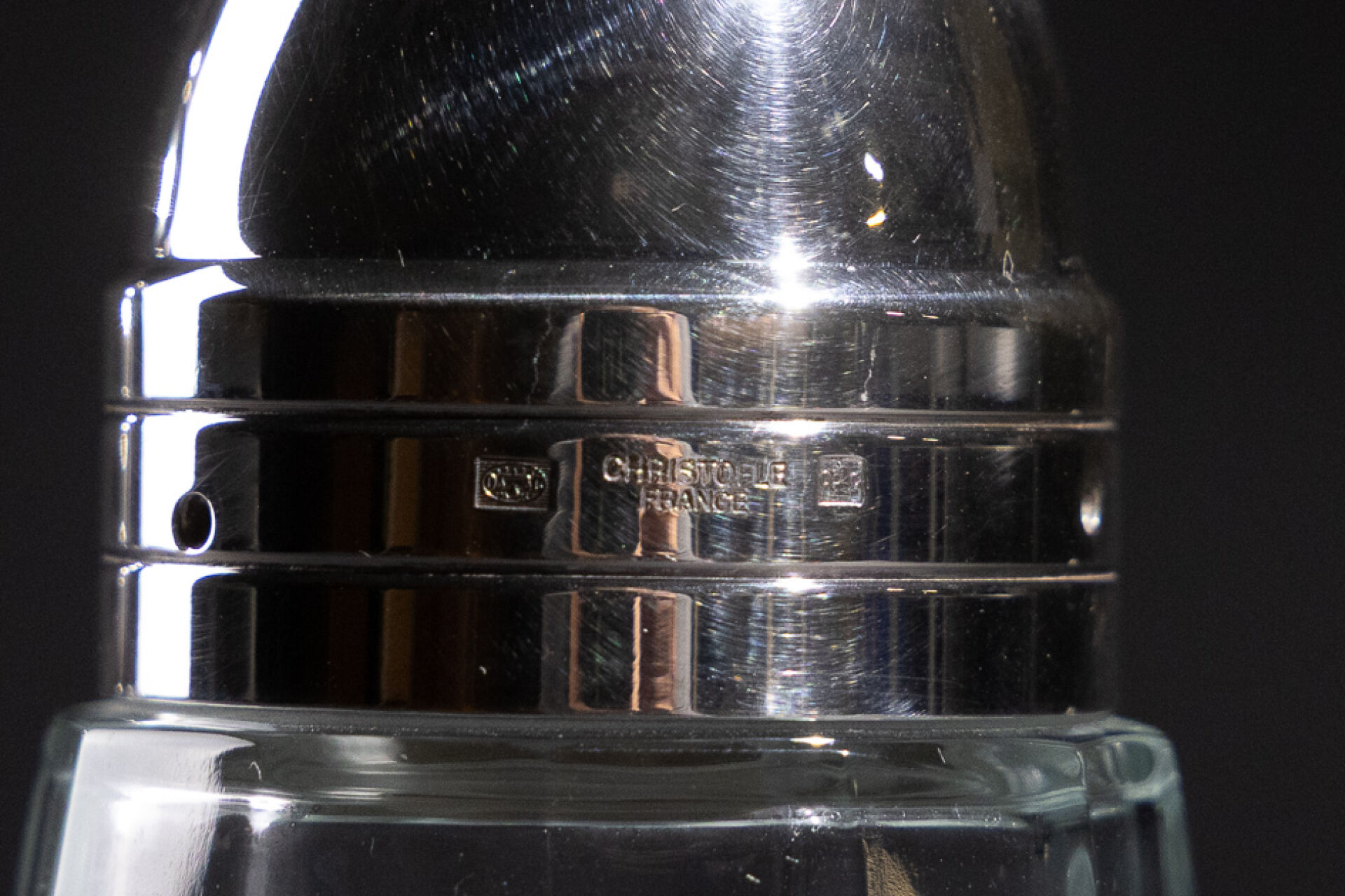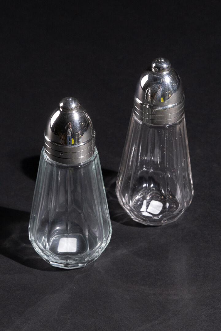 Maison CHRISTOFLE. Paire de saupoudroirs en verre et métal argenté modèle Megève. Haut. : 16,5 cm