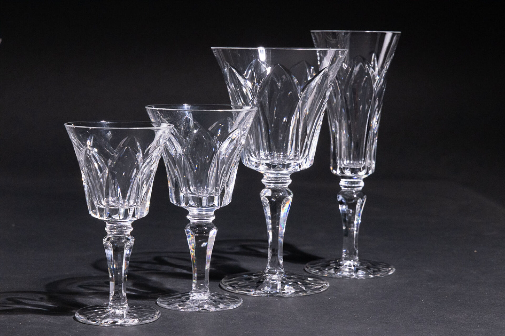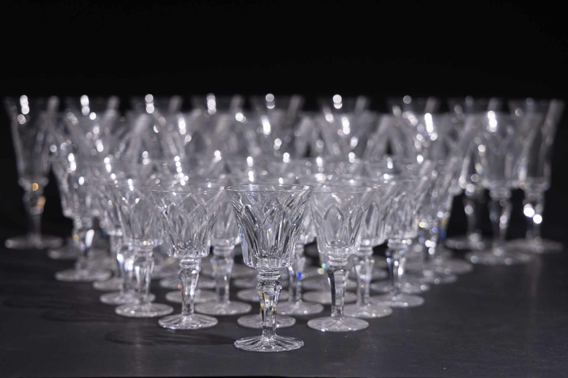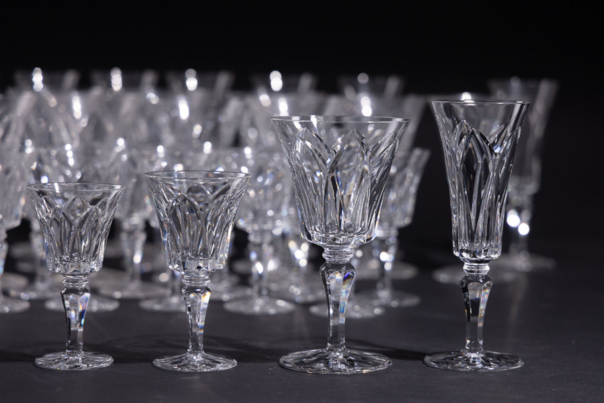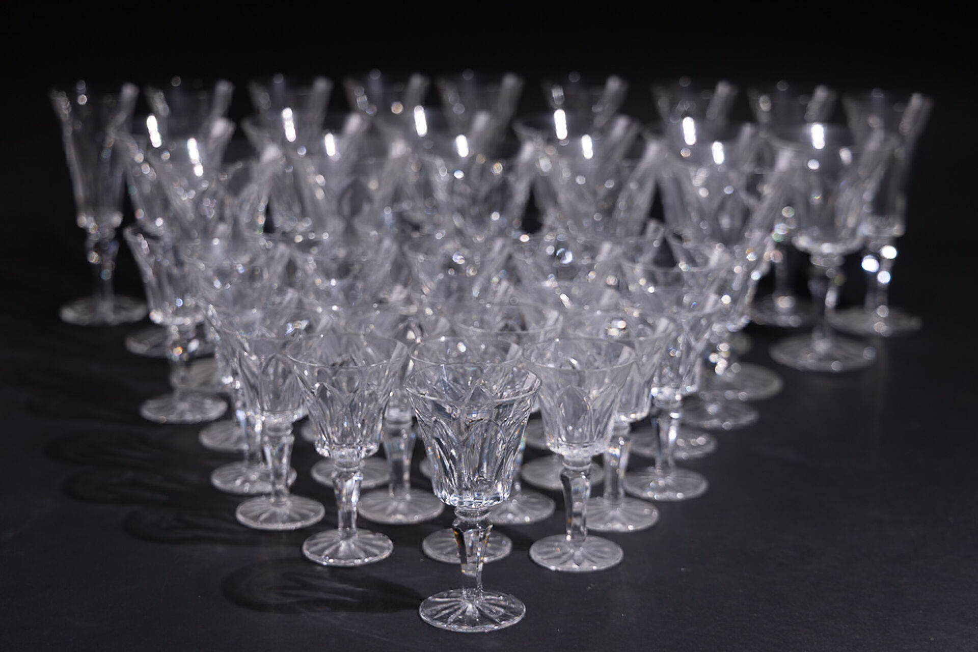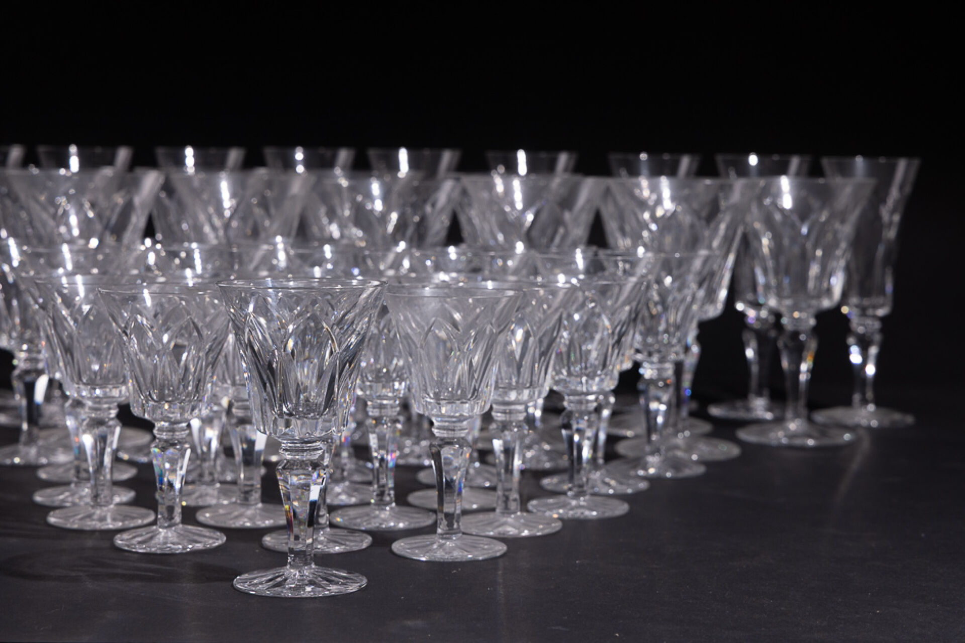 Maison SAINT LOUIS. Partie de service en verre modèle Camargue (éclats, certains verres meulés) comprenant : - Onze verres à eau ; - Douze verres à vin rouge ; - Douze verres à vin blanc ; - Dix flûtes à champagne.