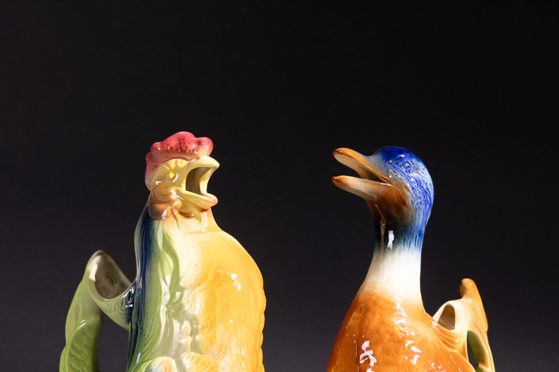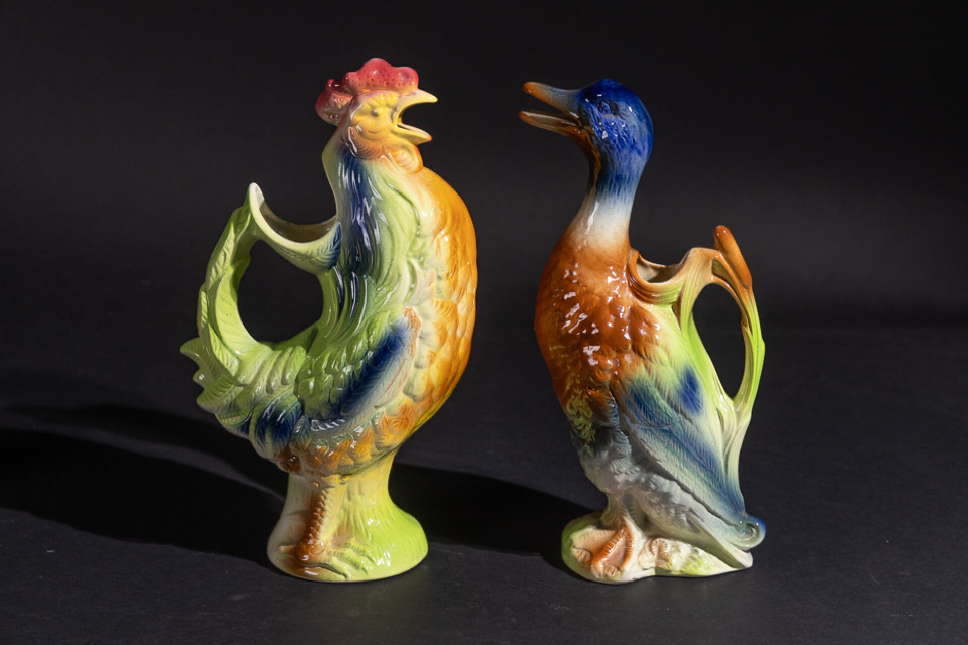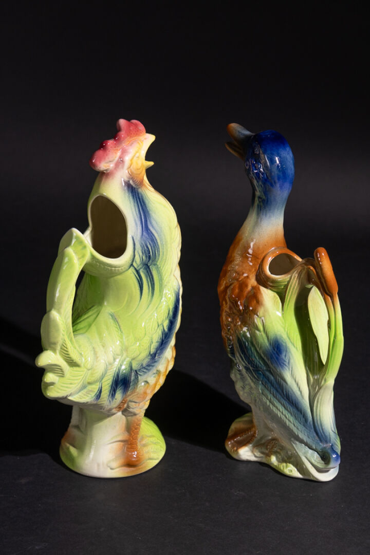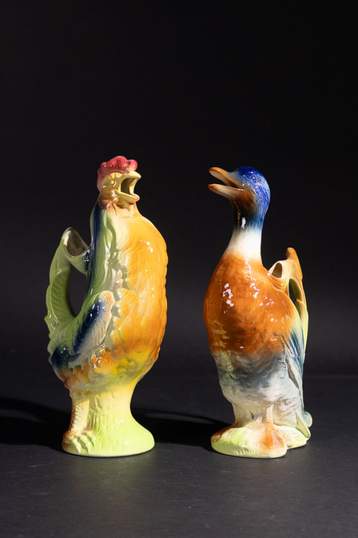 Manufacture SAINT-CLEMENT. Deux pichets zoomorphes en barbotine polychrome figurant un canard et un coq. Marqués au revers. Haut. : 33 cm et 35 cm