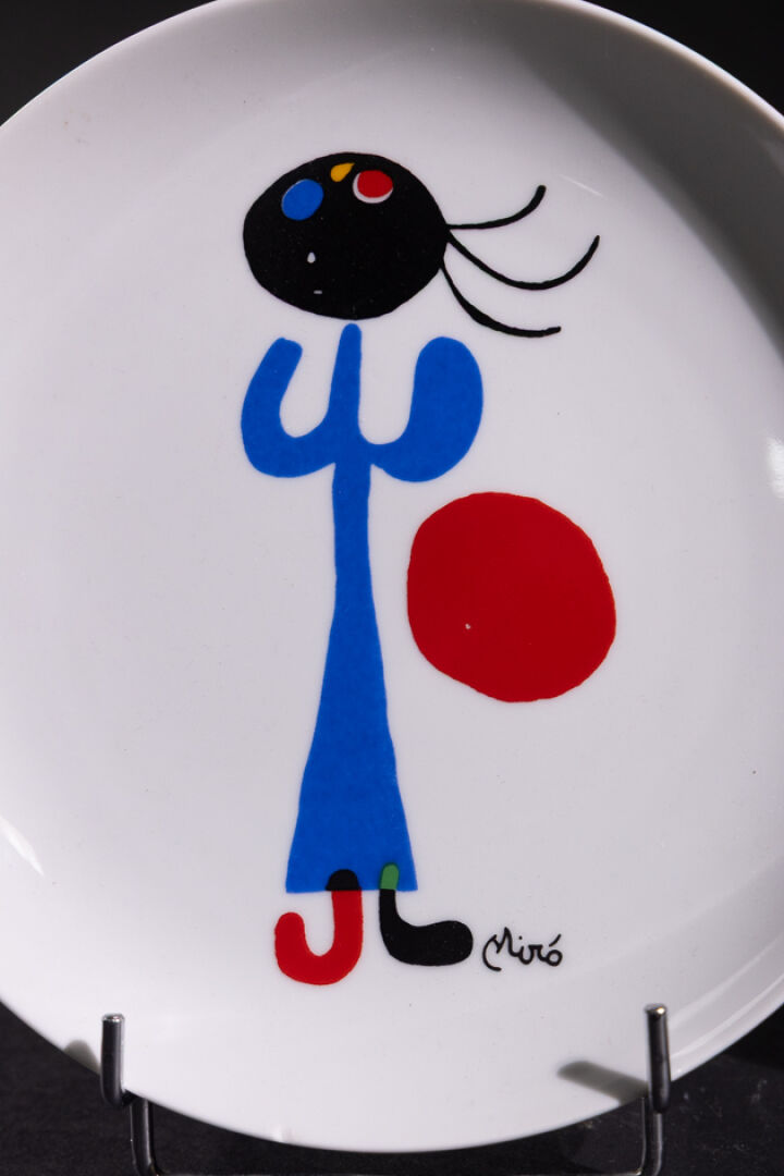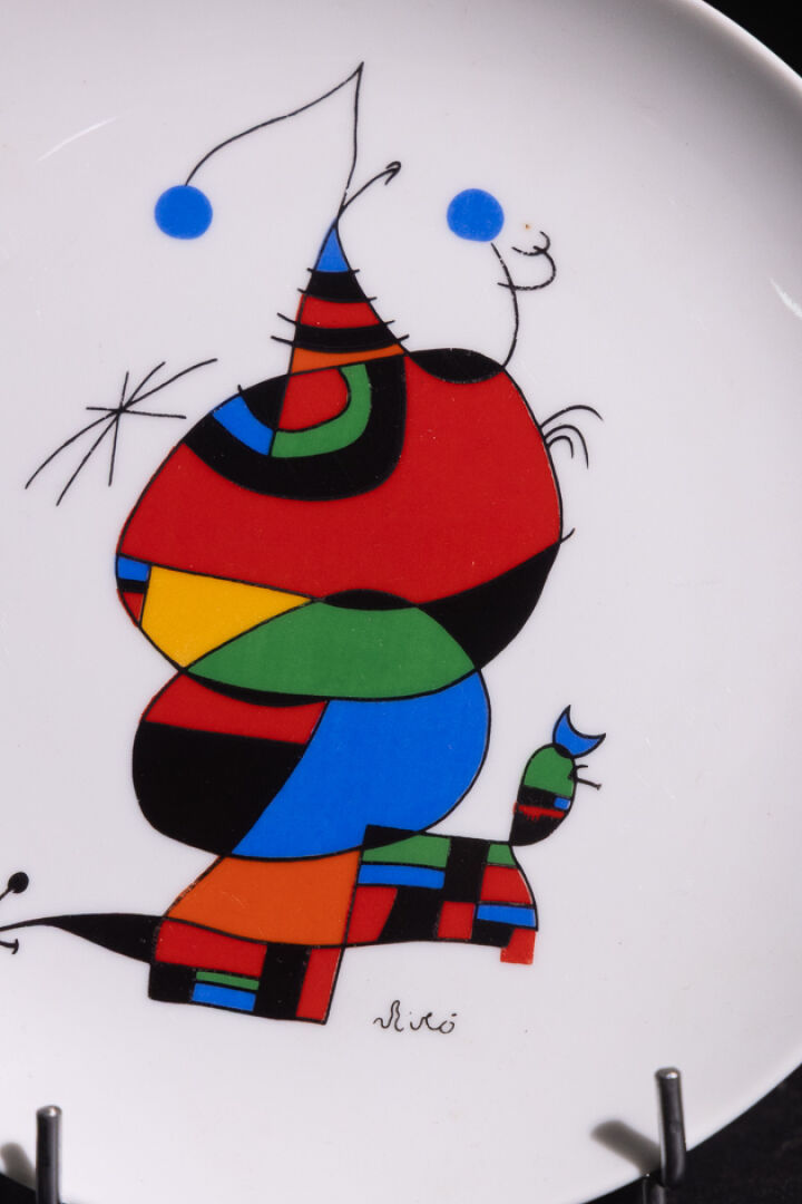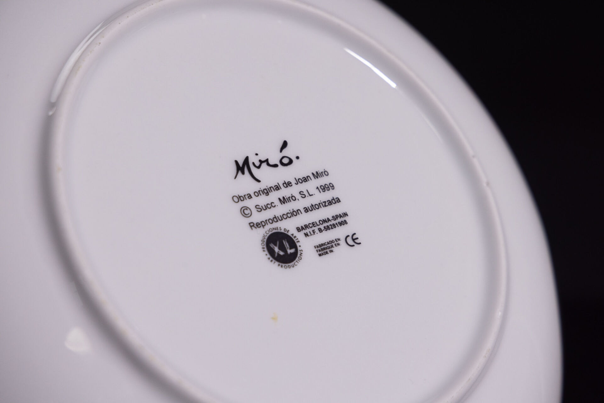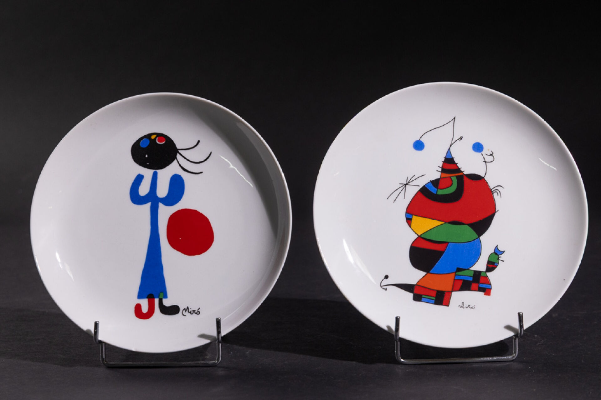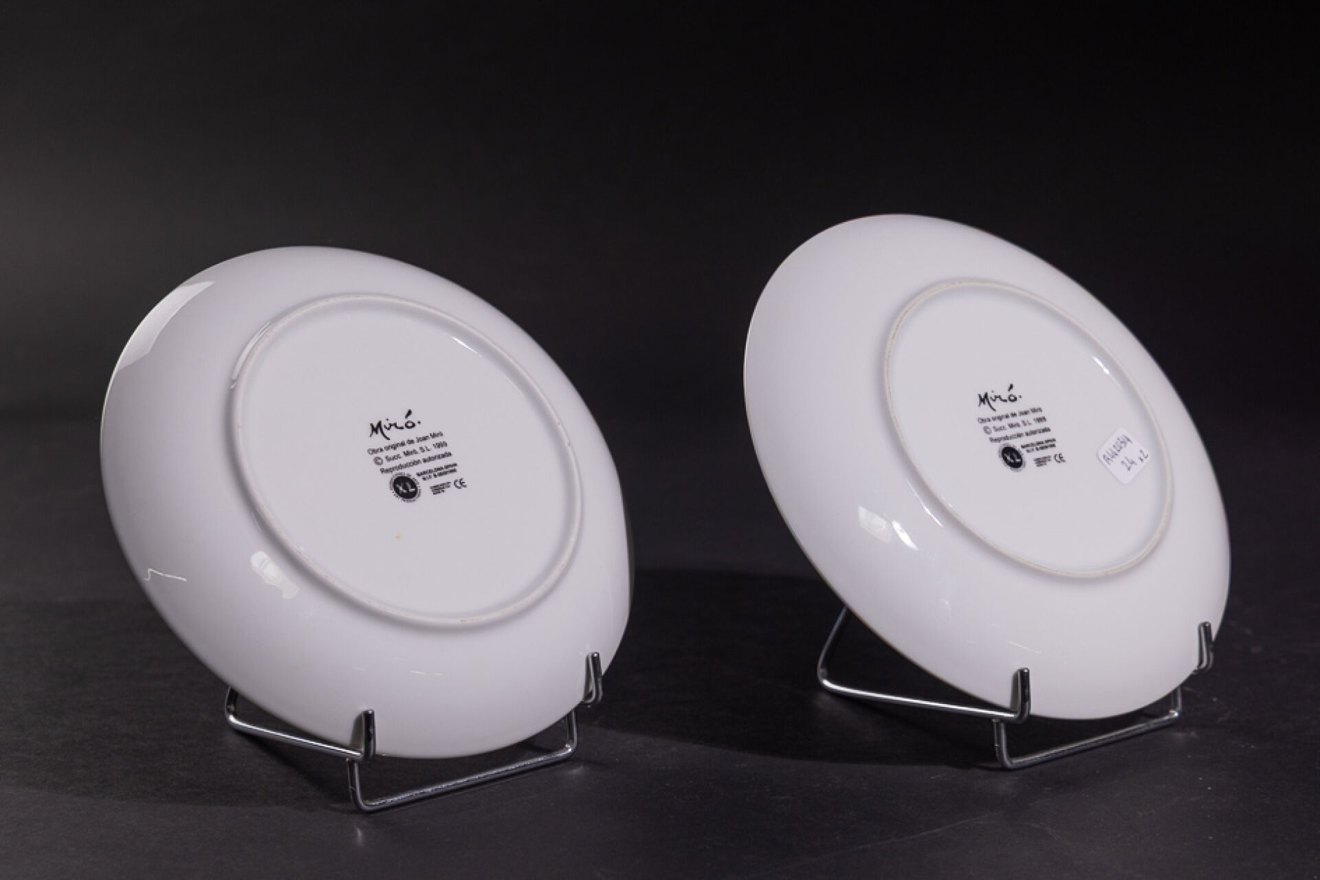 D'après Joan MIRO (1893-1983). Deux assiettes en porcelaine à décor polychrome abstrait. Marquées au revers. Diam. : 21 cm