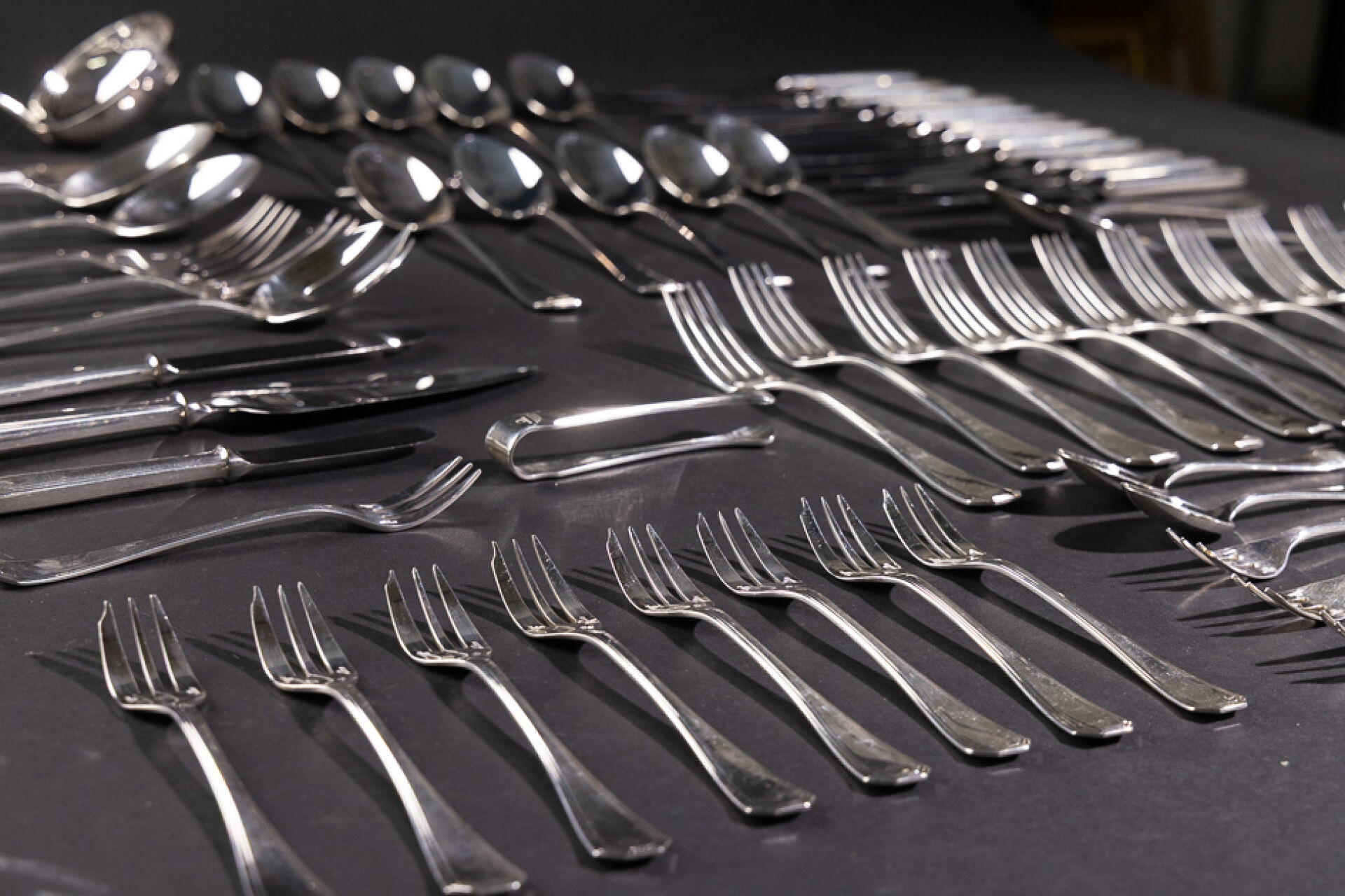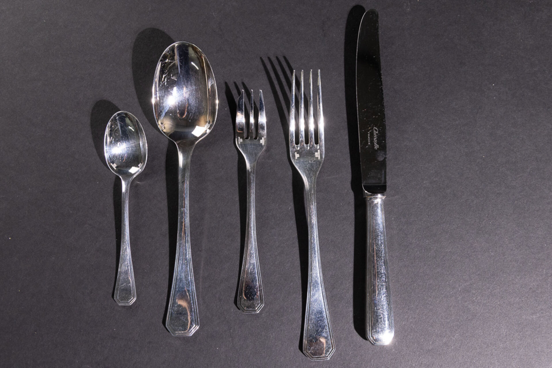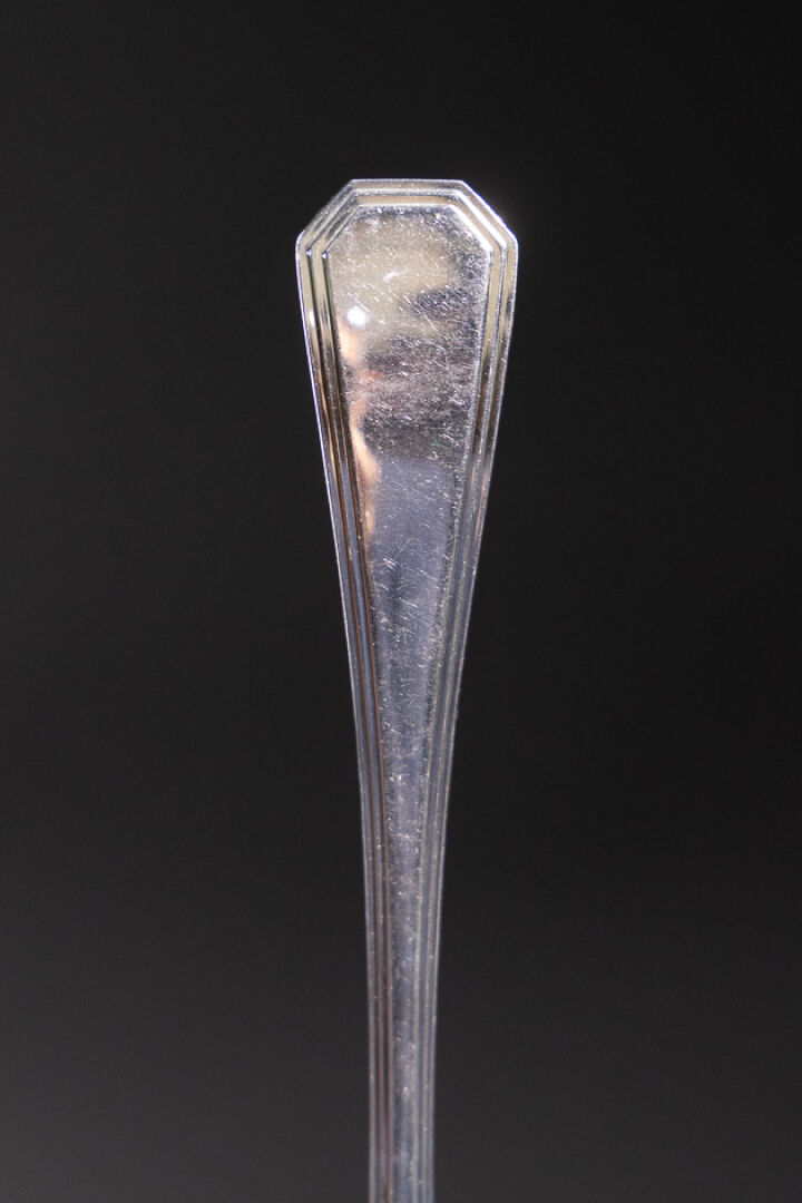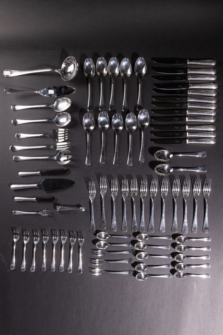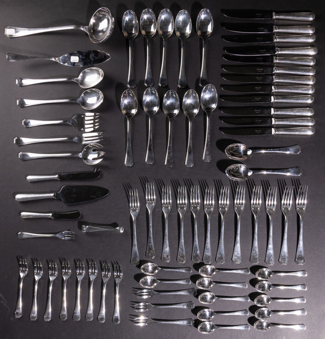 Maison CHRISTOFLE. Ménagère en métal argenté modèle AMERICA comprenant : - Douze grands couverts ; - Douze grands couteaux ; - Douze cuillères à dessert ; - Douze fourchettes à gâteau ; - Louche ; - Couteau à fromage ; - Pelle à tarte ; - Couteau à beurre ; - Pince à sucre ; - Couverts de service ; - Couverts à salade ; - Couverts à poissons. Le modèle America a été crée en 1935 par Luc LANEL, pour la Maison CRISTOFLE.