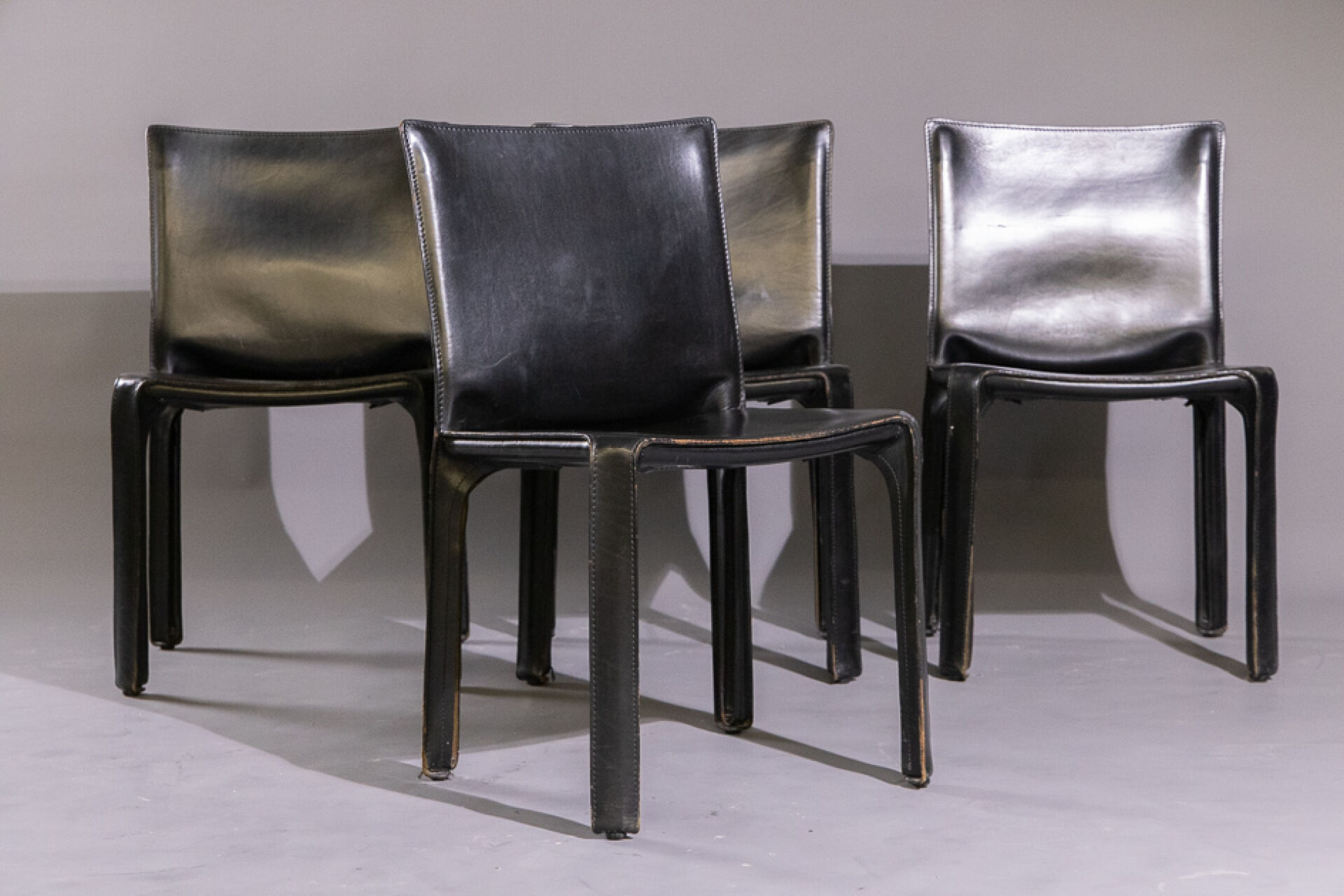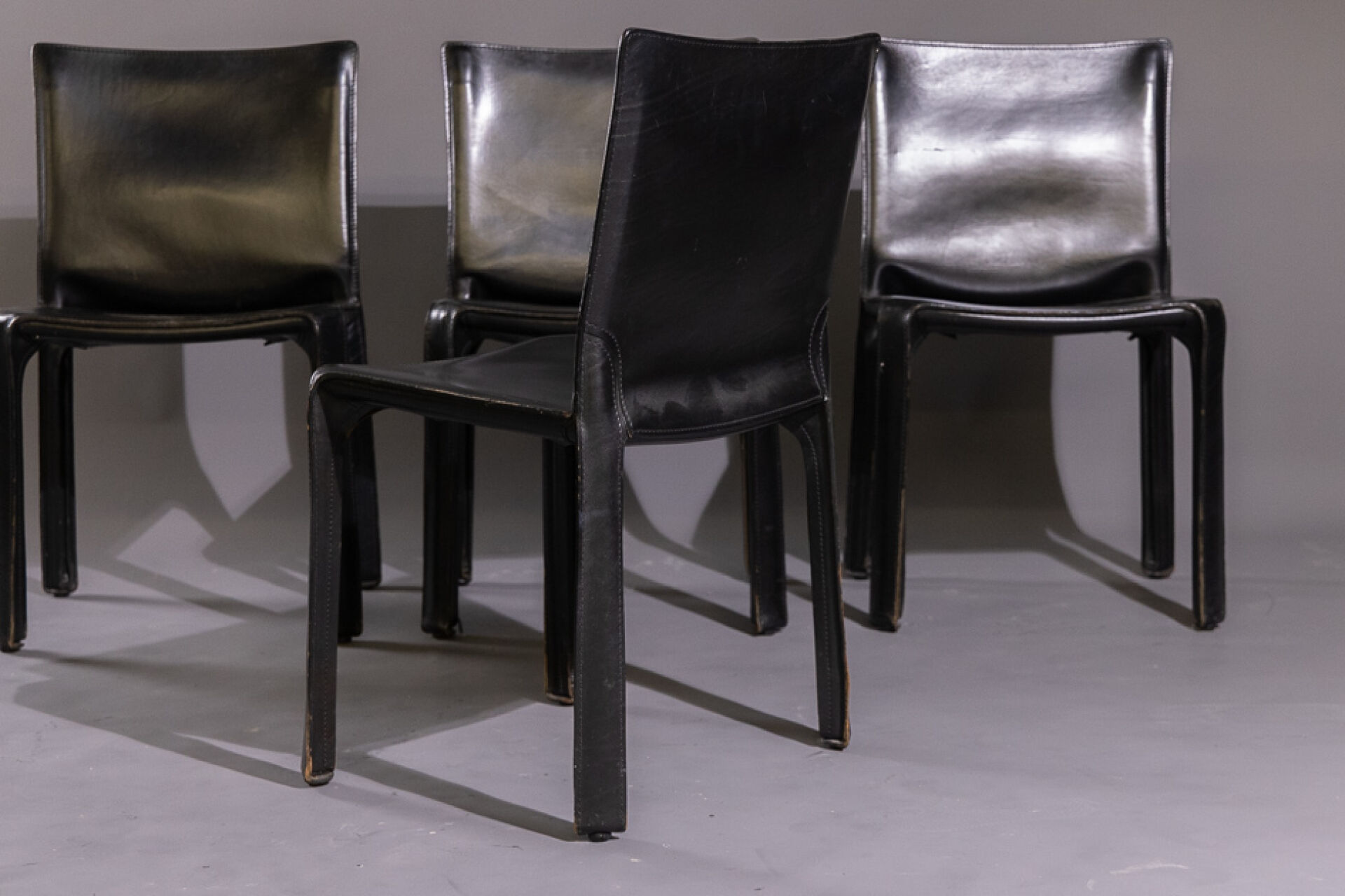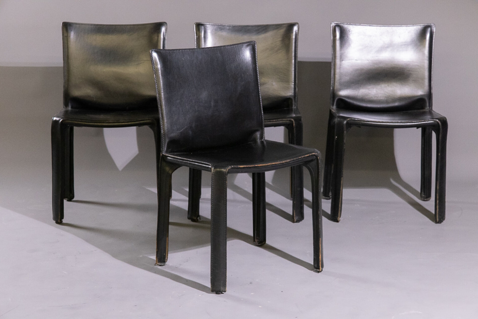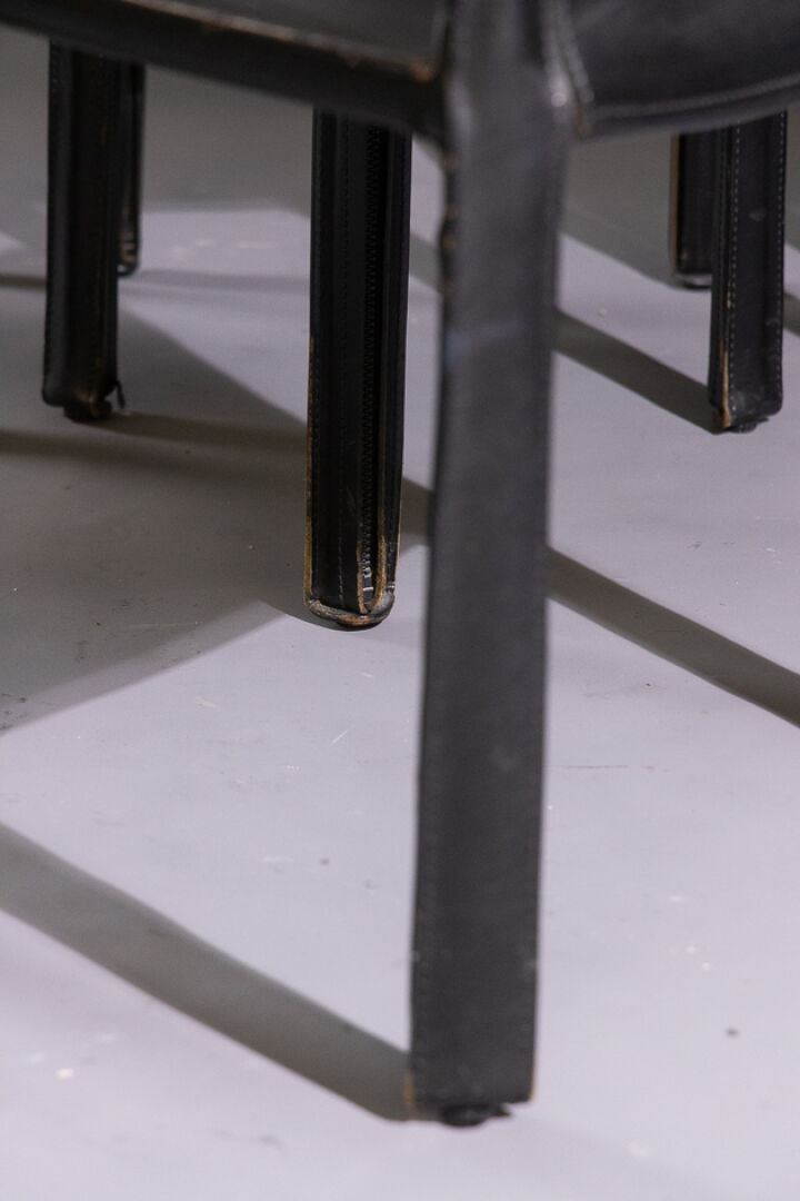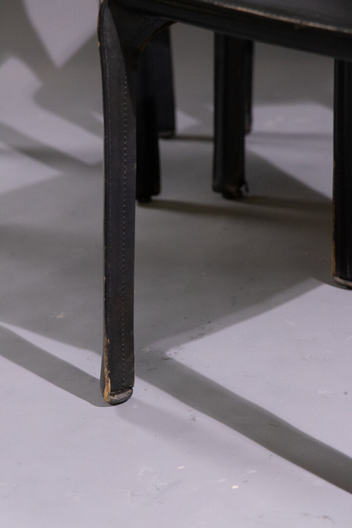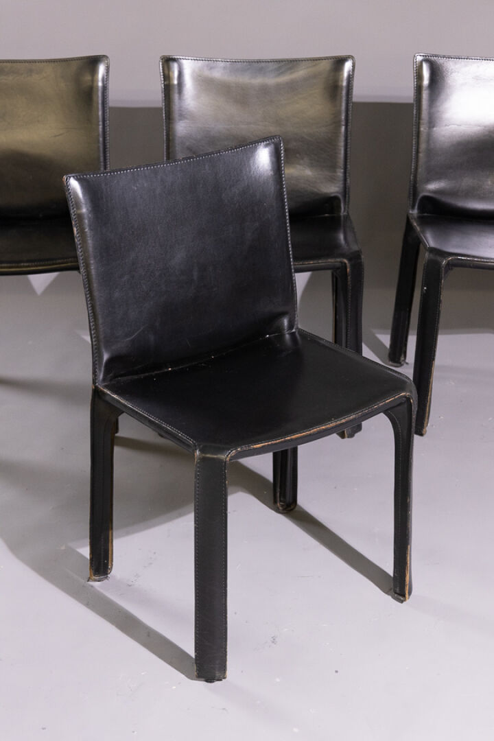 Mario BELLINI (né en 1935) pour les éditions CASSINA. Suite de quatre chaises en cuir noir modèle 412 CAB créé en 1977 (petits accidents d'usage). Haut. : 82 cm - Larg. : 57 cm - Prof. : 47 cm