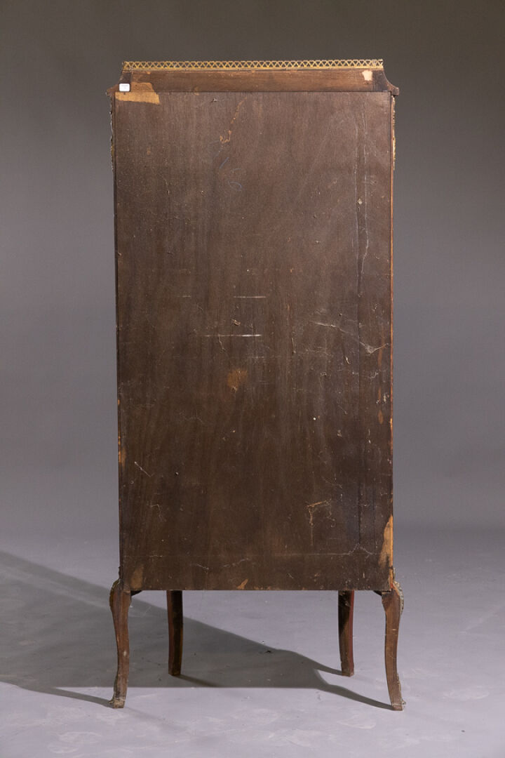 Vitrine bombée en bois de placage à décor peint en partie basse de scènes galantes et paysages. Elle ouvre à une porte, plateau à galerie de laiton cordiforme (chocs). Style Louis XV. Haut. : 148 cm - Larg. : 65 cm - Prof. : 33 cm
