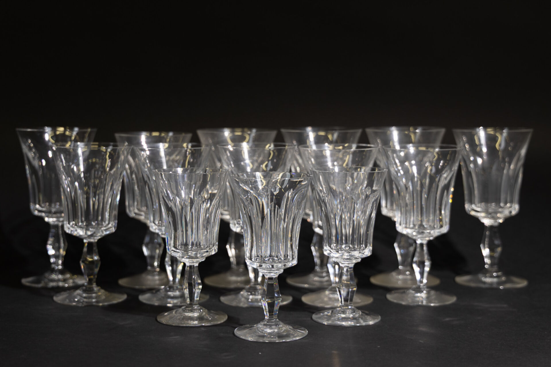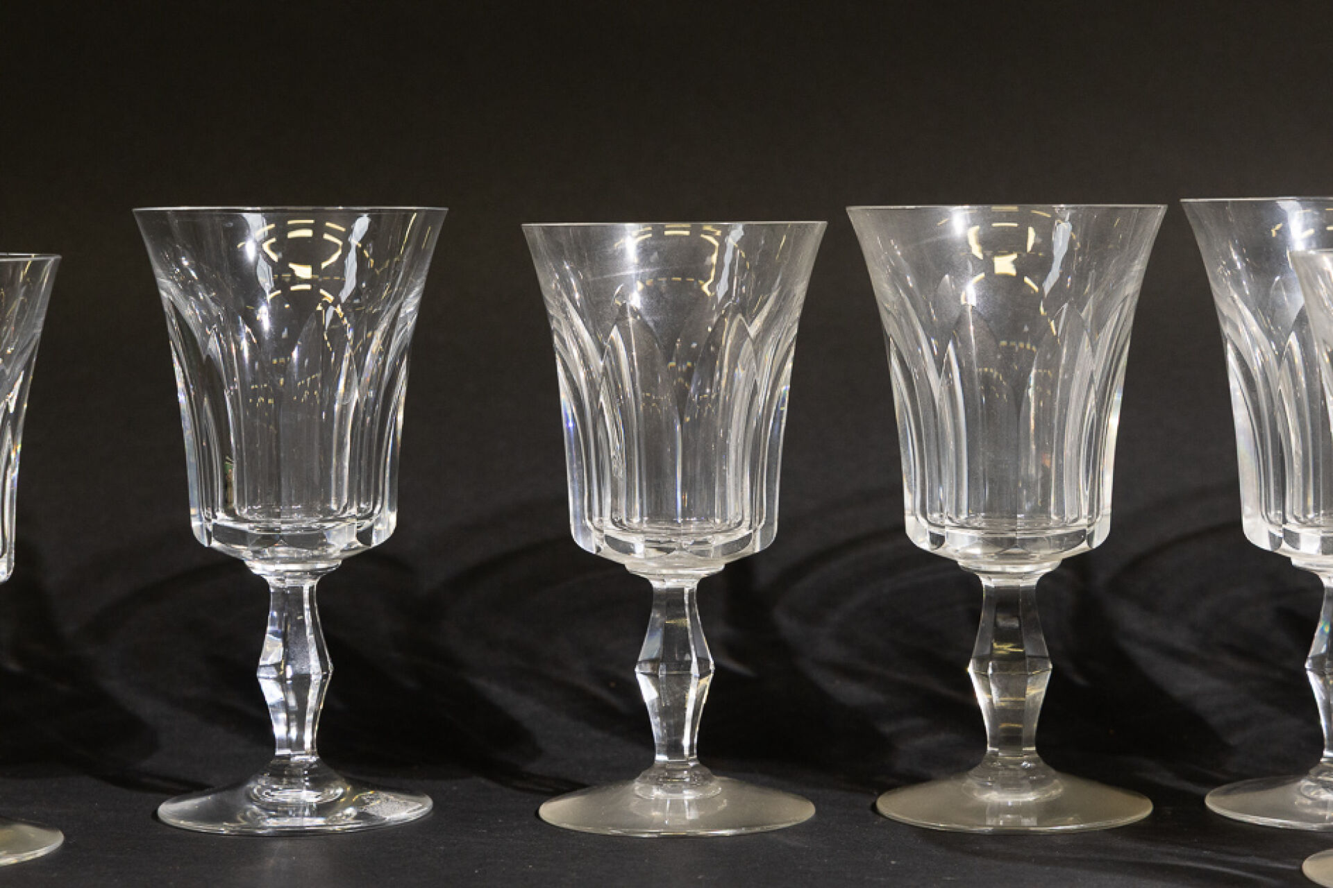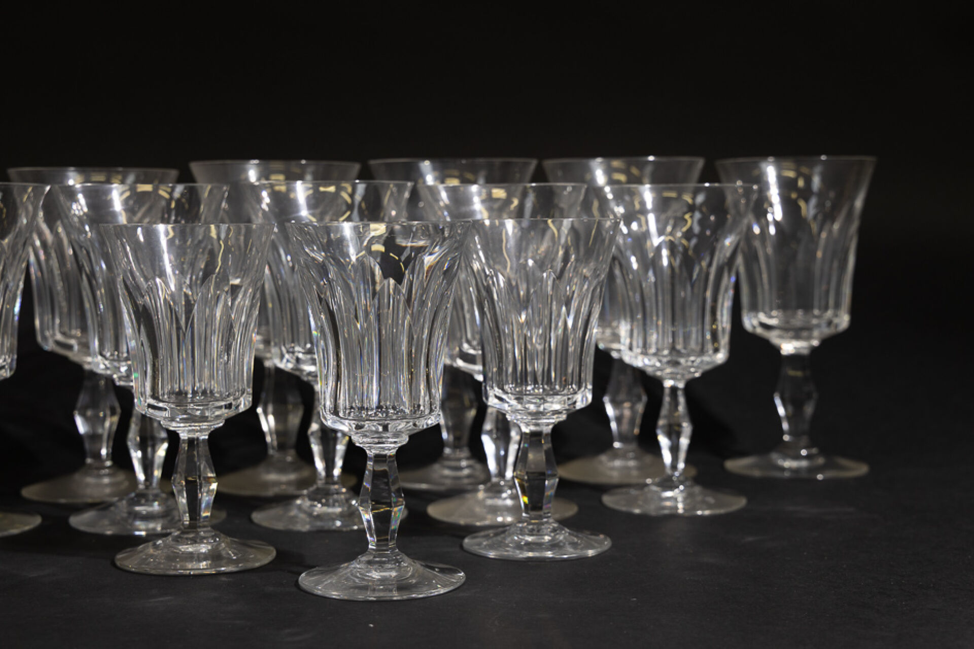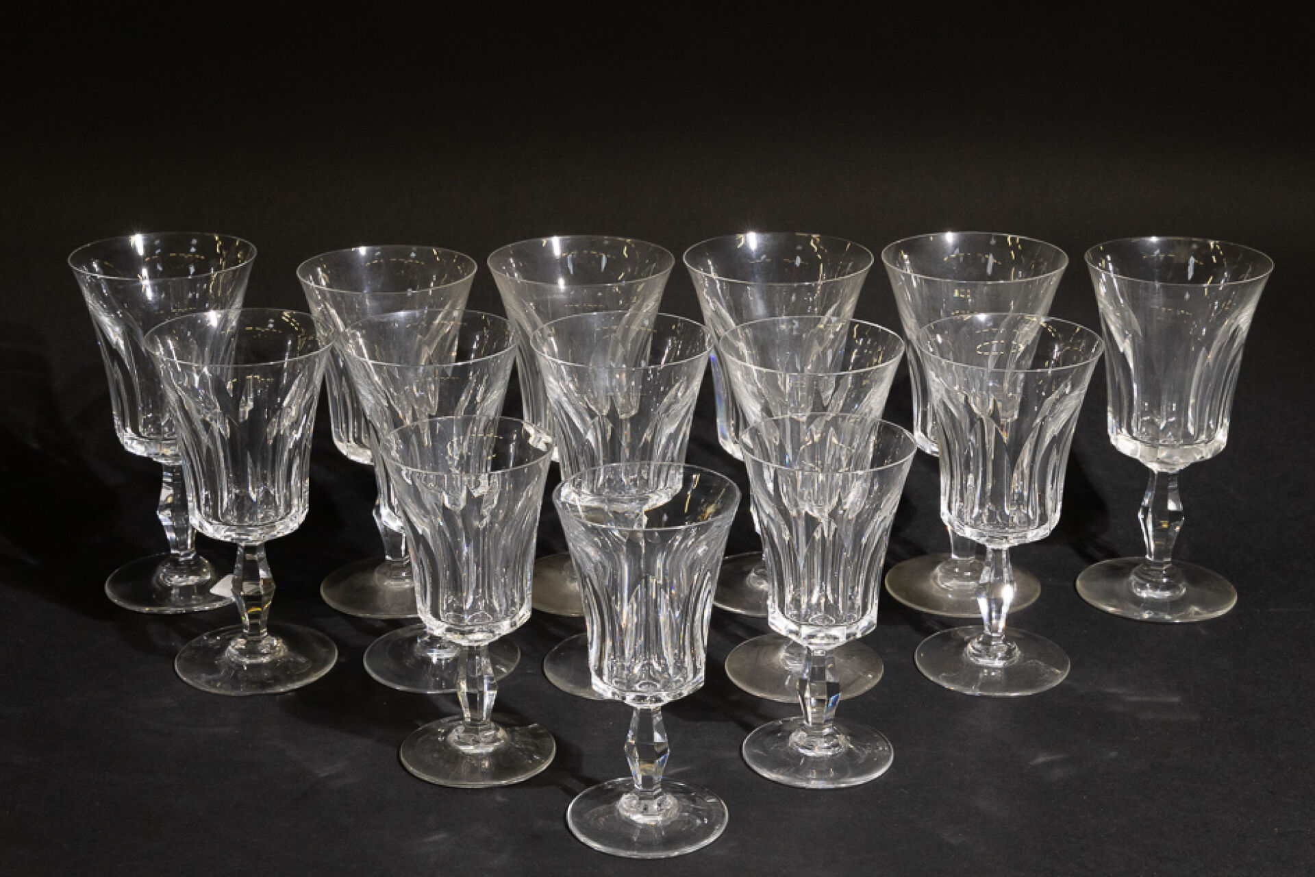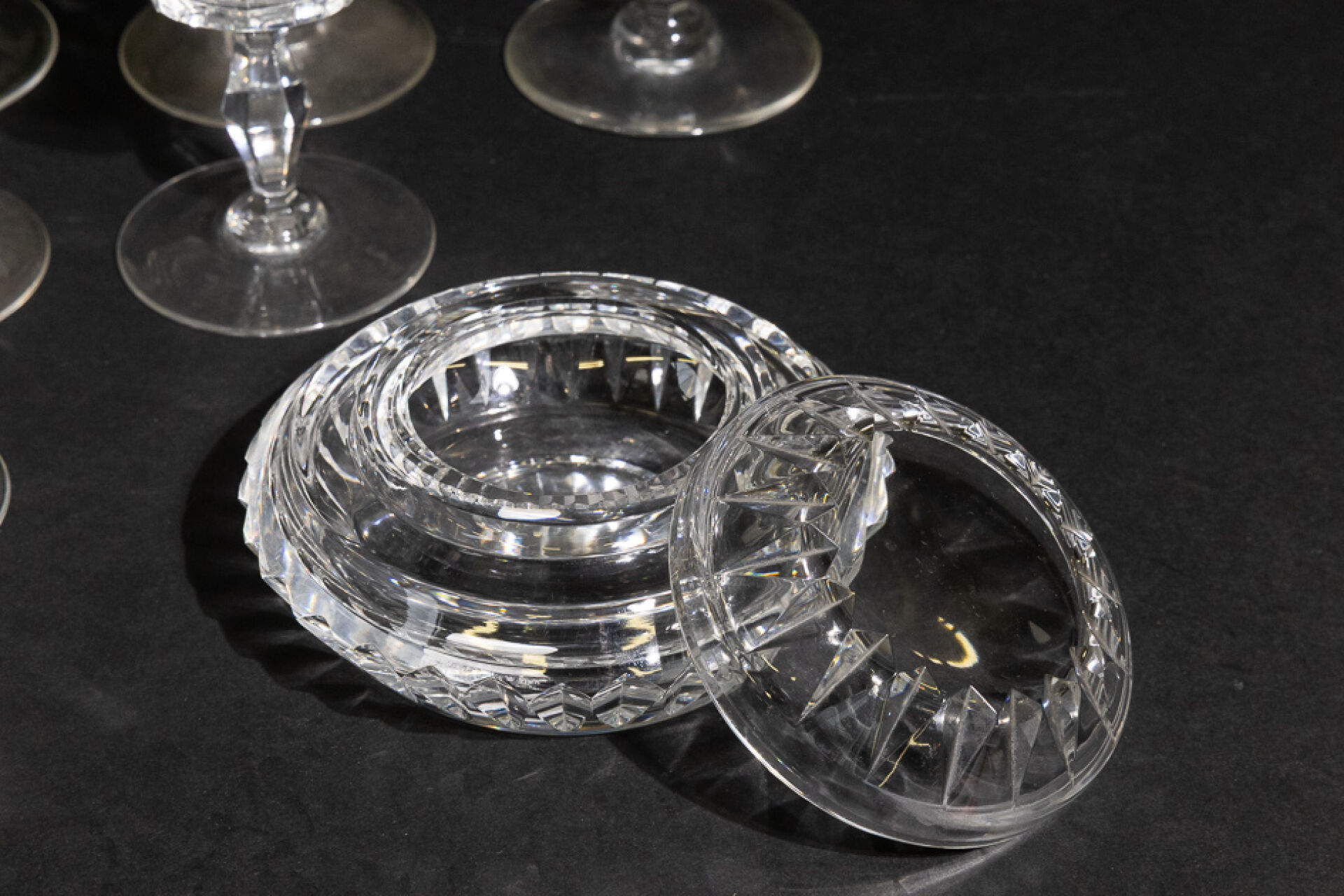 Maison BACCARAT. Partie de service de verres modèle "Polignac" en cristal taillé comprenant : - 6 verres à eau (1 légèrement plus bas), Haut. : 17,5 cm; - 5 verres à vin rouge, Haut. : 16,5 cm; - 3 verres à vin blanc, Haut. : 14,5 cm; - 1 pichet, Haut. : 23 cm. On joint : Maison BACCARAT, une bonbonnière en cristal taillé. Haut. : 6,5 cm - Diam. : 13 cm