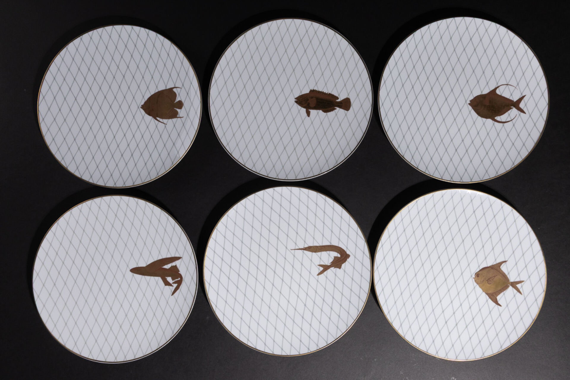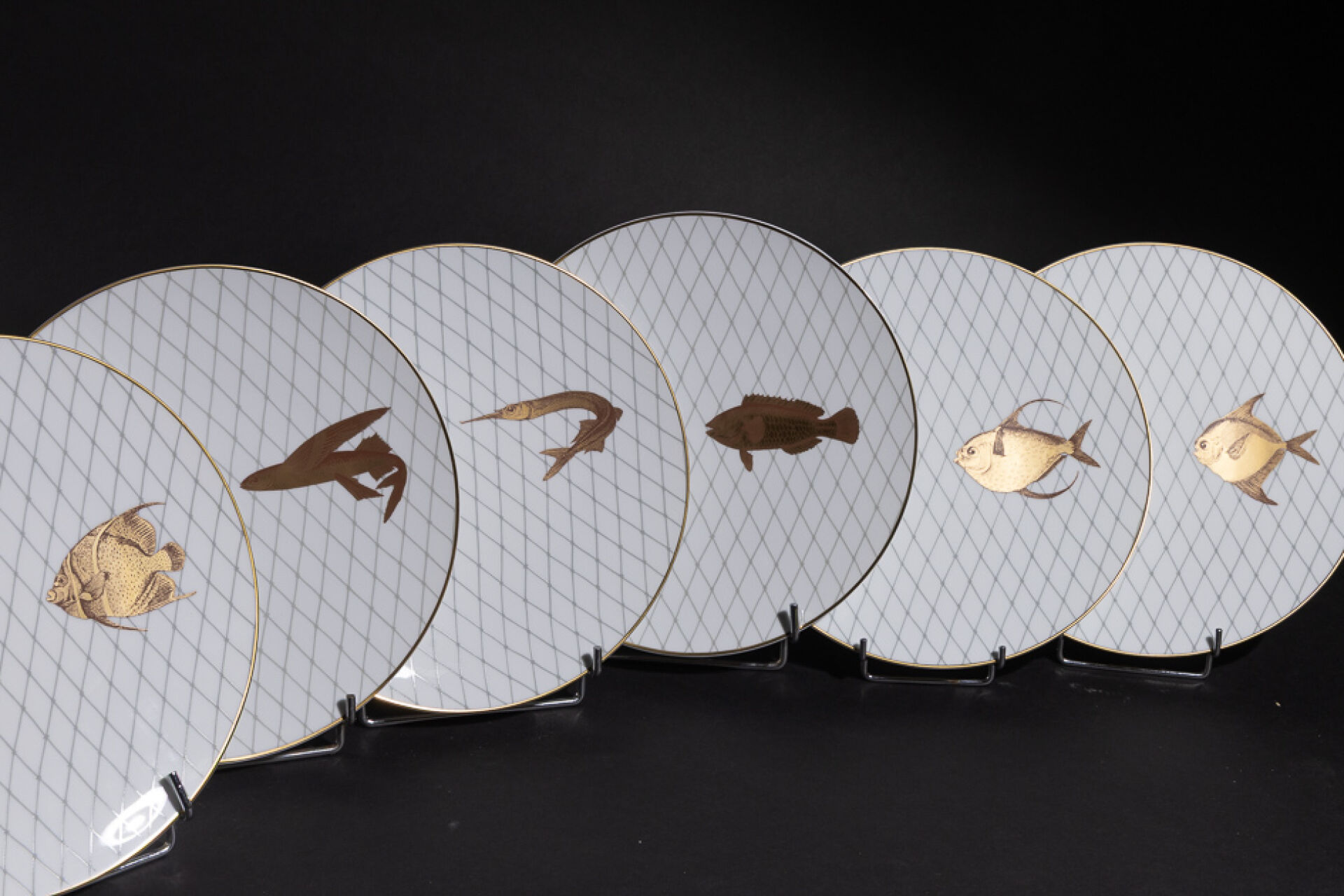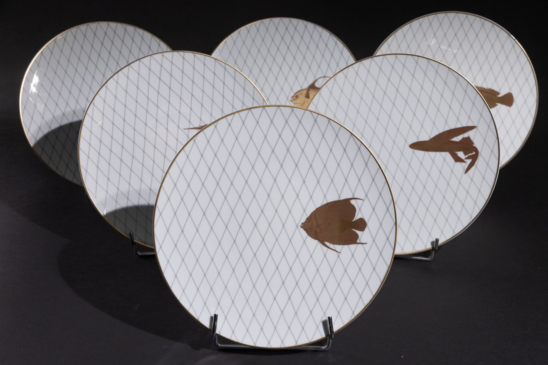 Jacques BERNARDAUD pour la Maison BERNARDAUD à Limoges Suite de six assiettes circulaires en porcelaine modèle " Les poissons d'or " à motifs polychrome et or de Poissons. Boîte. Vers 1955. Diam. : 26 cm