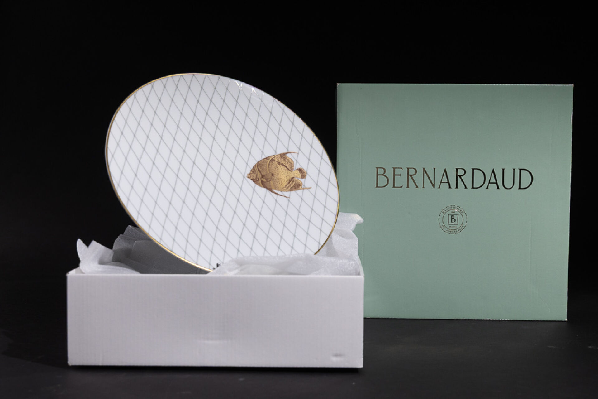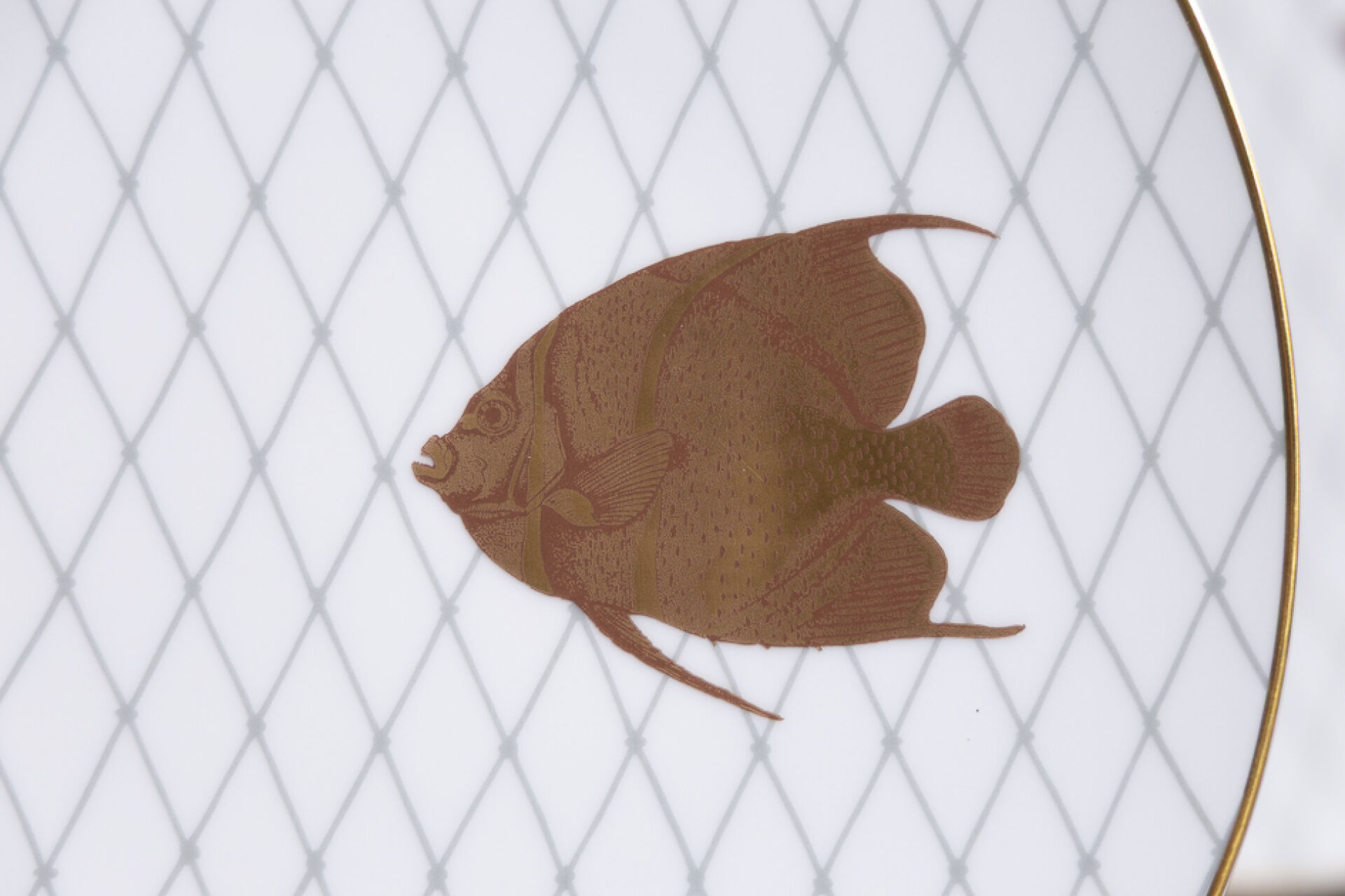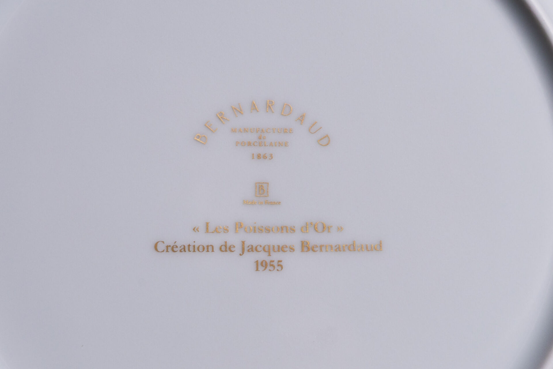 Jacques BERNARDAUD pour la Maison BERNARDAUD à Limoges Suite de six assiettes circulaires en porcelaine modèle " Les poissons d'or " à motifs polychrome et or de Poissons. Boîte. Vers 1955. Diam. : 26 cm