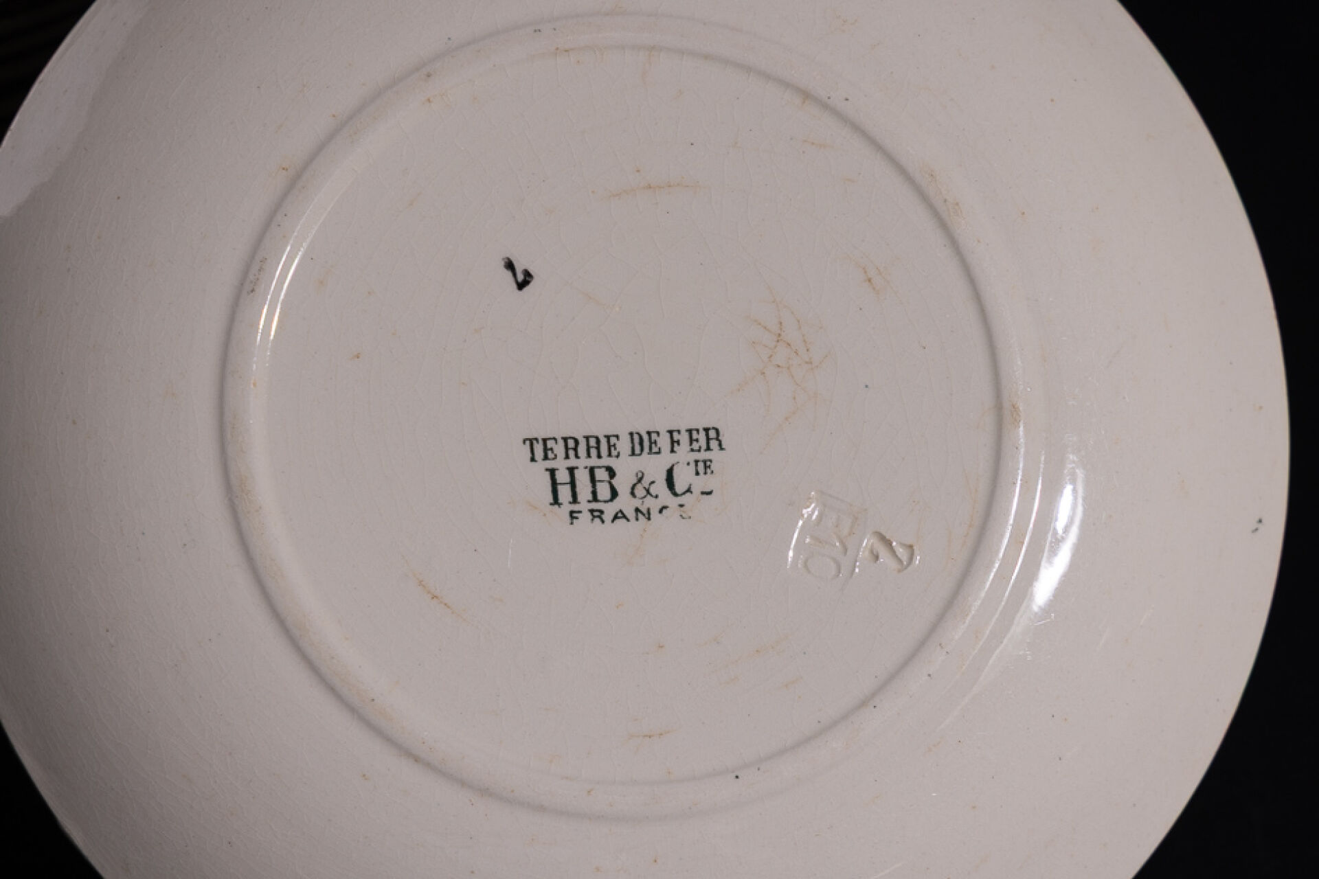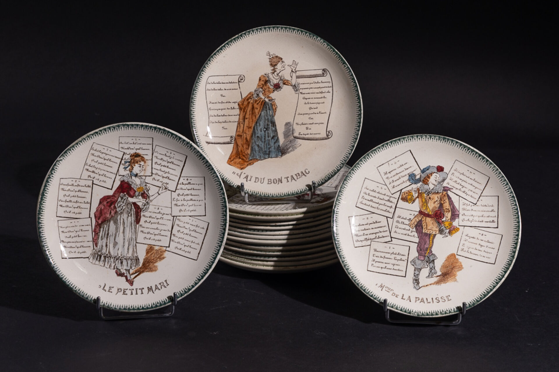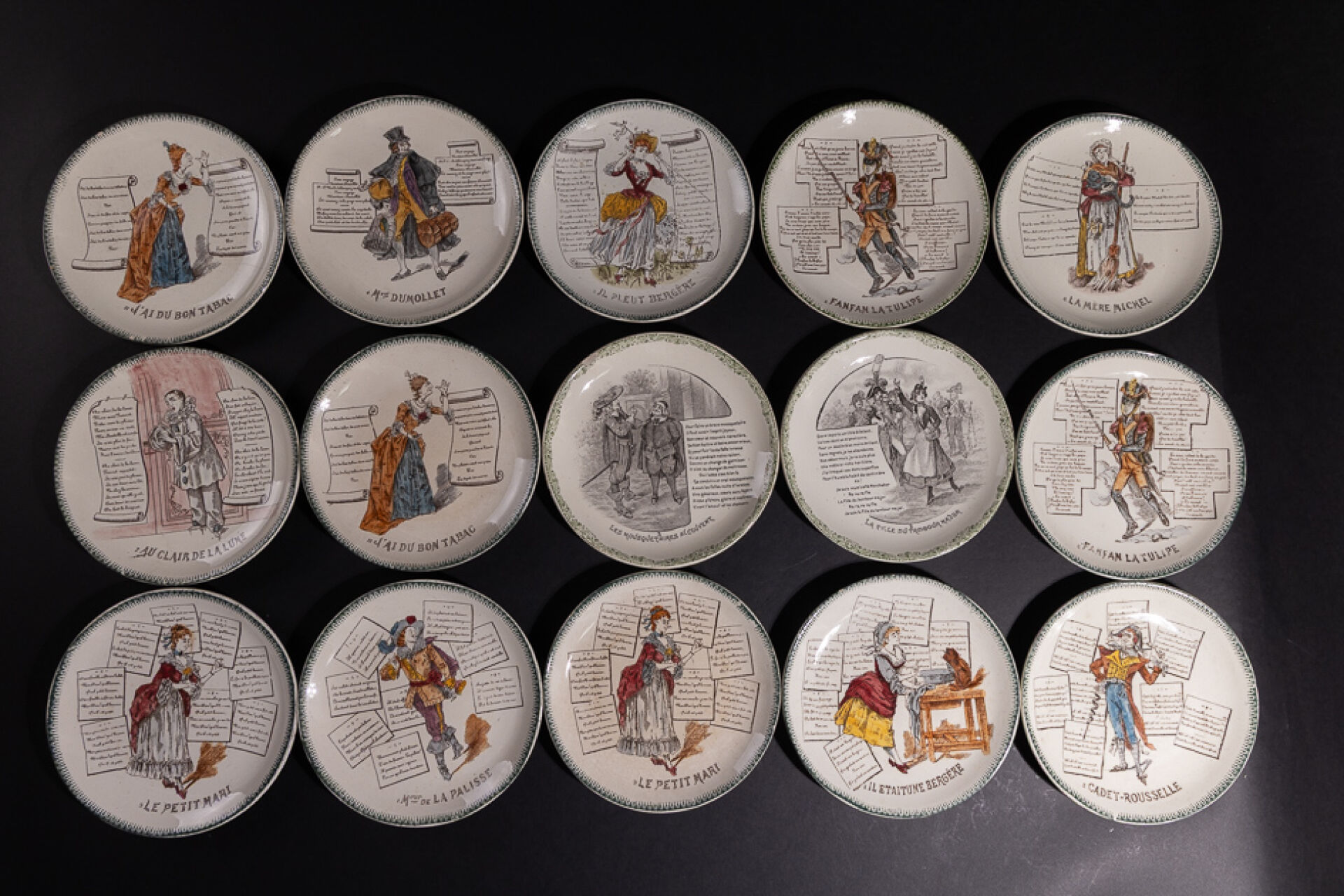 Manufacture Choisy le Roi - Hautin Boulenger & Cie France. Ensemble de treize assiettes en faïence terre de feu à décor décalcomanié des comptines célèbres telles que la Mère Michelle, Au clair de la Lune, Il pleut Bergère, Fanfan la Tulipe (J'ai du bon tabac, Fanfan la Tulipe, Le petit Mari en double). Marquées au revers. Diam. : 20 cm On joint : Manufacture Choisy le Roi - Hautin Boulenger & Cie France. Deux assiettes figurant la fille du Tambour Major et Les Mousquetaires au Couvent (éclats). Diam. : 20 cm