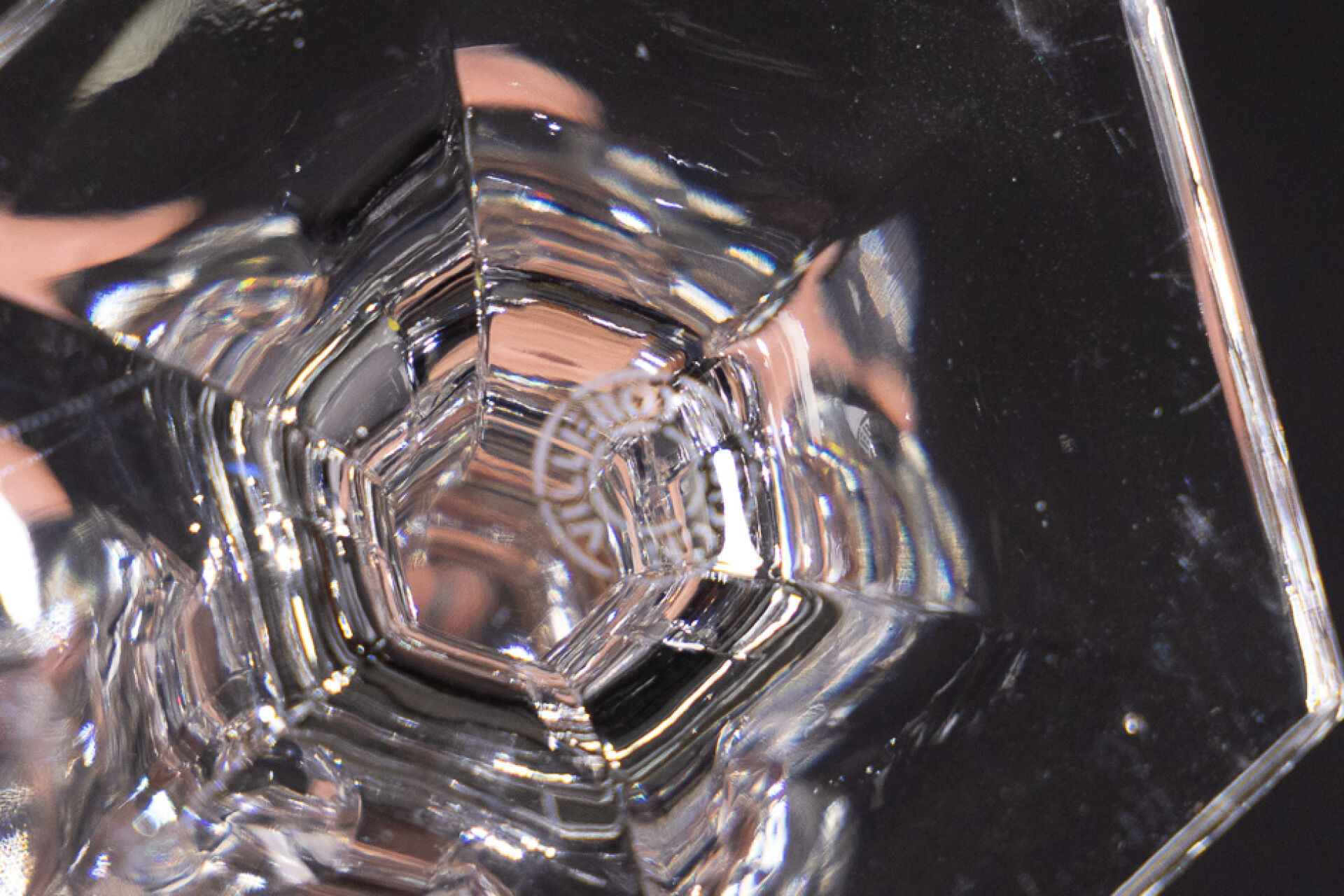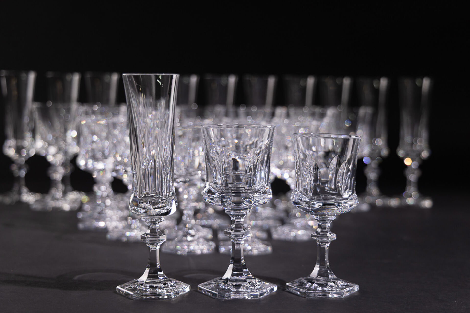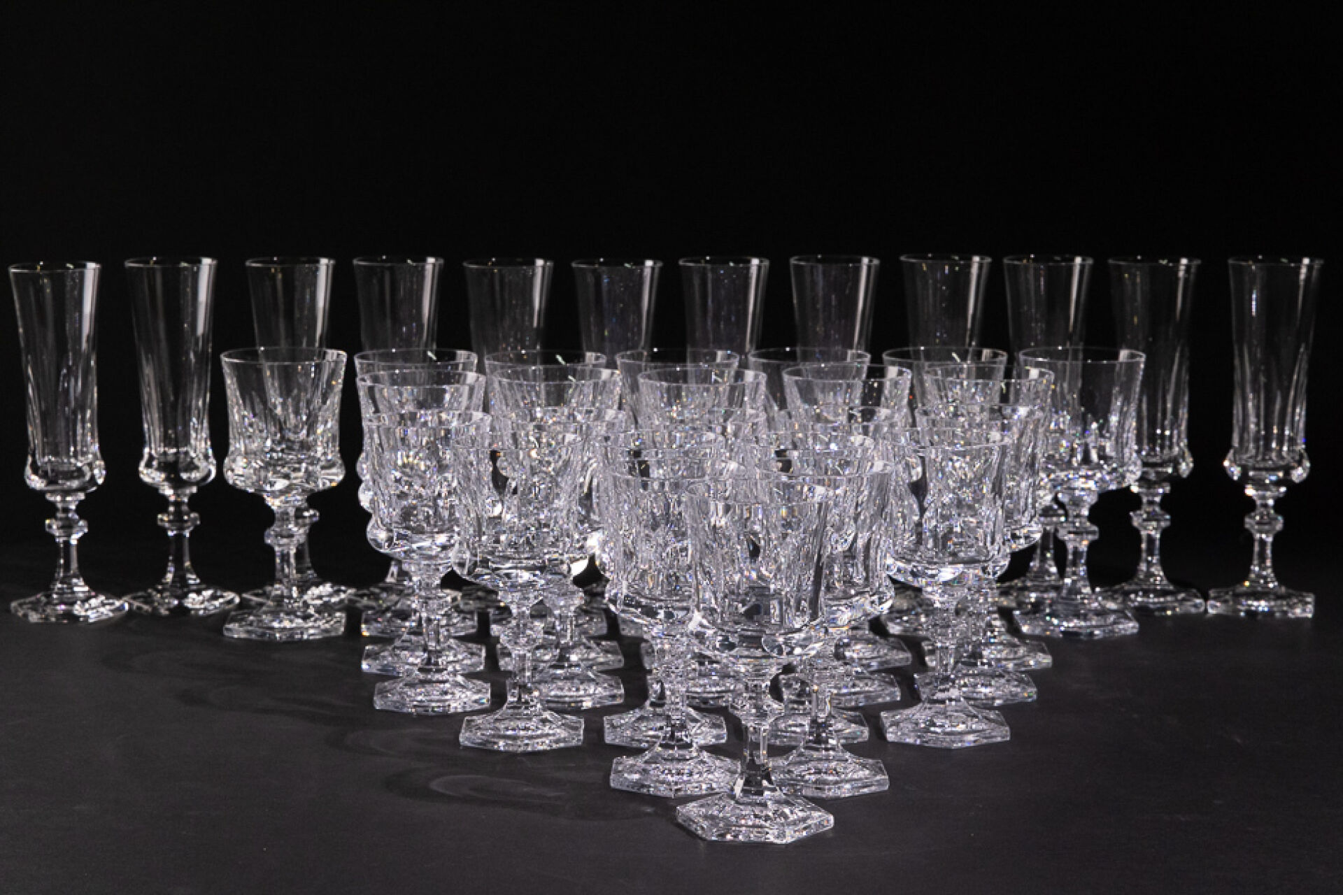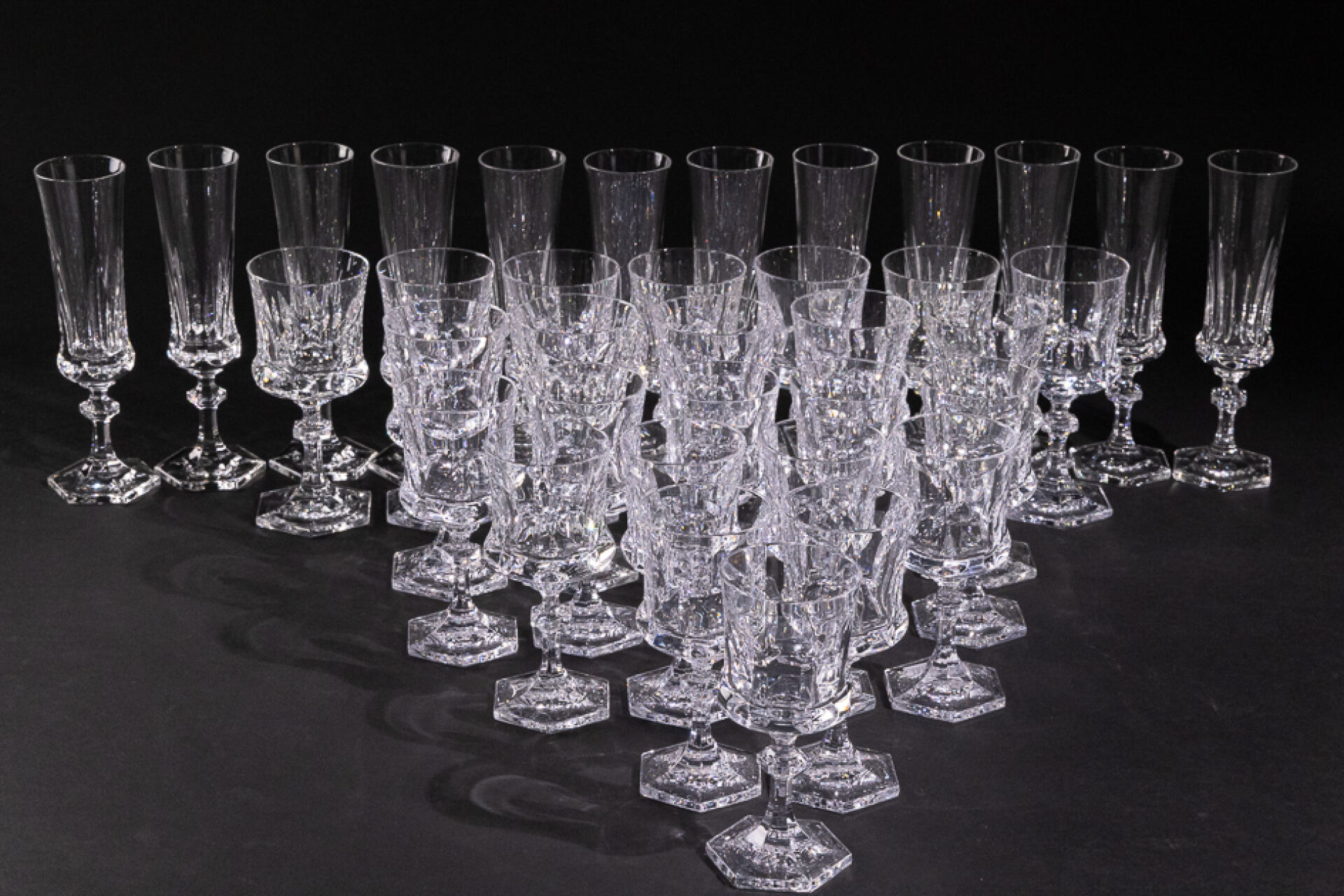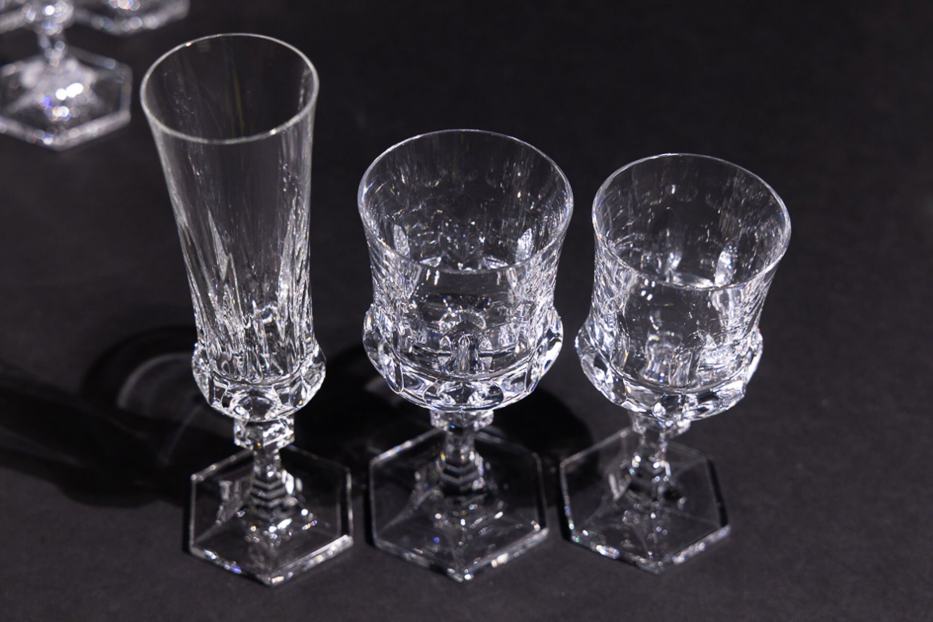 Cristallerie VILLEROY & BOCH. Partie de service de verres à pied en cristal, la jambe ornée d'un nœud, le pied hexagonal, tampon au revers, comprenant : - Douze flûtes à Champagne, Haut. : 20 cm; - Douze verres à vin, Haut. : 14 cm; - Douze verres à eau, Haut. : 15,3 cm (égrenure et éclat à l'un).