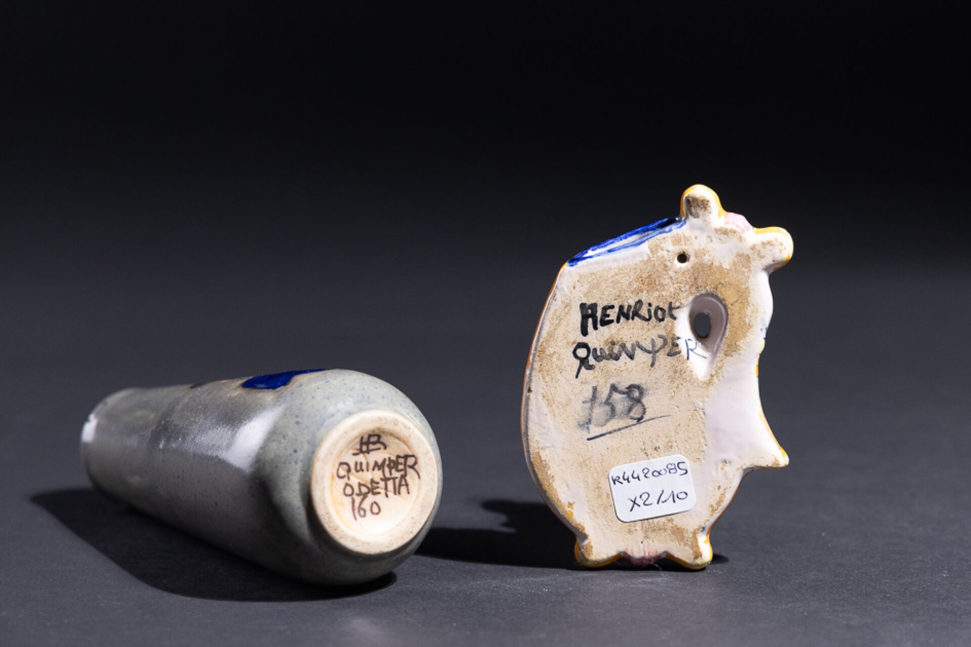 Manufacture ODETTA à QUIMPER. Petit vase tronconique en faïence à décor polychrome de breton de profil (accidents). Signé et numéroté 160. Haut. : 14 cm On joint : Manufacture HENRIOT à QUIMPER. Soliflore d'applique en faïence polychrome en forme de biniou à décor d'une fileuse. Haut. : 10,5 cm