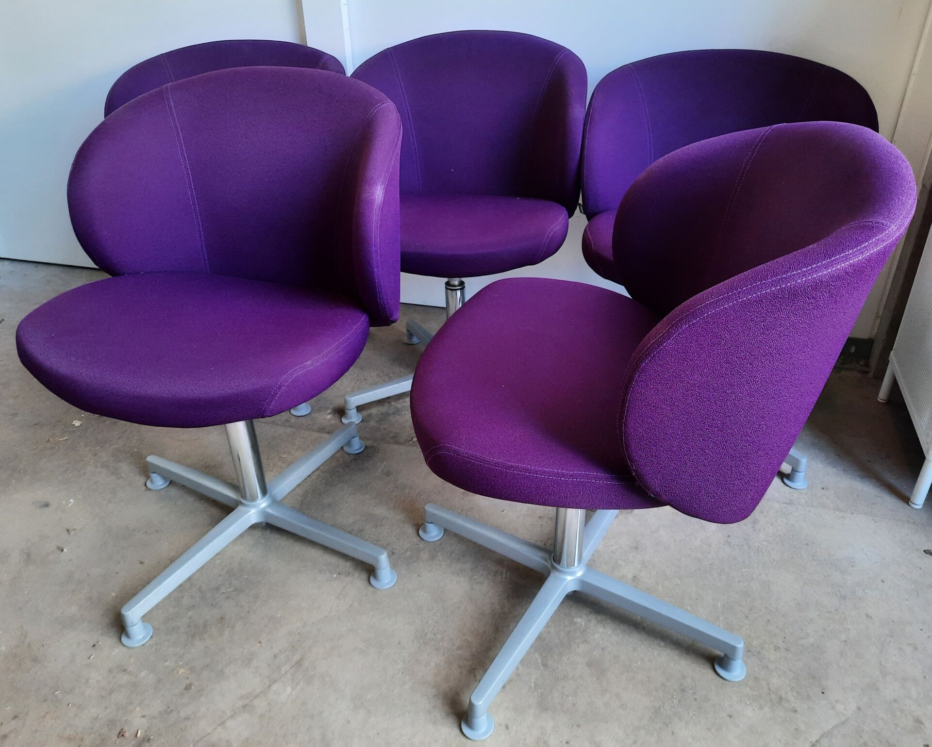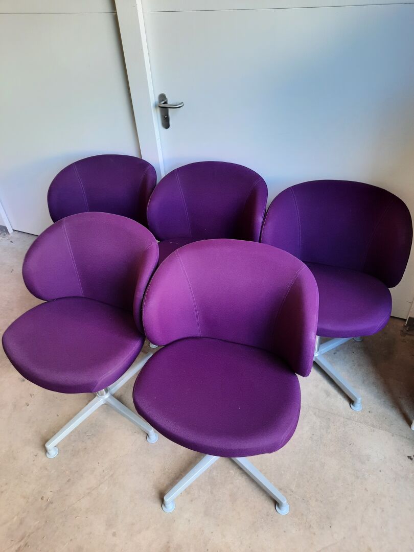 Suite de cinq chaises EUROSIT en tissu aubergine et piètement métal laqué gris, tournant Haut. : 83 cm - Larg. : 65 cm - Prof. : 65 cm